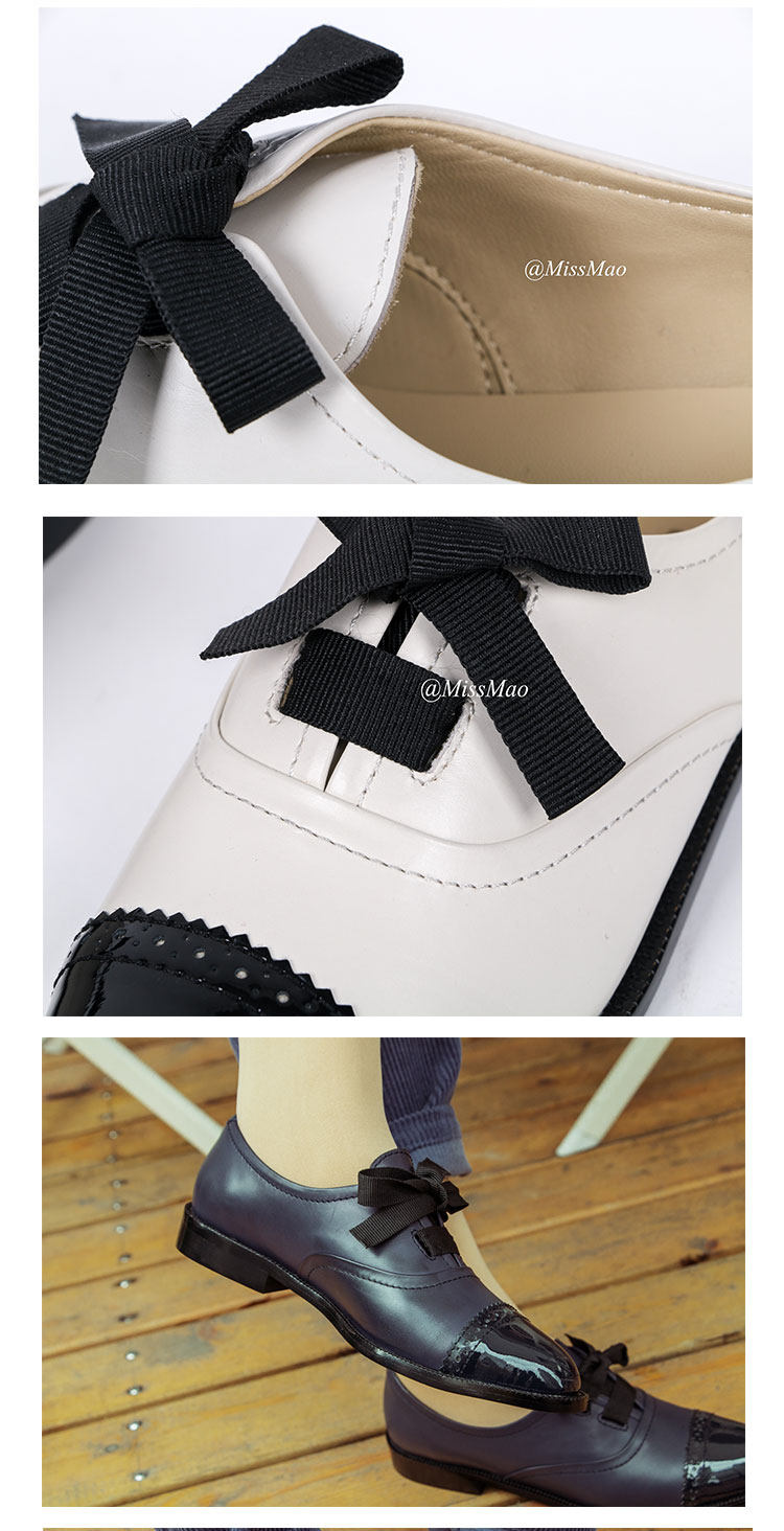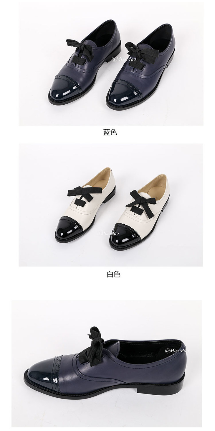 【à perles特价】时尚布洛克学院风平跟休闲系带黑白拼接藏蓝黑色春季轻松小圆头平跟鞋【清仓,不退不换】