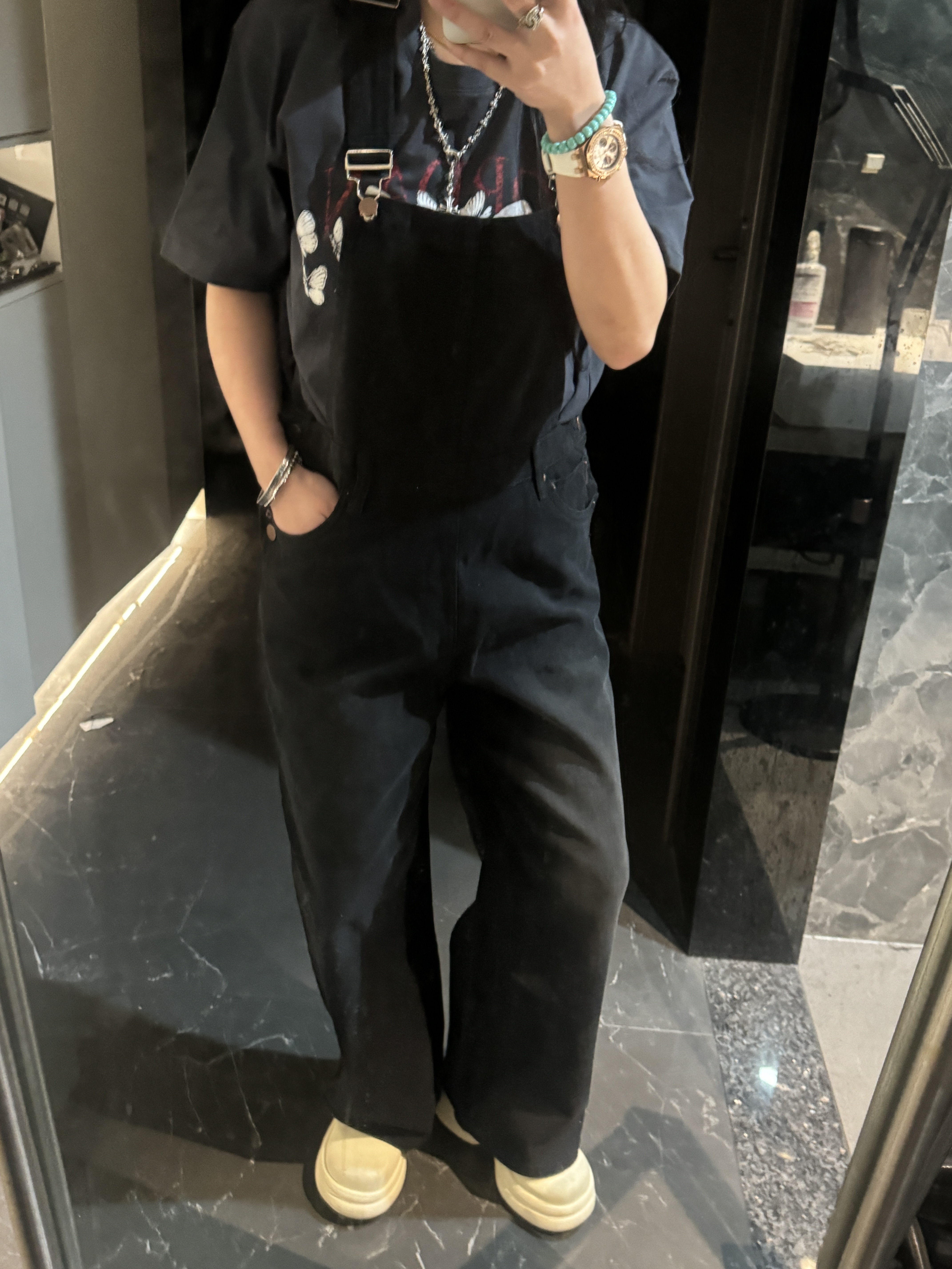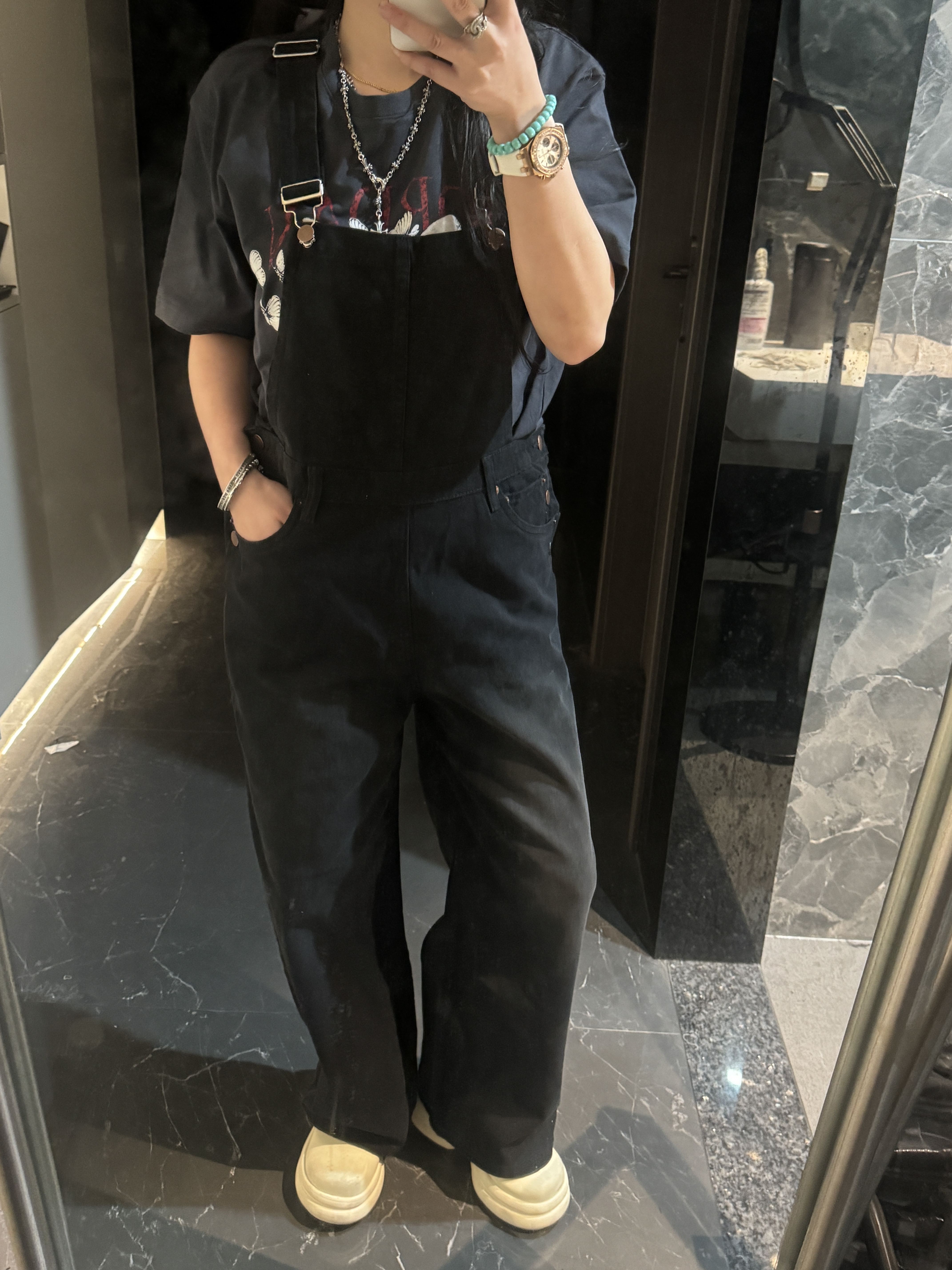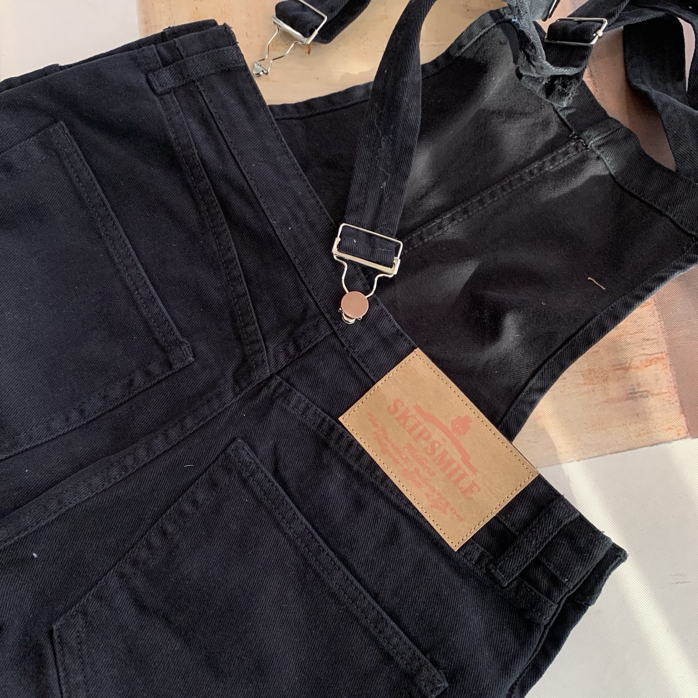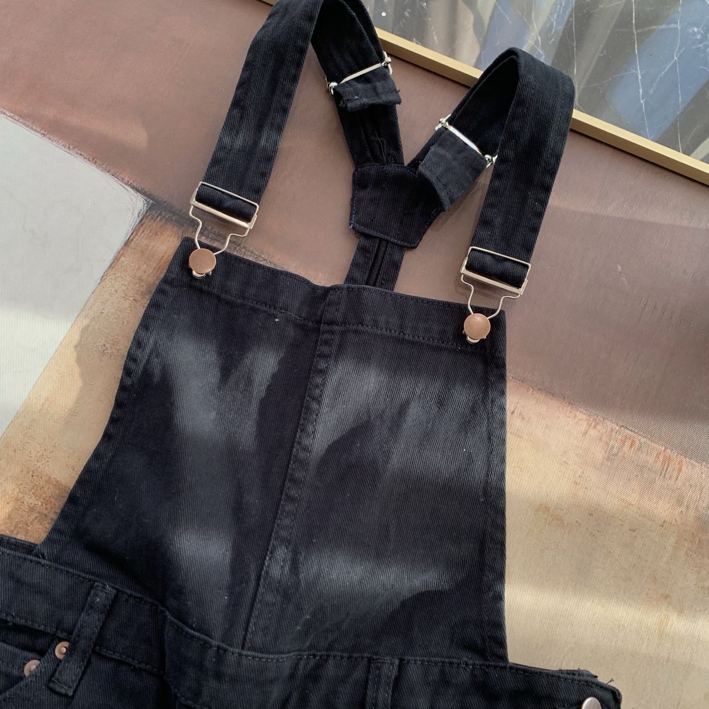 外单品牌纯原单!!‼️男女同款黑色宽松牛仔背带裤👖 整体为纯黑色牛仔材质,背带采用可调节金属扣设计,兼具实用性与复古感;裤身有铜色金属纽扣装饰口袋。细节处彰显工装风格,是复古风与街头风结合的穿搭单品。属于直阔腿版型,对各种腿型包容性较好😎;背带的金属扣可根据身高调整长度,适应不同身形需求,口袋的纽扣设计不仅是装饰,也提升了口袋的实用性。