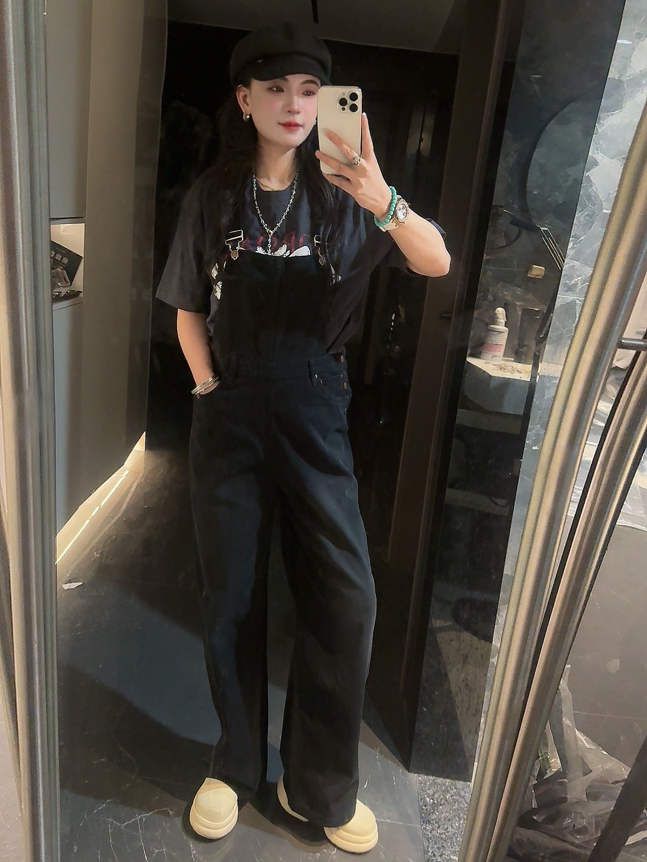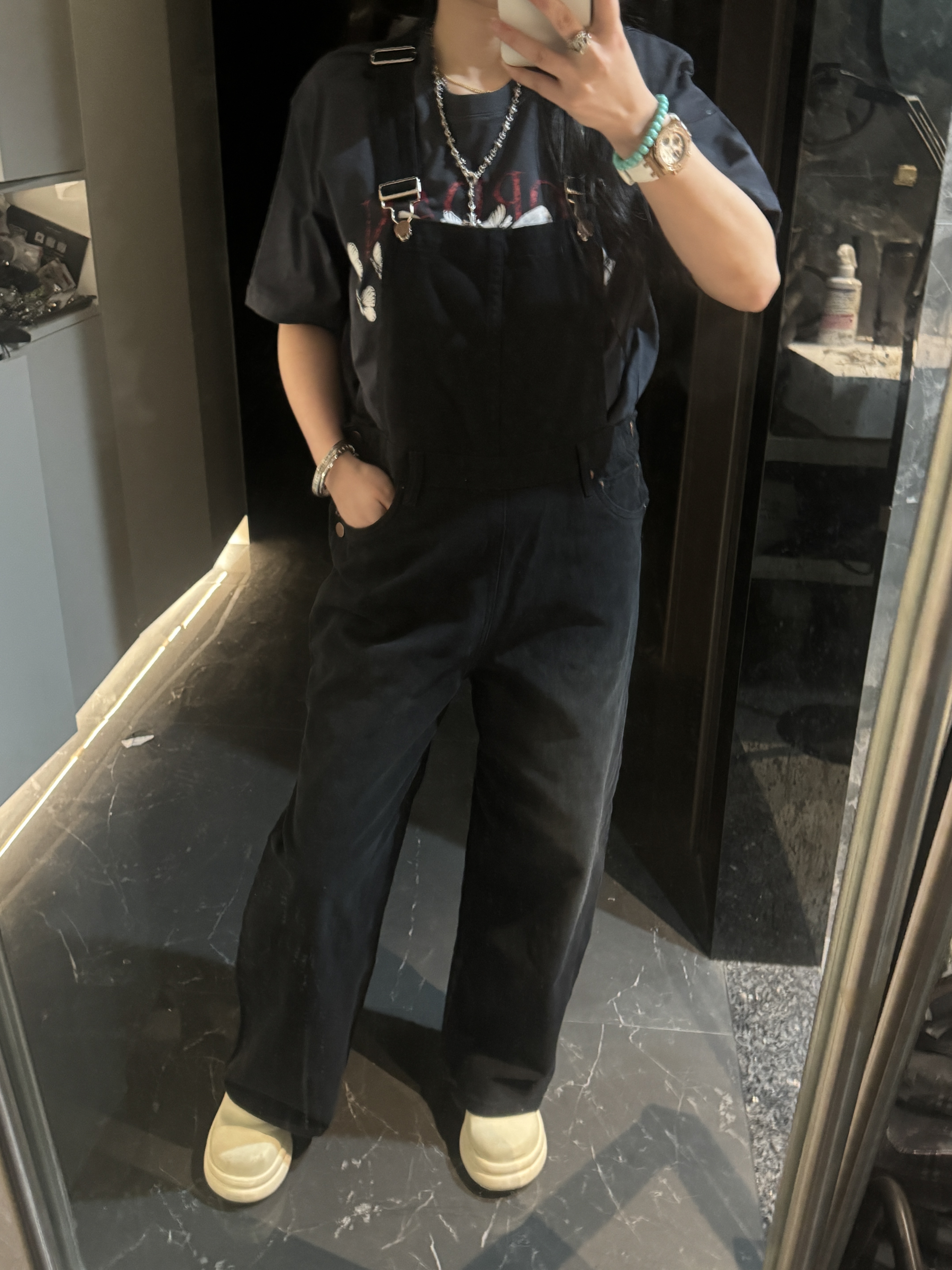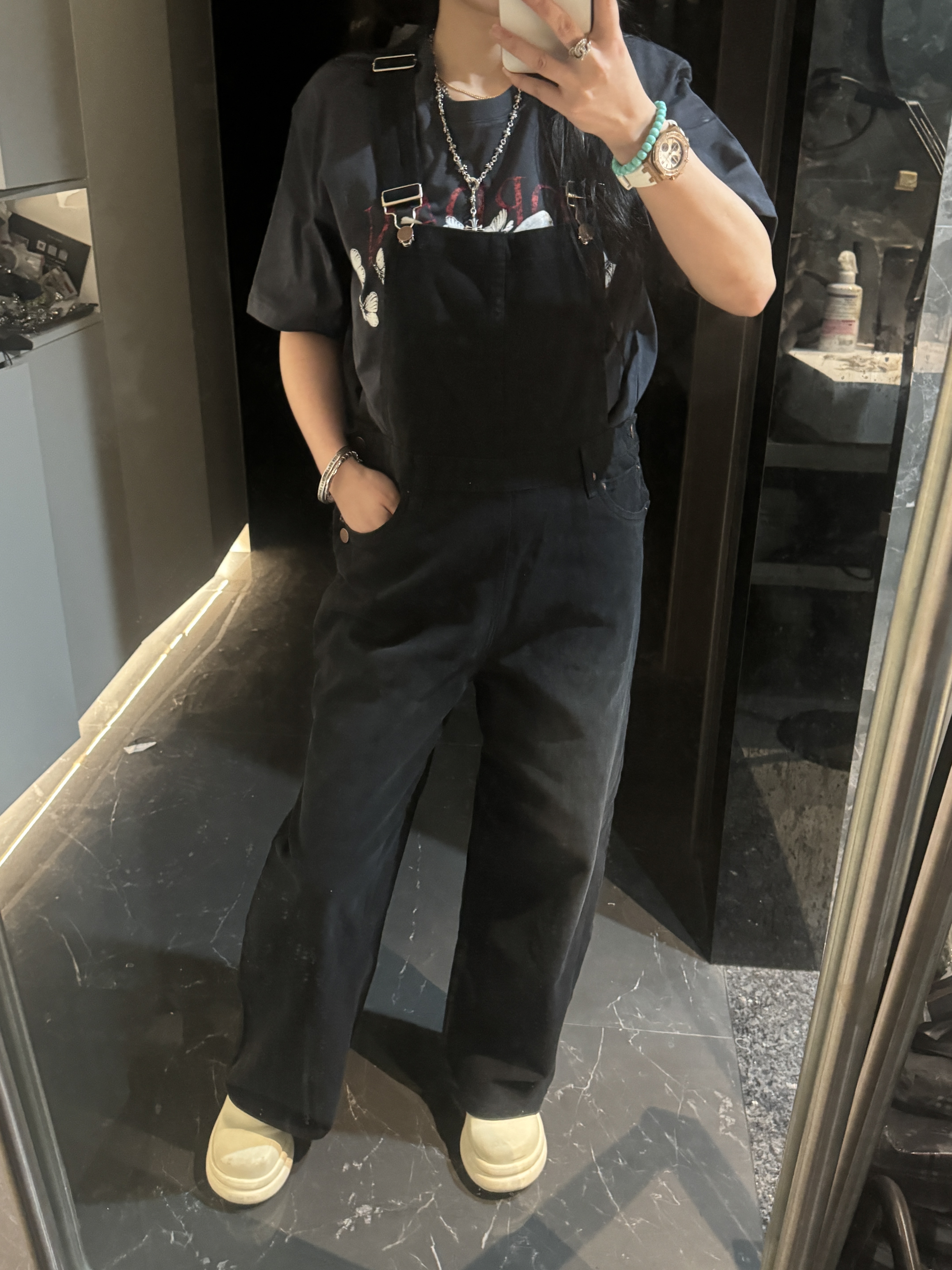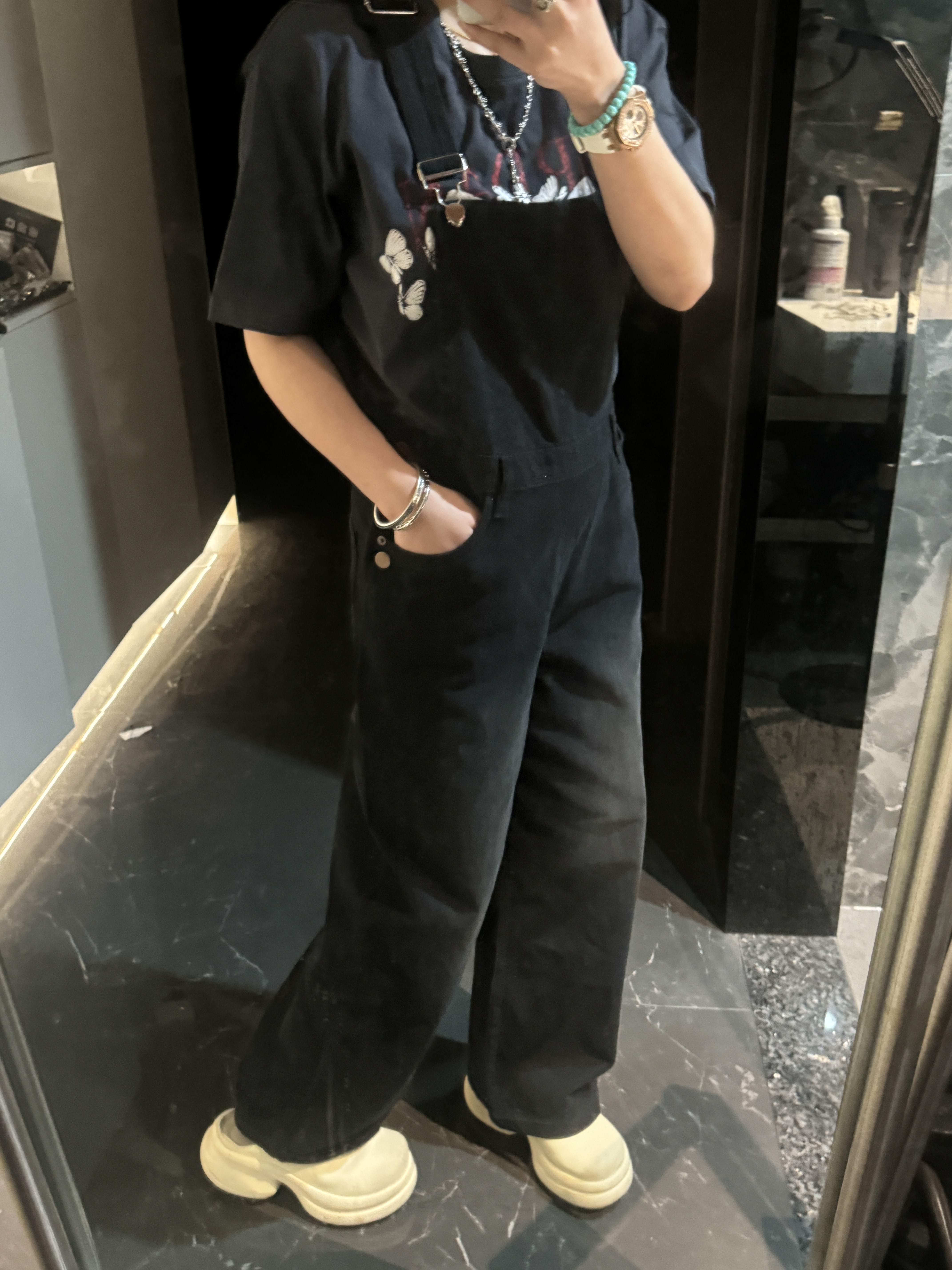 外单品牌纯原单!!‼️男女同款黑色宽松牛仔背带裤👖 整体为纯黑色牛仔材质,背带采用可调节金属扣设计,兼具实用性与复古感;裤身有铜色金属纽扣装饰口袋。细节处彰显工装风格,是复古风与街头风结合的穿搭单品。属于直阔腿版型,对各种腿型包容性较好😎;背带的金属扣可根据身高调整长度,适应不同身形需求,口袋的纽扣设计不仅是装饰,也提升了口袋的实用性。