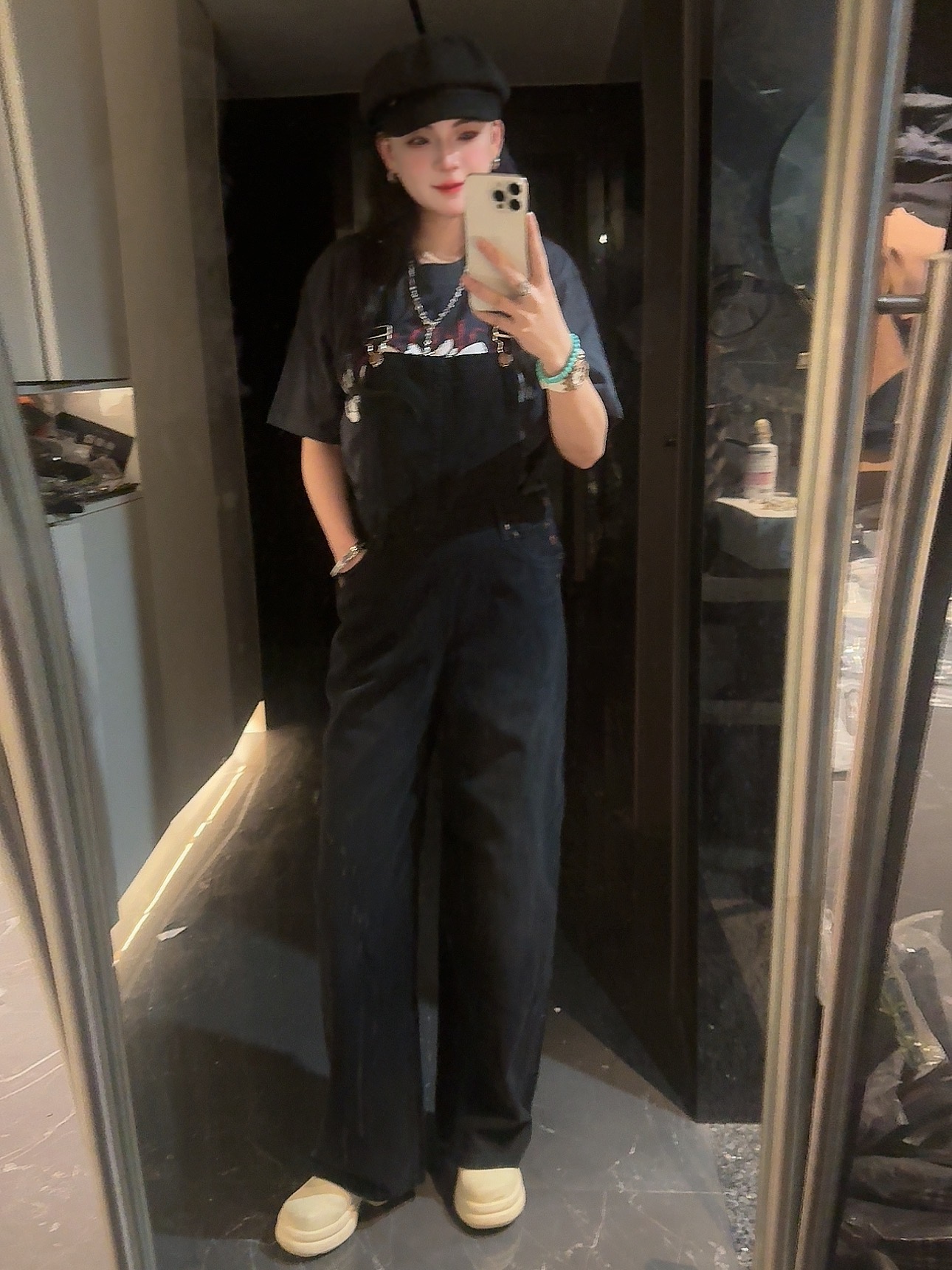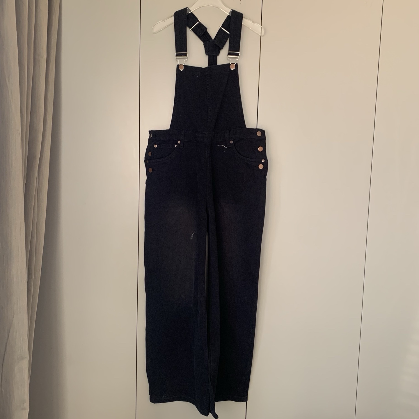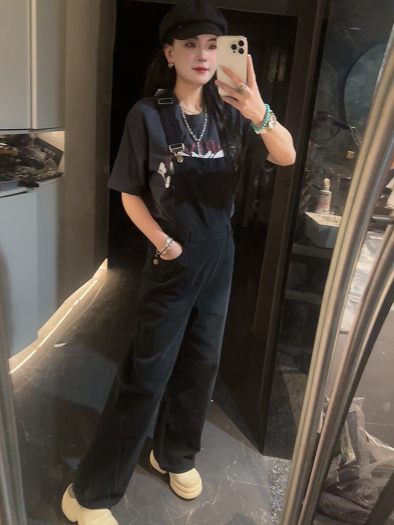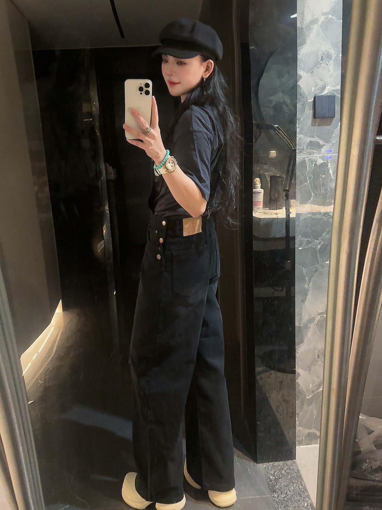 外单品牌纯原单!!‼️男女同款黑色宽松牛仔背带裤👖 整体为纯黑色牛仔材质,背带采用可调节金属扣设计,兼具实用性与复古感;裤身有铜色金属纽扣装饰口袋。细节处彰显工装风格,是复古风与街头风结合的穿搭单品。属于直阔腿版型,对各种腿型包容性较好😎;背带的金属扣可根据身高调整长度,适应不同身形需求,口袋的纽扣设计不仅是装饰,也提升了口袋的实用性。