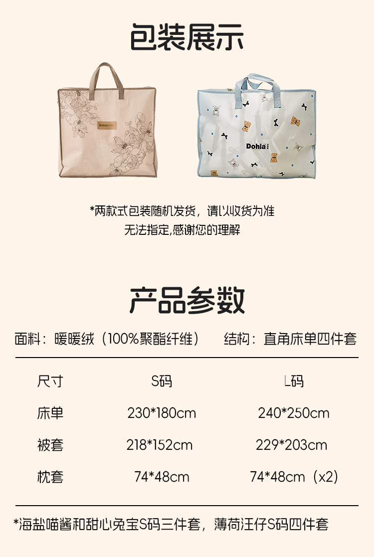 多喜爱 暖暖绒保暖三/四件套海盐喵酱/甜心兔宝/薄荷汪仔hl【高克重暖绒】【6.8度升温】【双面加厚】萌趣卡通 防静电 三款可选 拉链设计