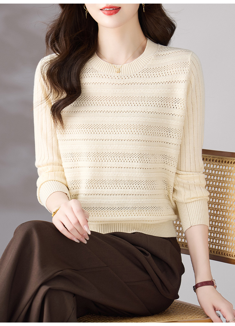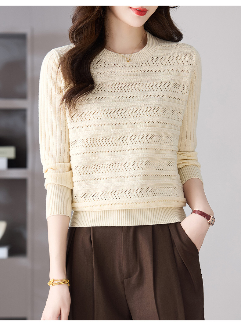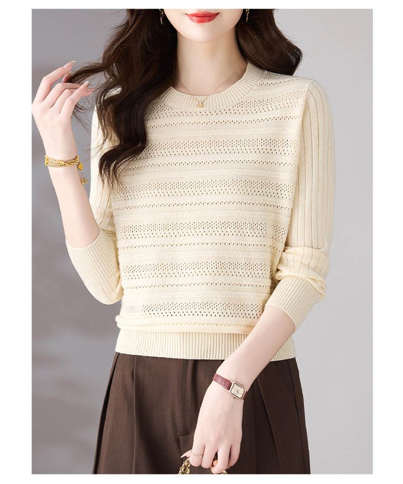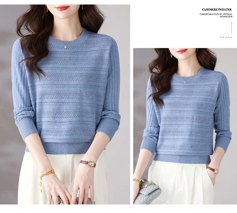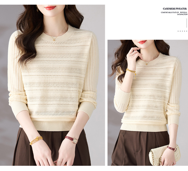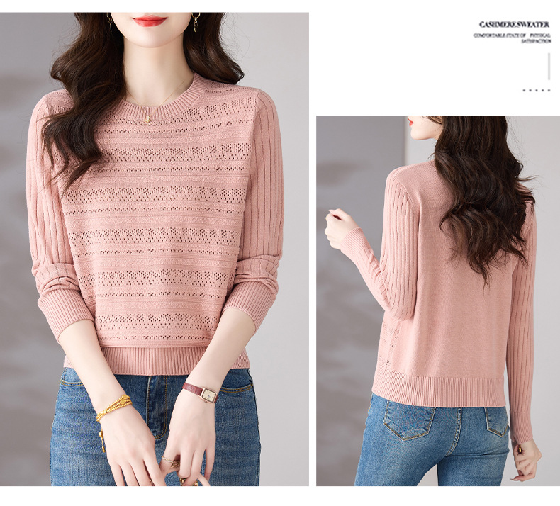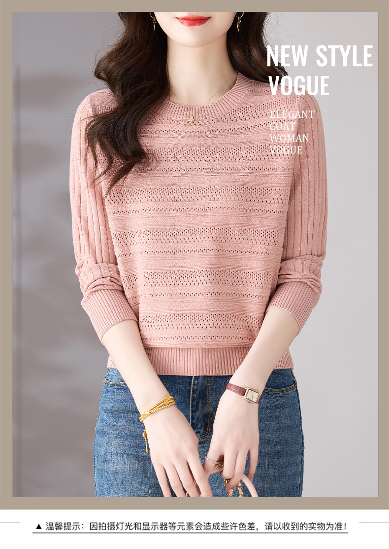 CC早秋薄款镂空长袖针织上衣女秋装2025新款圆领毛衣春秋打底衫