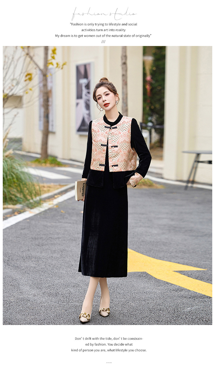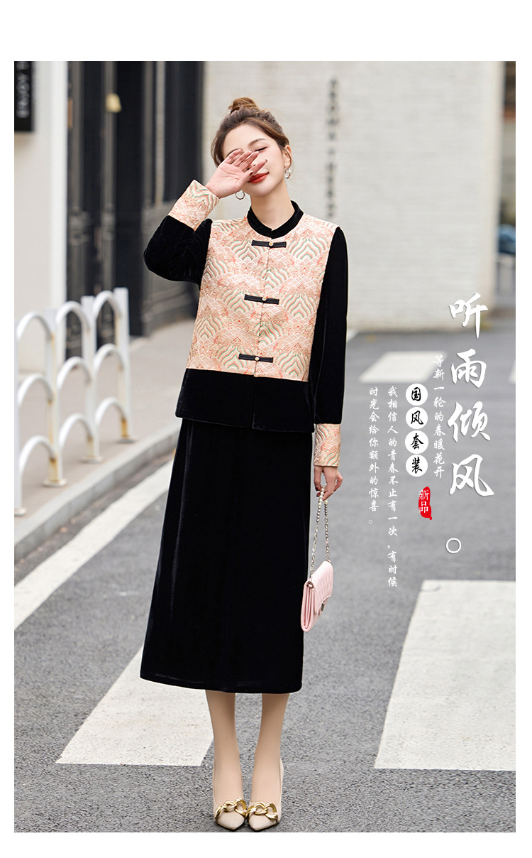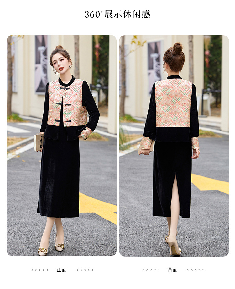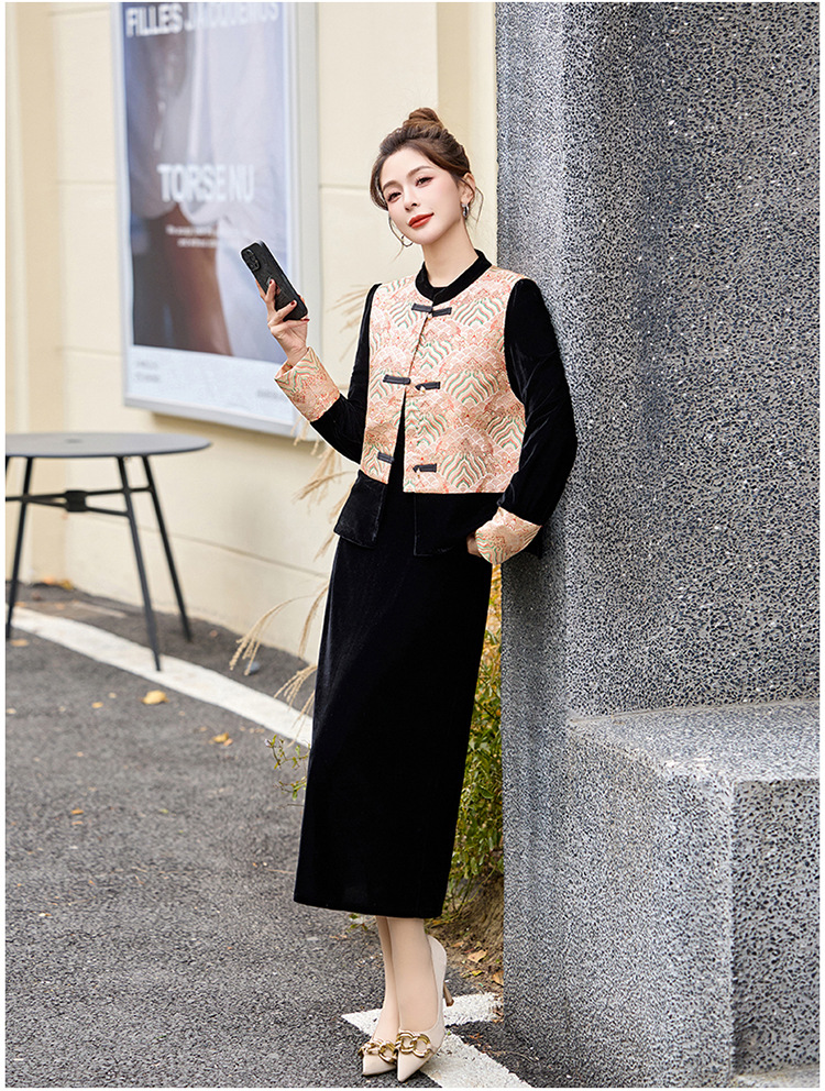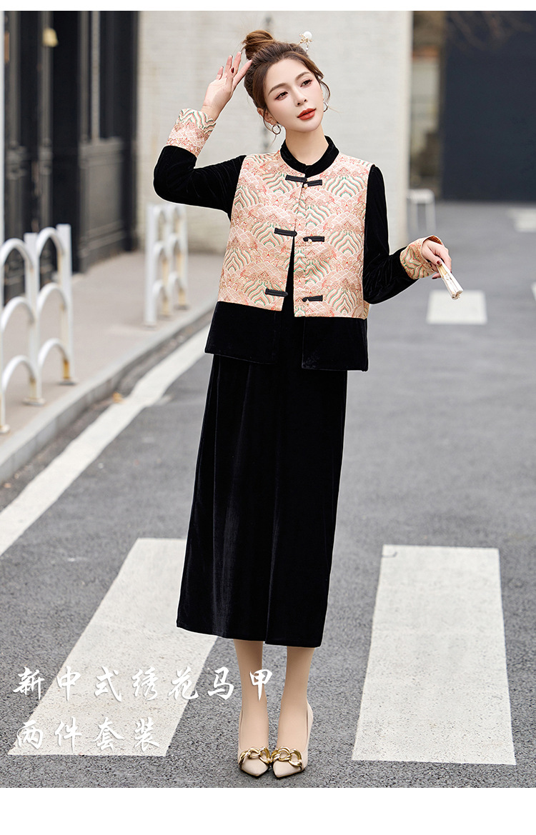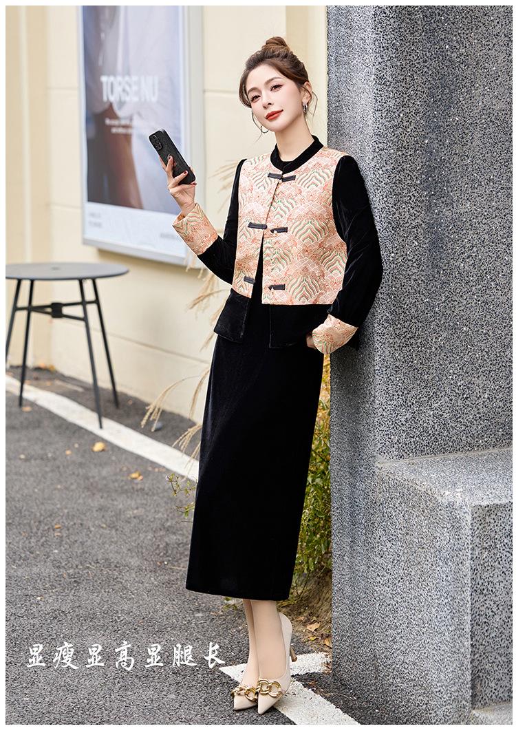 TZW-2025春季新款民族风两件套裙新中式提花马甲丝绒连衣裙时尚休闲套