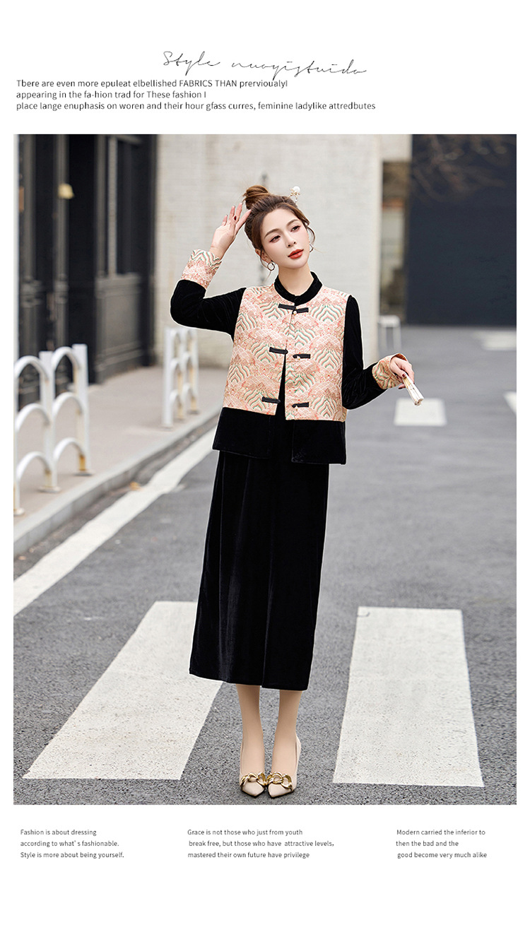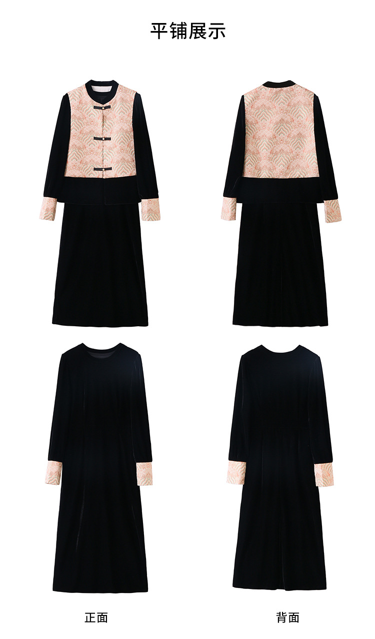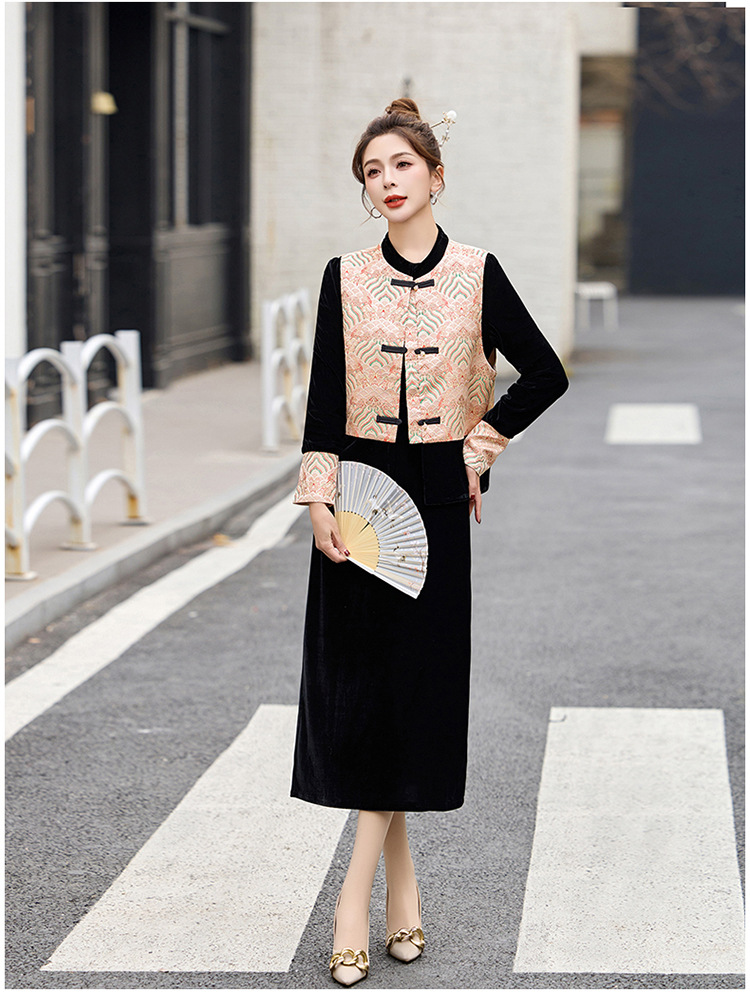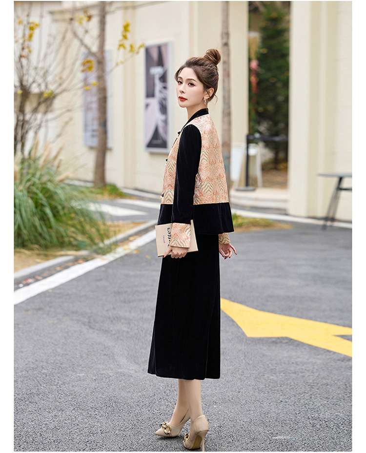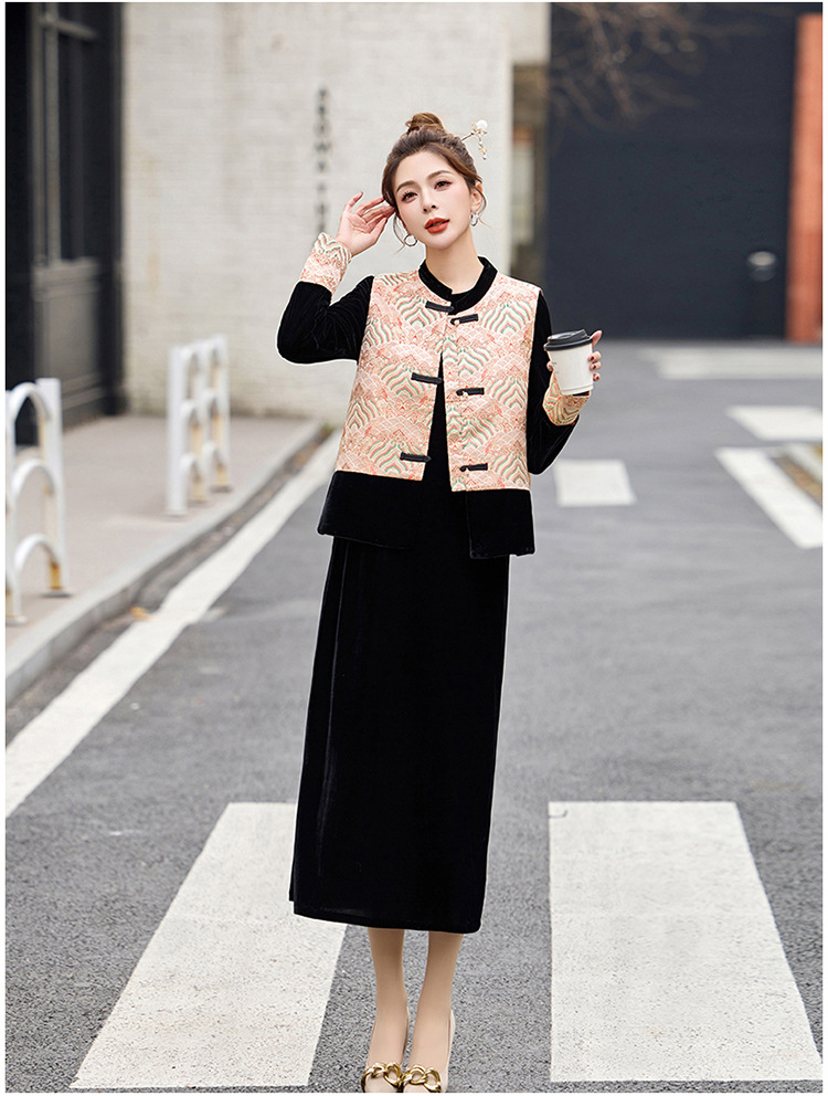 TZW-2025春季新款民族风两件套裙新中式提花马甲丝绒连衣裙时尚休闲套