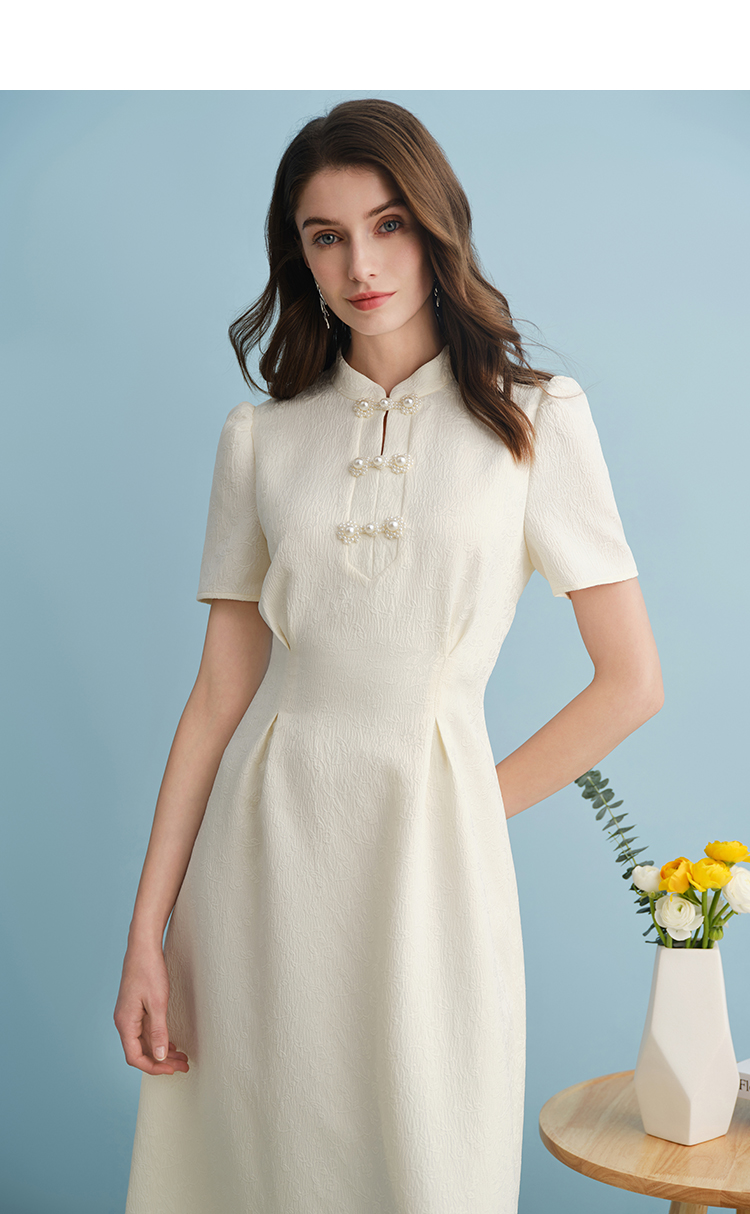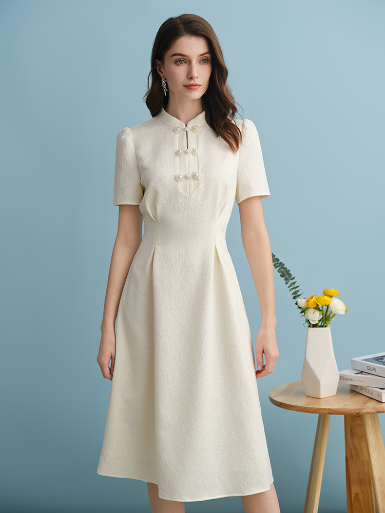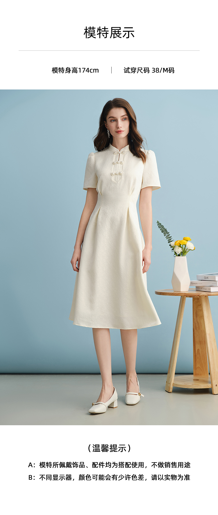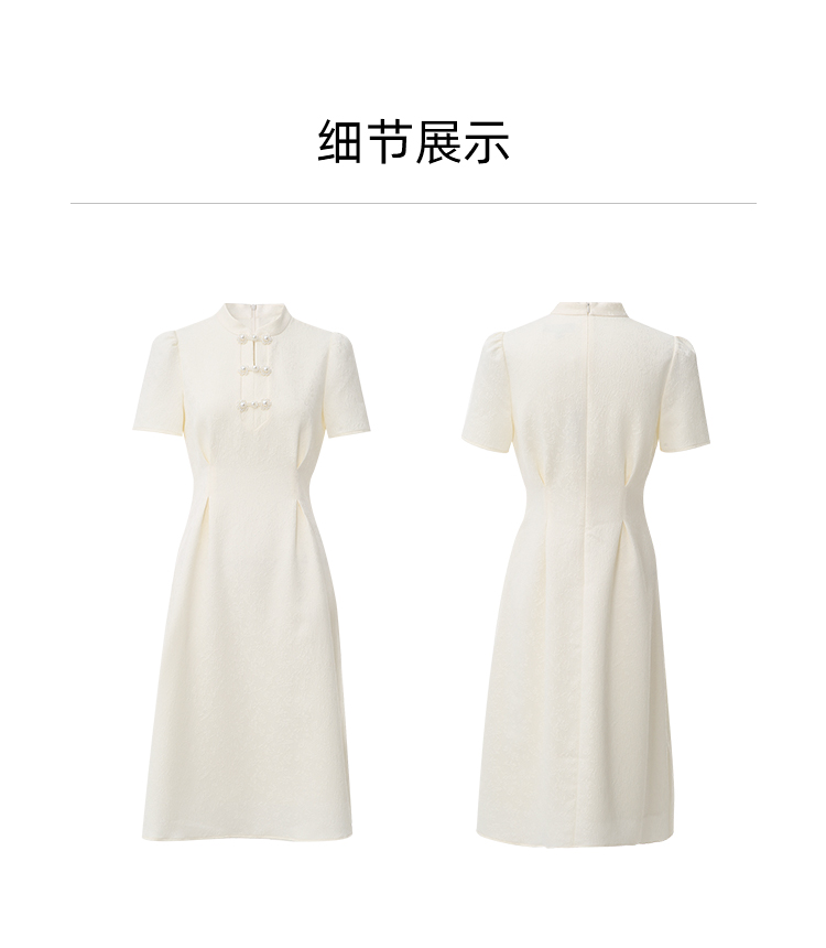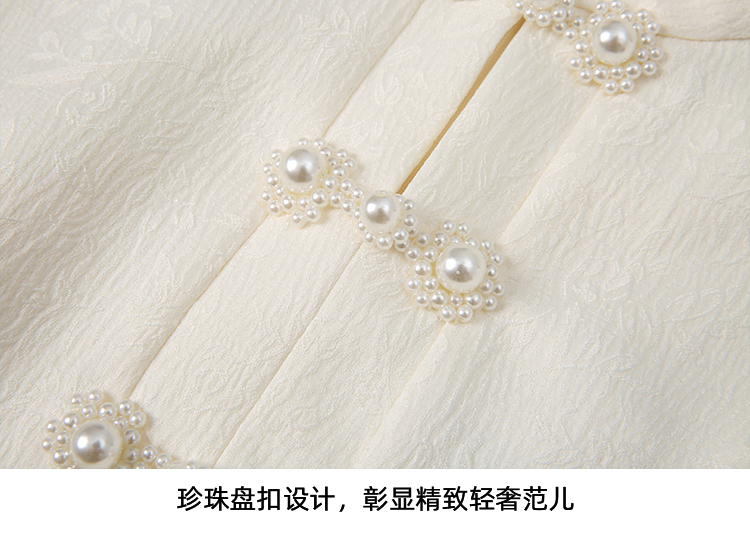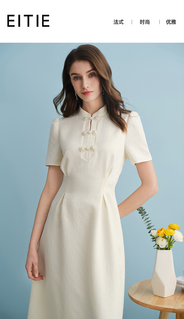 EITIE爱特爱新中式对襟珍珠盘扣收腰显瘦白色连衣裙夏季新款B2407306
