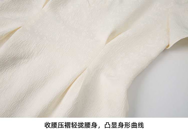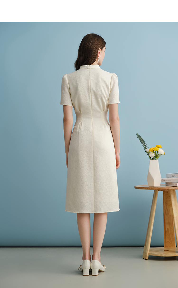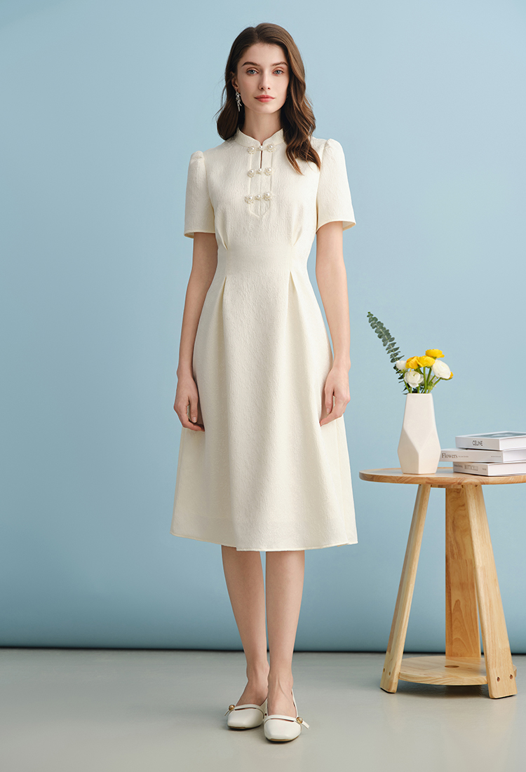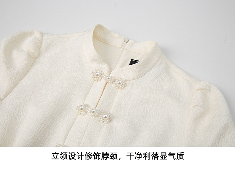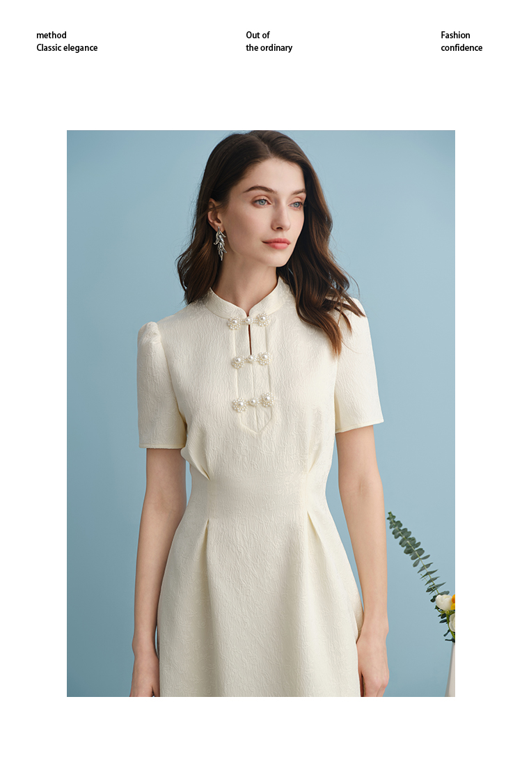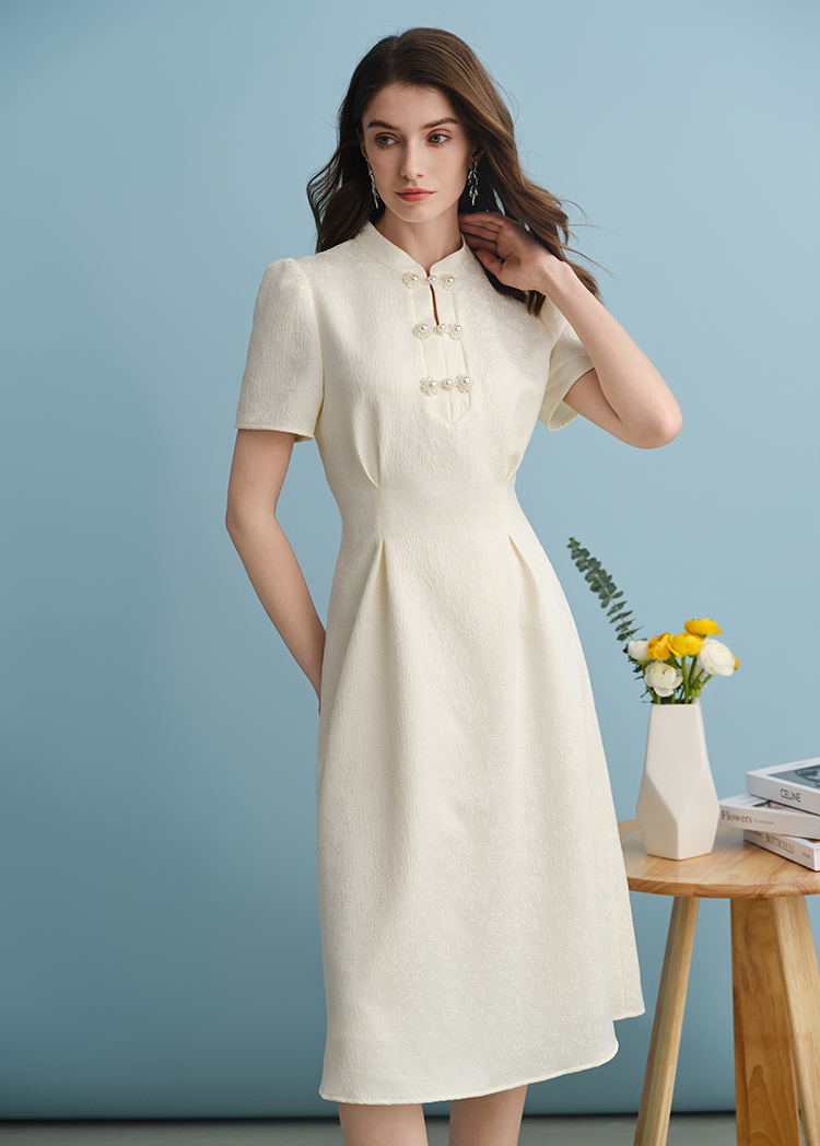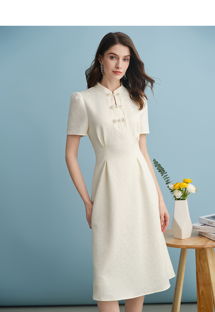 EITIE爱特爱新中式对襟珍珠盘扣收腰显瘦白色连衣裙夏季新款B2407306