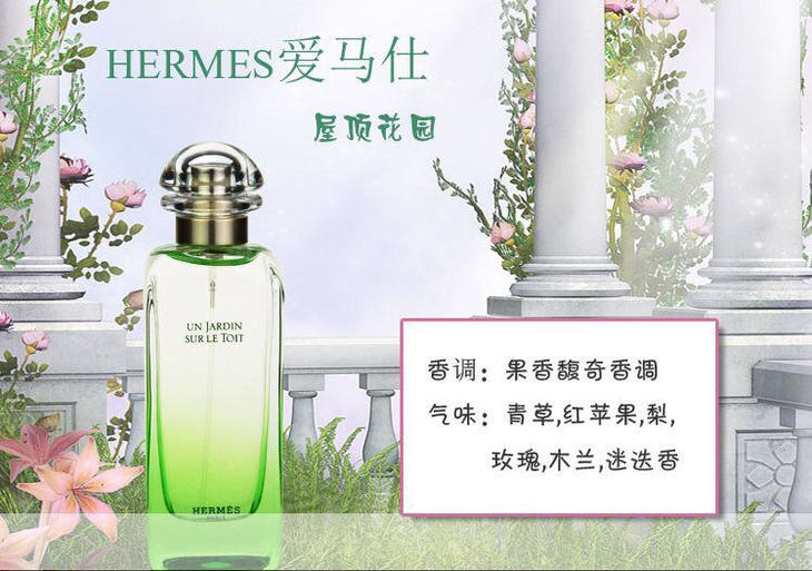 Hermes爱马仕屋顶花园 Un Jardin Sur Le Toit100ml EDT淡香水 爱马仕屋顶花园中性香水,🌼低调的东方味,🍀老外理解的中国庭院风。🌀以橘子香作为开场白,并始终贯穿,🌸除了开头气味略重略冷感以外,都是温温柔柔的安静模样,香调🌸:苹果、梨、玫瑰、绿草、迷迭香、木兰花、青草肥。这瓶香水糅合水果🍎、植物🍃及鲜花的香气,在巴黎的灯光映照下,散发出一股清新、愉悅的芬芳,为您呈现一席感官与心灵的餐宴☘️