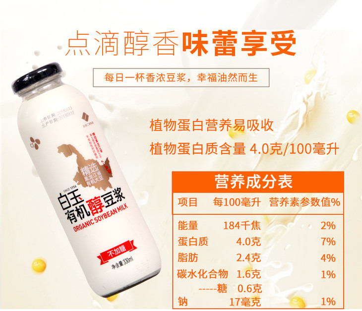 白玉有机豆浆黄豆(加糖/无糖)(330ml*8瓶)