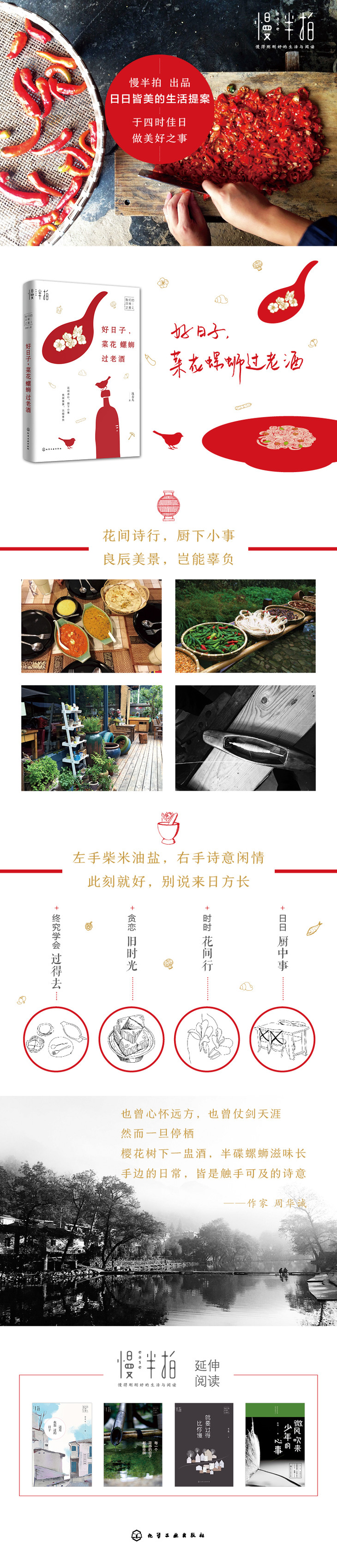 于四时佳日,做美好之事。逛菜场,下厨房,日常烟火里都是生活滋味。也曾心怀远方,也曾仗剑天涯,然而一旦停栖,樱花树下一盅酒,半碟螺蛳滋味长,手边的日常皆是触手可及的诗意。——作家 周华诚