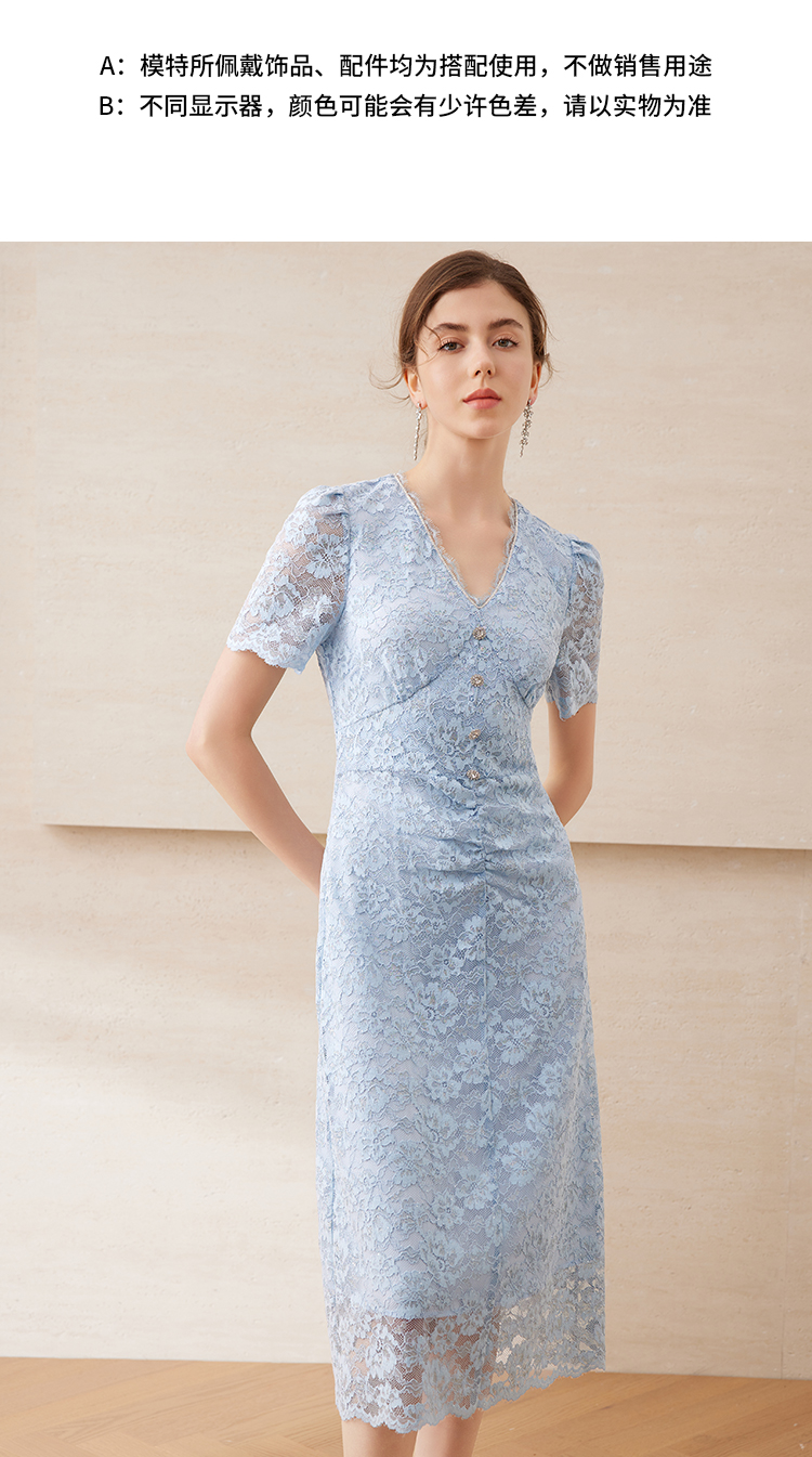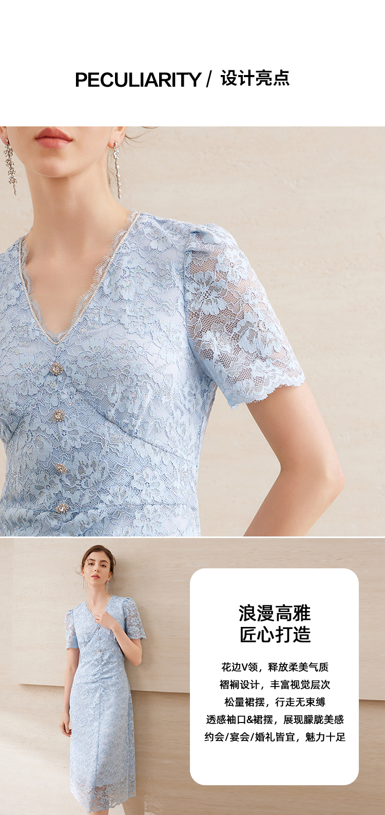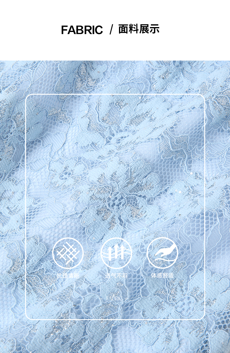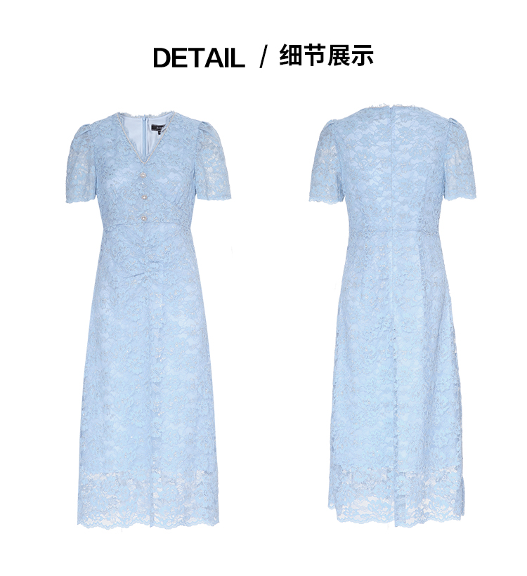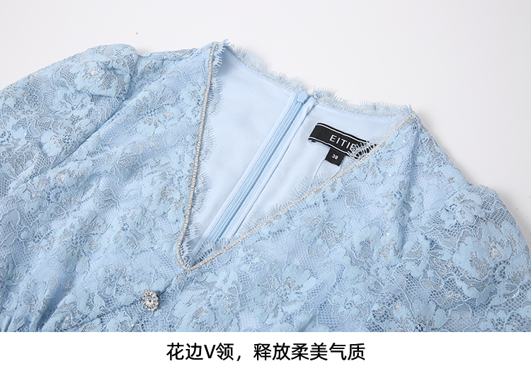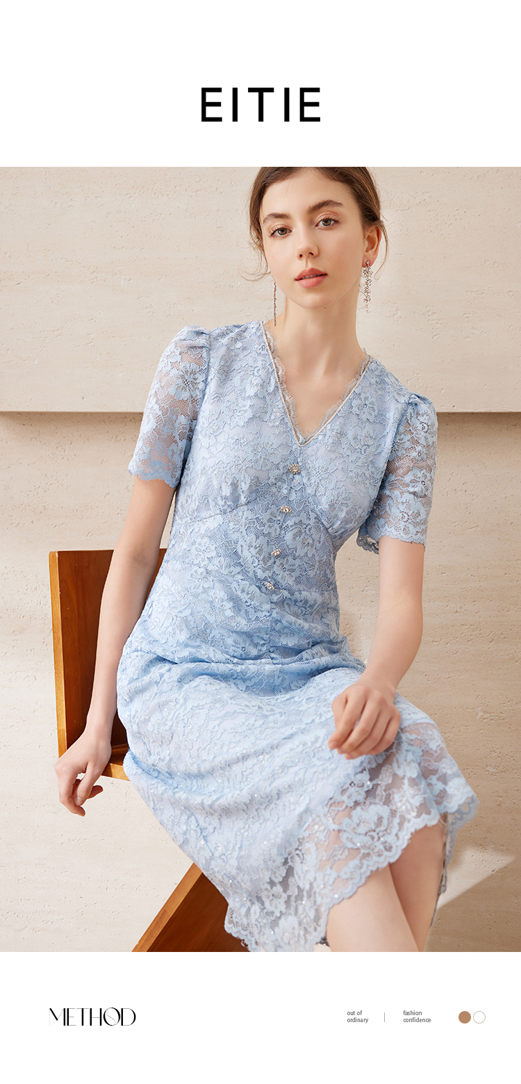EITIE爱特爱水蓝色典雅质感花边V领镂空蕾丝连衣裙2025年夏季新款B2507662