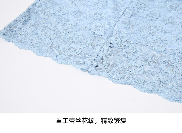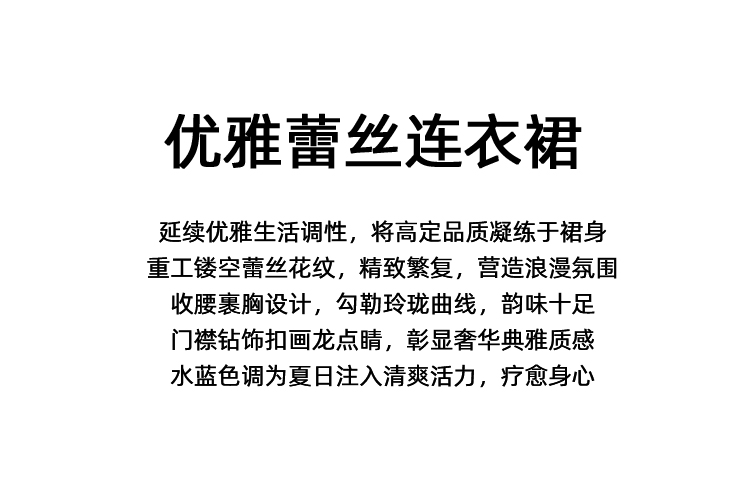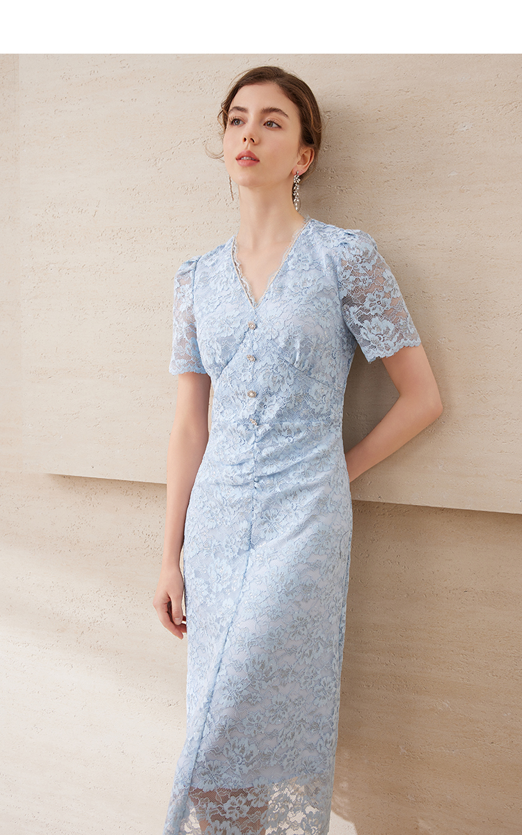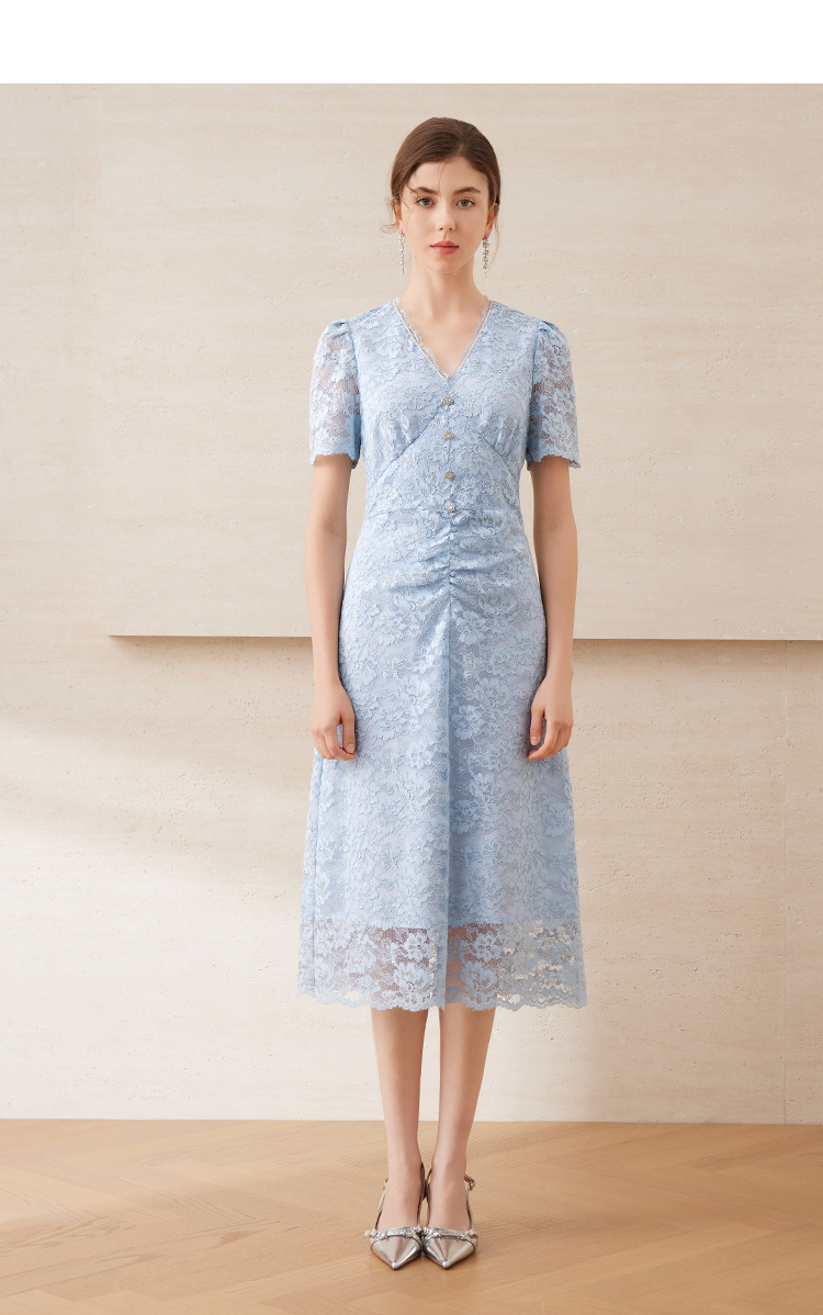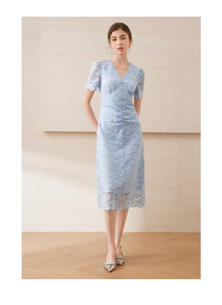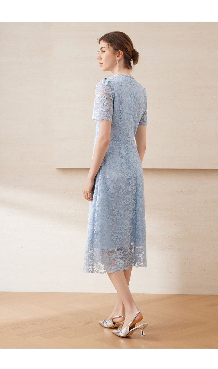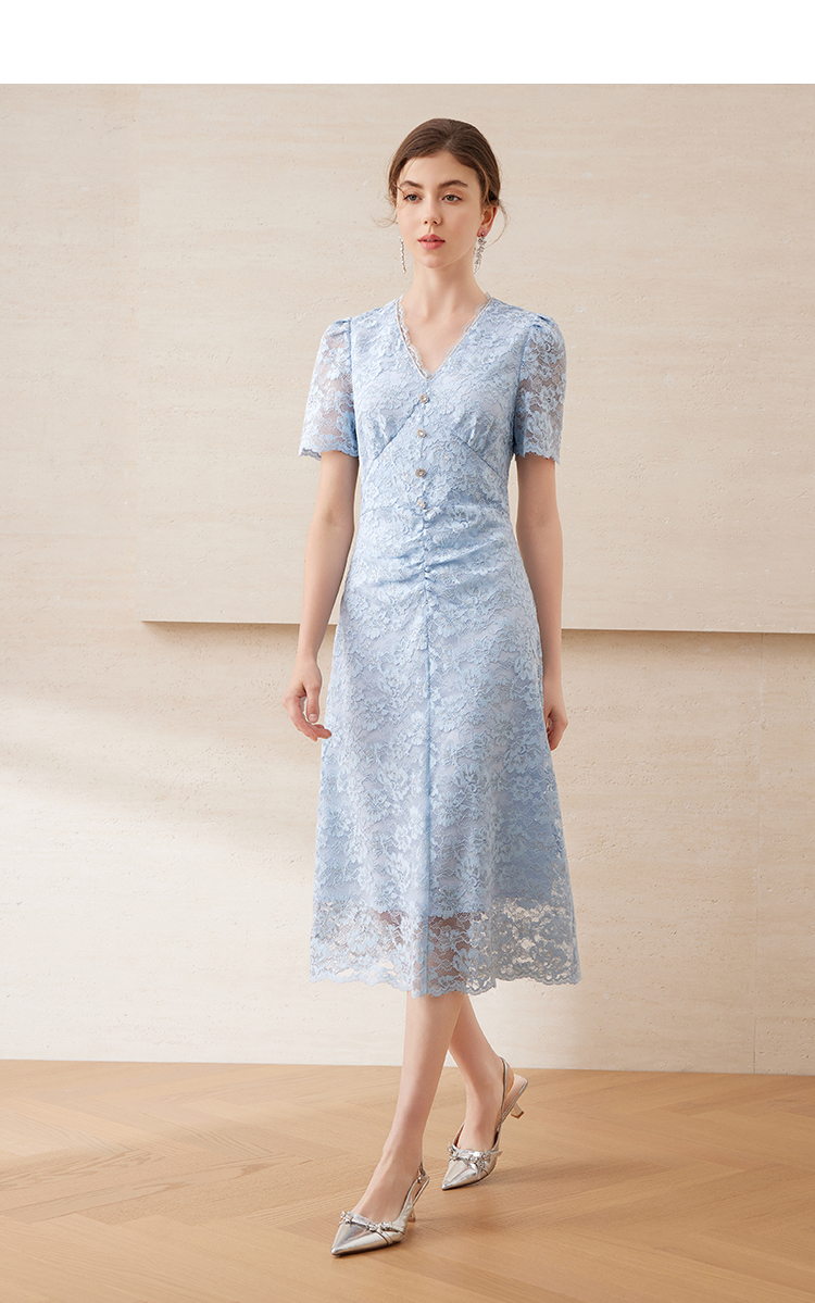 EITIE爱特爱水蓝色典雅质感花边V领镂空蕾丝连衣裙2025年夏季新款B2507662