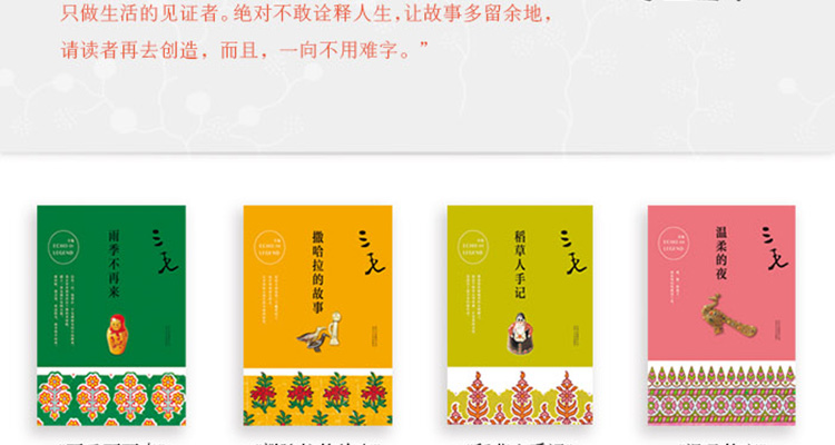 三毛(1943~1991),本名陈懋平,因为学不会写“懋”字,就自己改名为陈平。旅行和读书是她生命中的两颗一级星,快乐与疼痛都夹杂其中,而写作之初纯粹是为了让父母开心。她踏上广袤的撒哈拉,追寻前世的乡愁,和荷西在沙漠结婚,从此写出一系列风靡无数读者的散文作品,把大漠的狂野温柔和活力四射的婚姻生活,淋漓尽致展现在大家面前,“三毛热”迅速从台港横扫整个华文世界。然而荷西的突然离世,让她差点要放弃生命,直到去了一趟中南美旅游,才终于重新提笔写作。接着她尝试写剧本、填歌词,每次出手必定撼动人心。直到有,她又像儿时那样不按常理出牌,流浪到了遥远的天国。