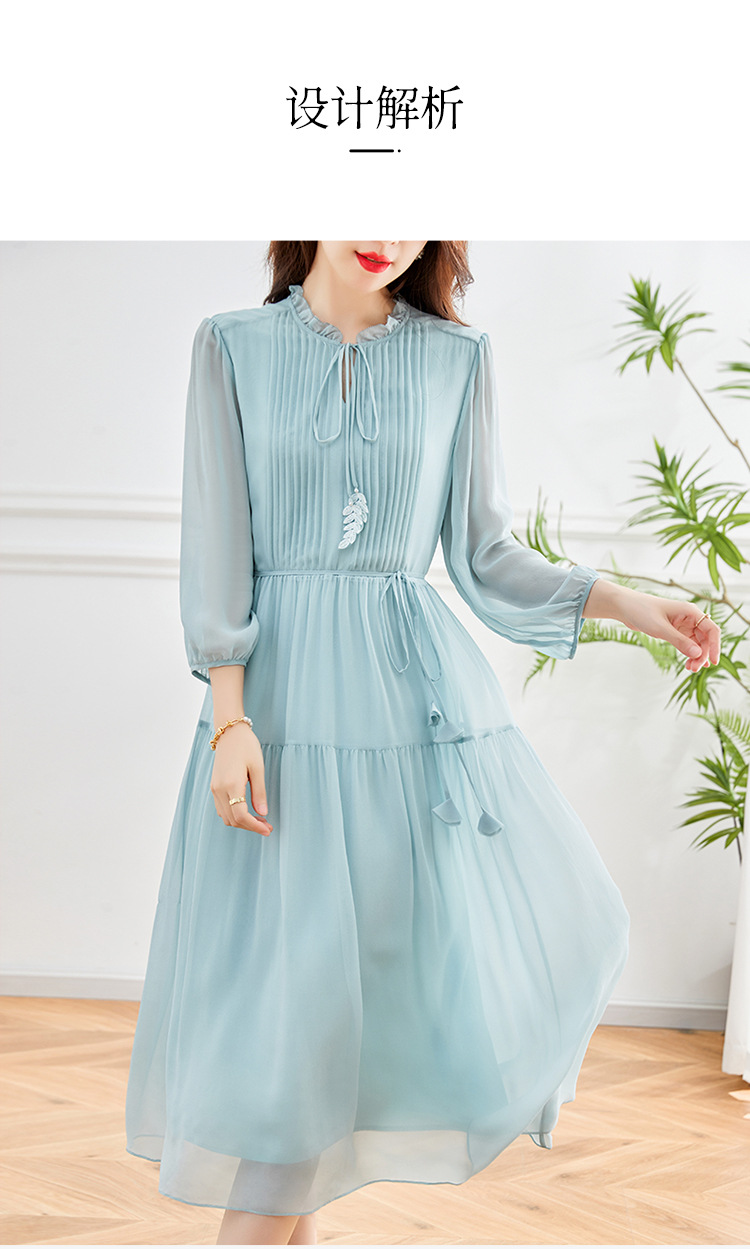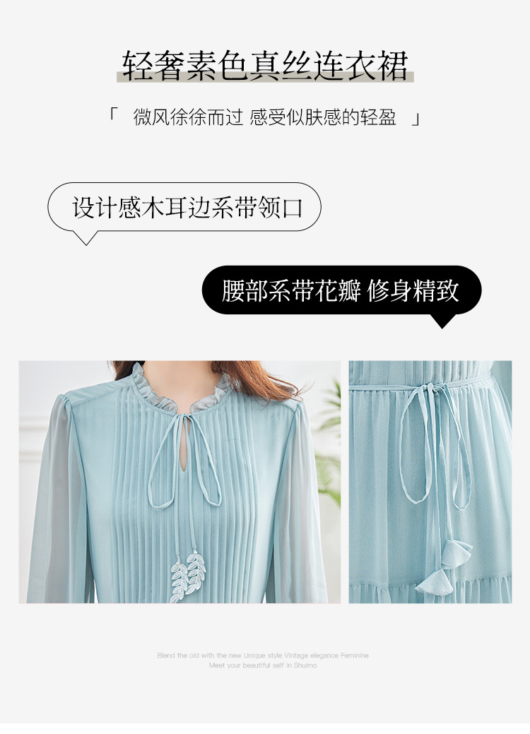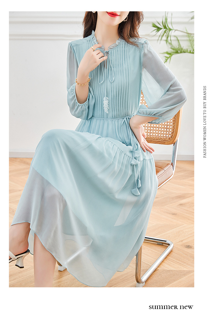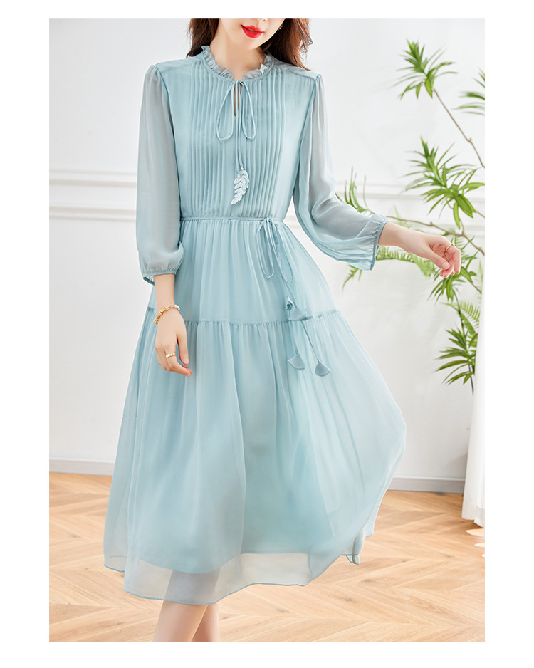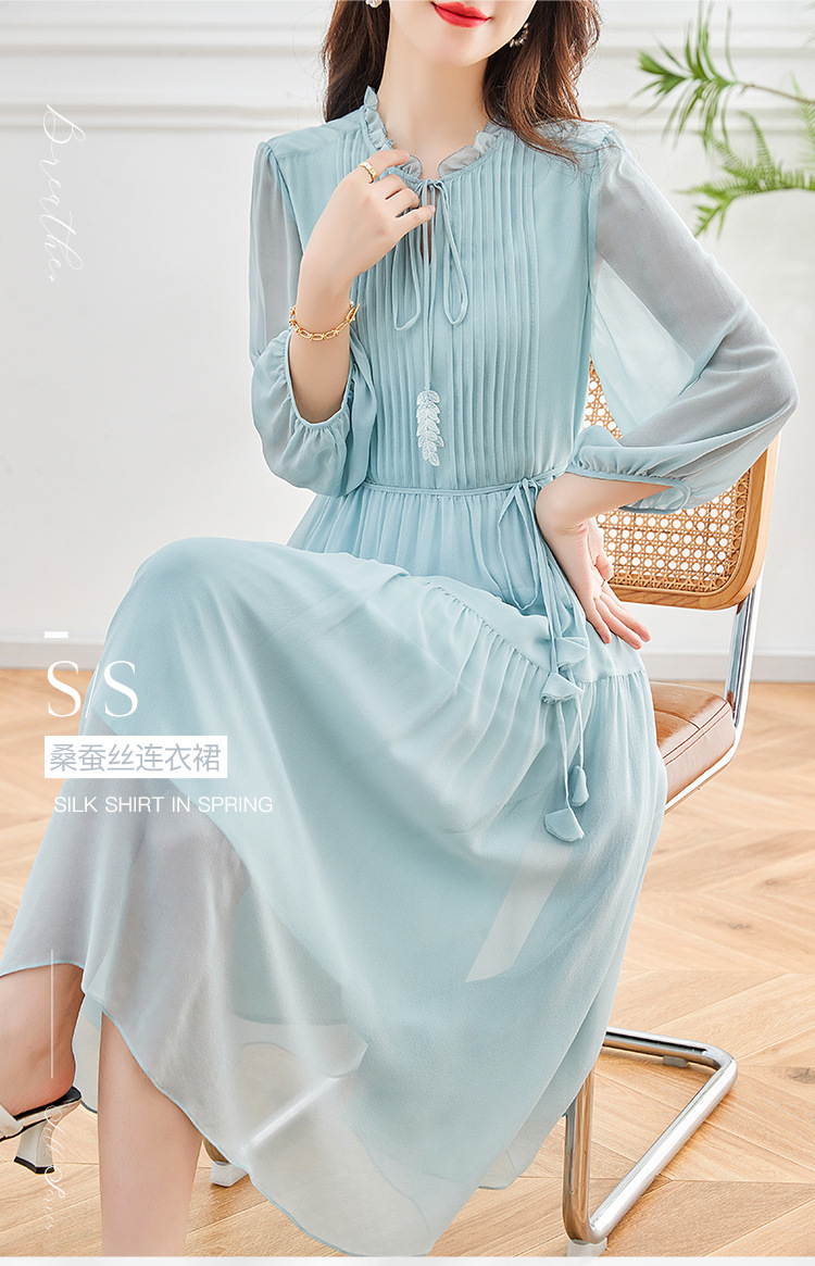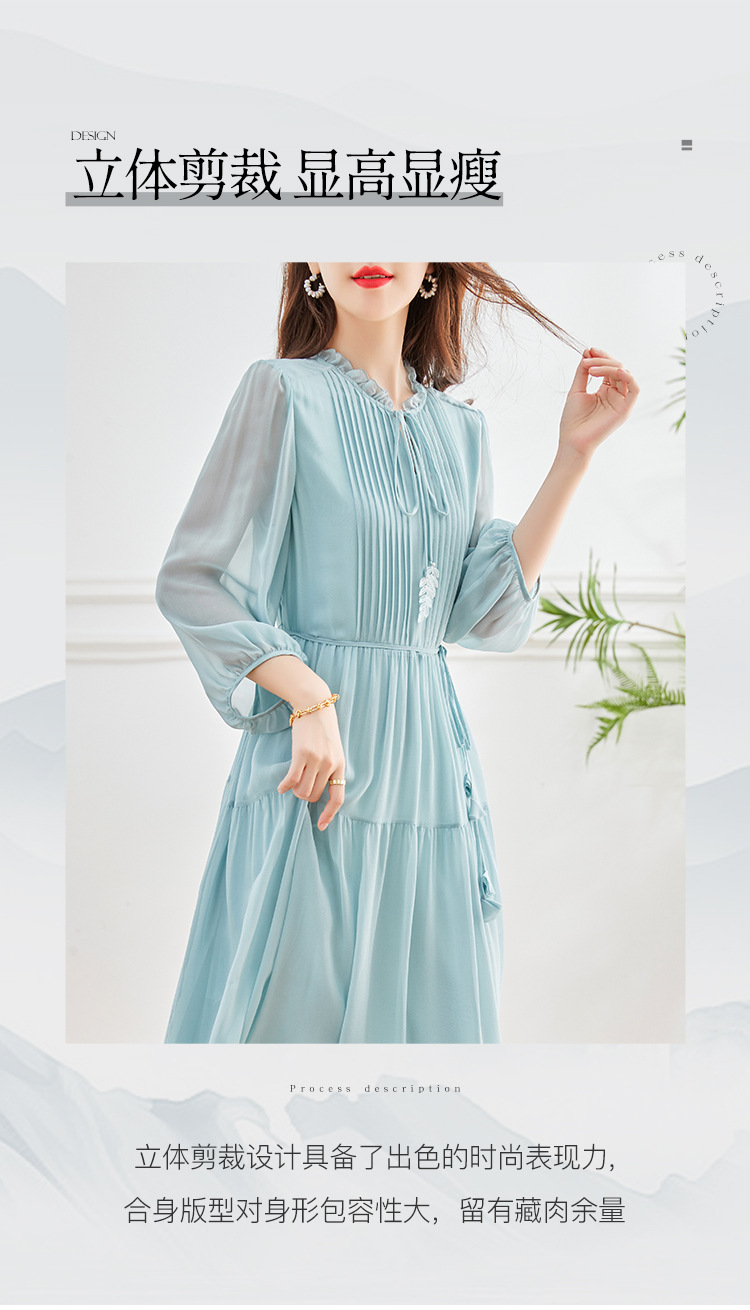 ZS-5356素色真丝桑蚕丝乔其连衣裙女2023夏季新款设计感木耳边圆领中长裙