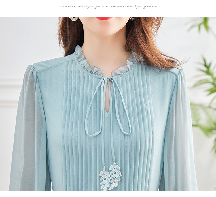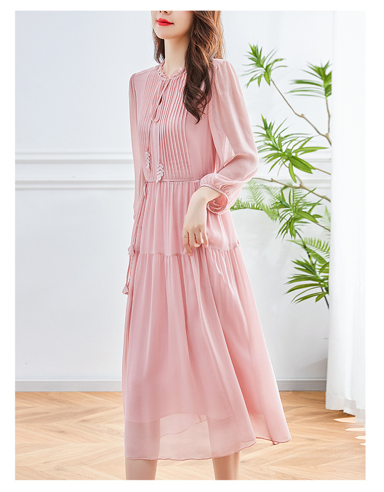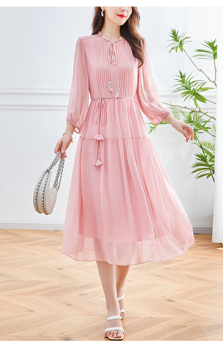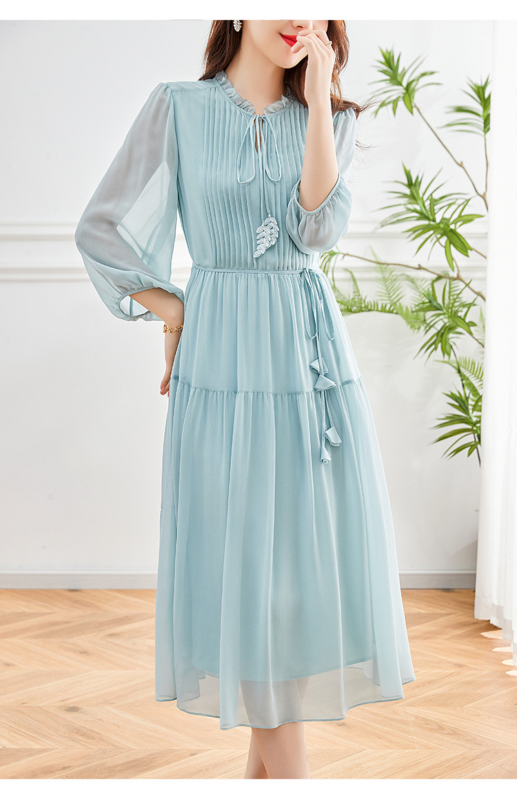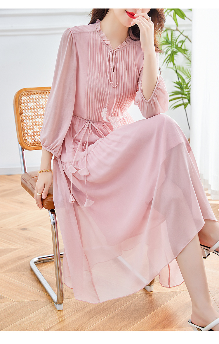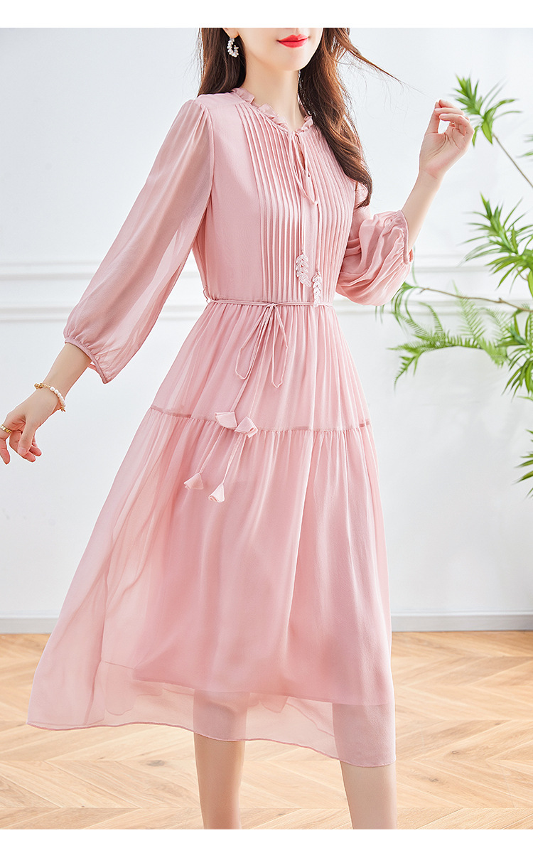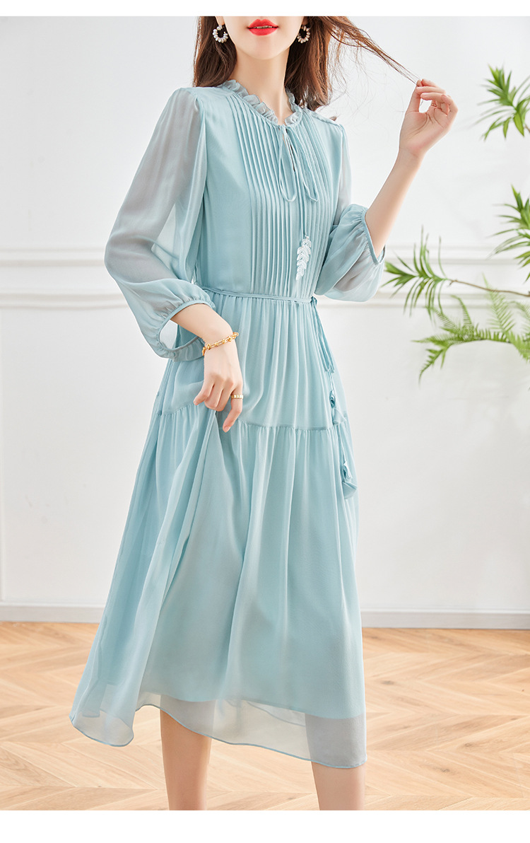 ZS-5356素色真丝桑蚕丝乔其连衣裙女2023夏季新款设计感木耳边圆领中长裙