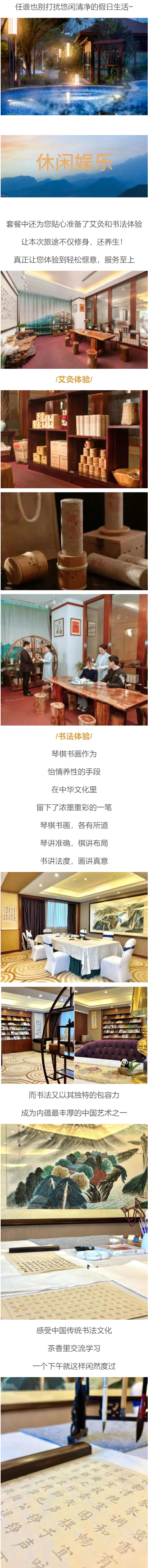 购买说明 | ·使用方式:收码后在网址预约使用;预约下单后,需要等待商家确认是否预定成功 ·所有入住人办理入住手续时必须出示本人身份证,以便前台登记 ·房间不可以加床 ·每日每间客房早餐、汤池可以免费携带2名1.3米以下儿童;超出部分参照收费标准政策执行 ·早餐厅及养真泉儿童价收费标准:早餐儿童价28元/位;汤池儿童价40元/位 ·早餐厅及养真泉儿童价收费标准政策:身高1.3米-1.5米儿童享受儿童价;身高超过 1.5米以上收取成人价 早餐供应时间:7:00—10:00 汤池时间:周一—周五: 14:30-22:00;周六、周日: 10:00-22:00 艾灸/书法体验:9:00-17:00 汤池温馨提示:患有心脏病、高血压、身体不适、各类传染性身体疾病或有孕者不能浸泡,饮酒者、醉酒者严禁入池浸泡。无成人陪伴儿童,无人照看老人不能进汤池。 入住时间: 请您于当日14点之后办理入住 退房时间: 请您于次日12点之前办理退房 ·请勿携带宠物 ·周末节假日通用不加价 · 售后规则:本产品为定制特价套餐,商家不支持退改,有效使用期内不使用则自动作废,敬请谅解 |