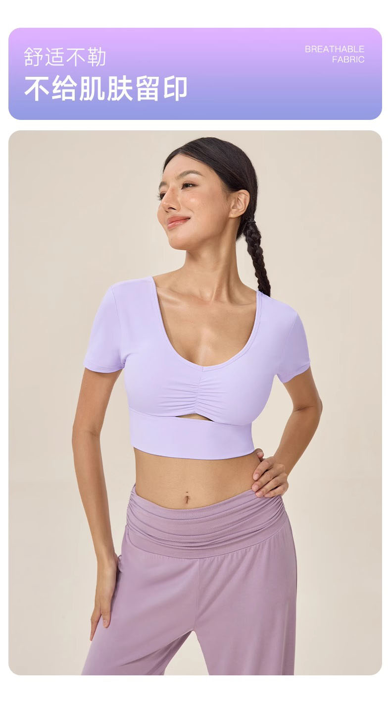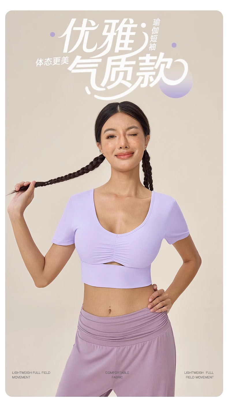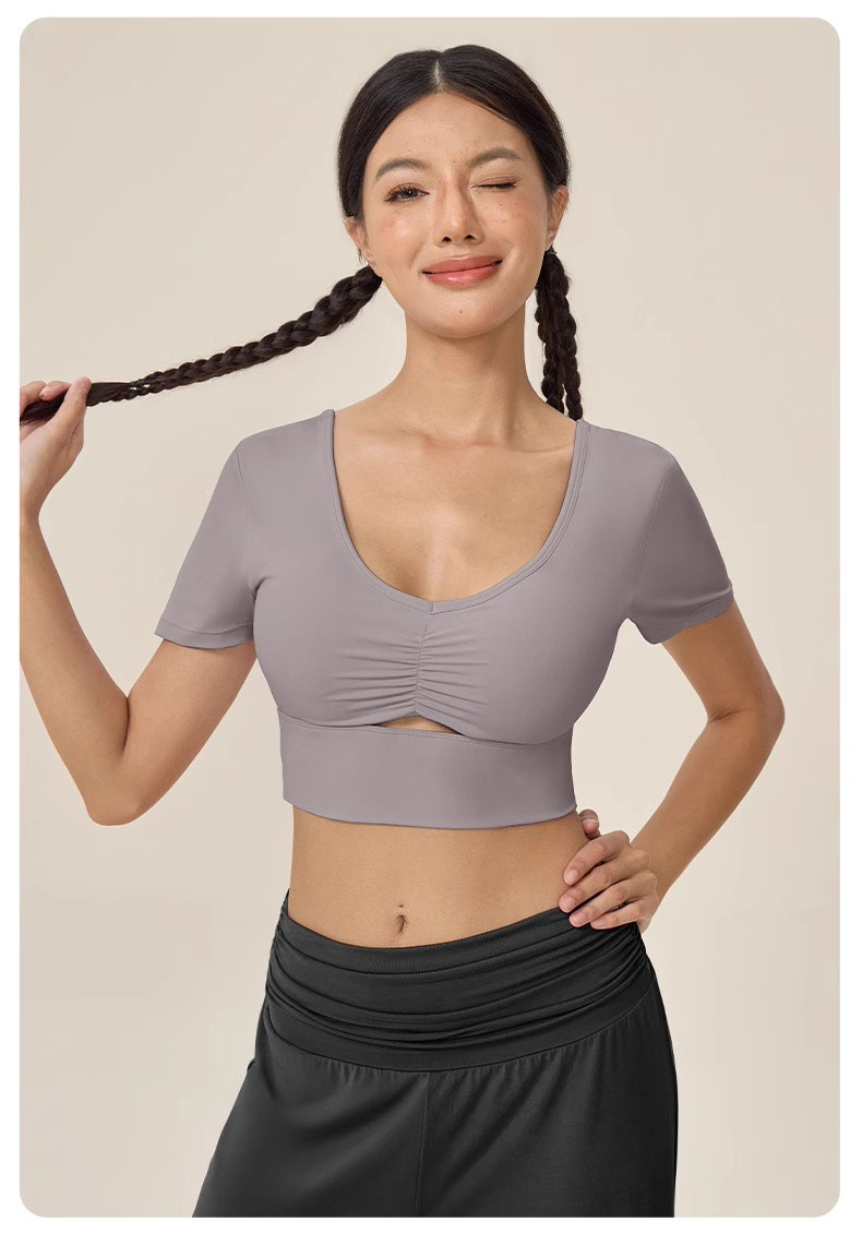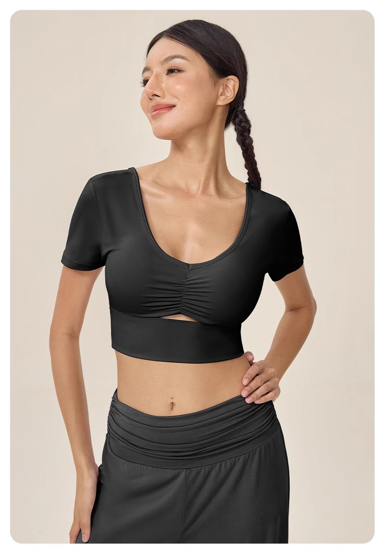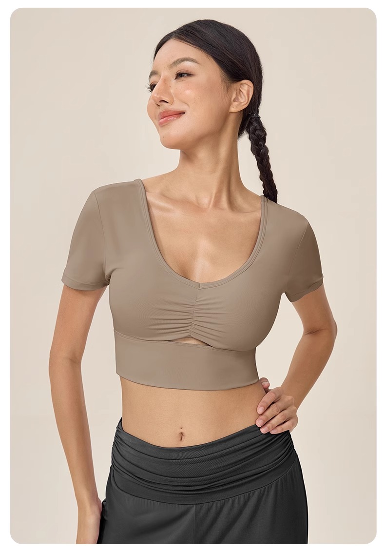 跃牌【欲动春风】系列 女瑜伽服短袖带胸垫V领性感紧身运动T恤24133