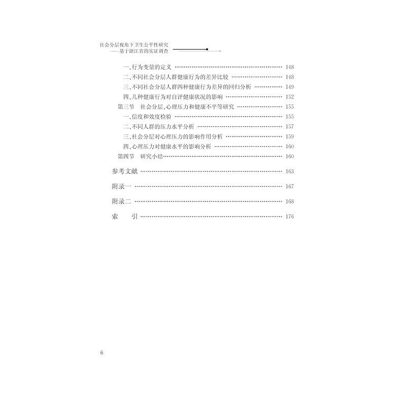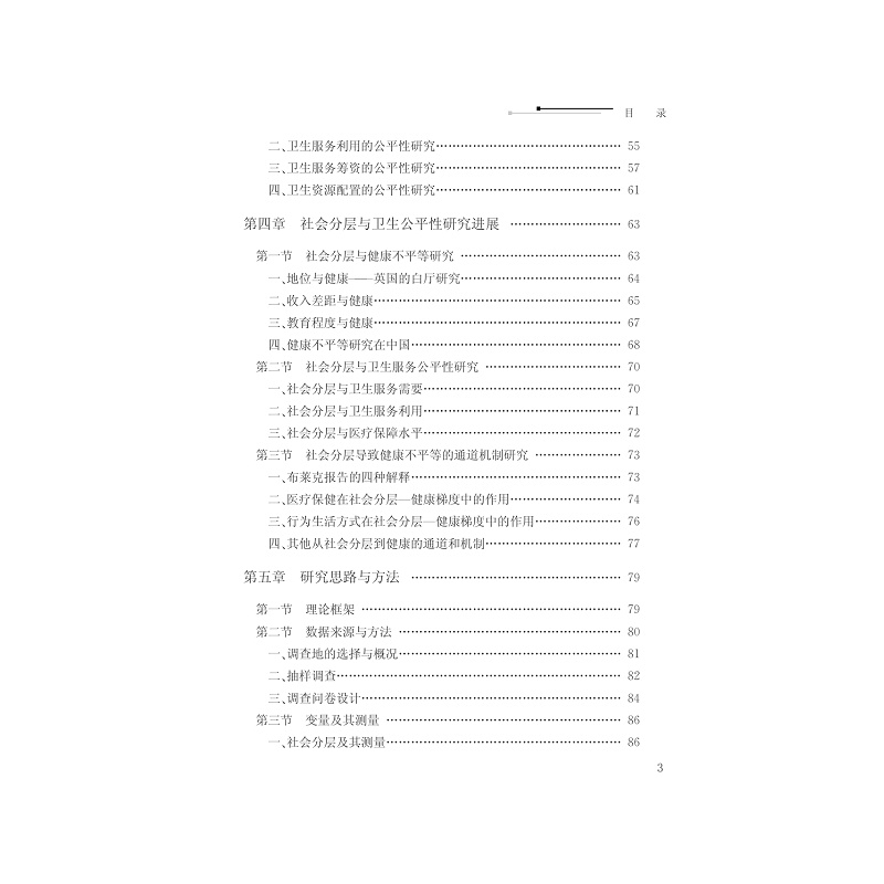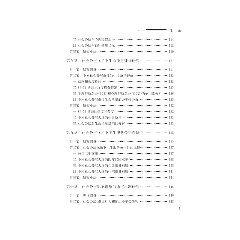 本书系教育部一般人文社科项目青年基金研究成果,书稿主要内容分两部分:一是理论研究,包含社会分层的理论和研究趋势,社会分层的划分标准和测量,卫生公平性与测量方法,不同社会分层的卫生公平性研究进展;二是实证研究,包含研究思路与方法,研究对象的社会分层分析,社会分层视角下的健康不平等研究,社会分层视角下生命质量评价研究,社会分层视角下卫生服务公平性研究,社会分层影响健康的通道机制研究。