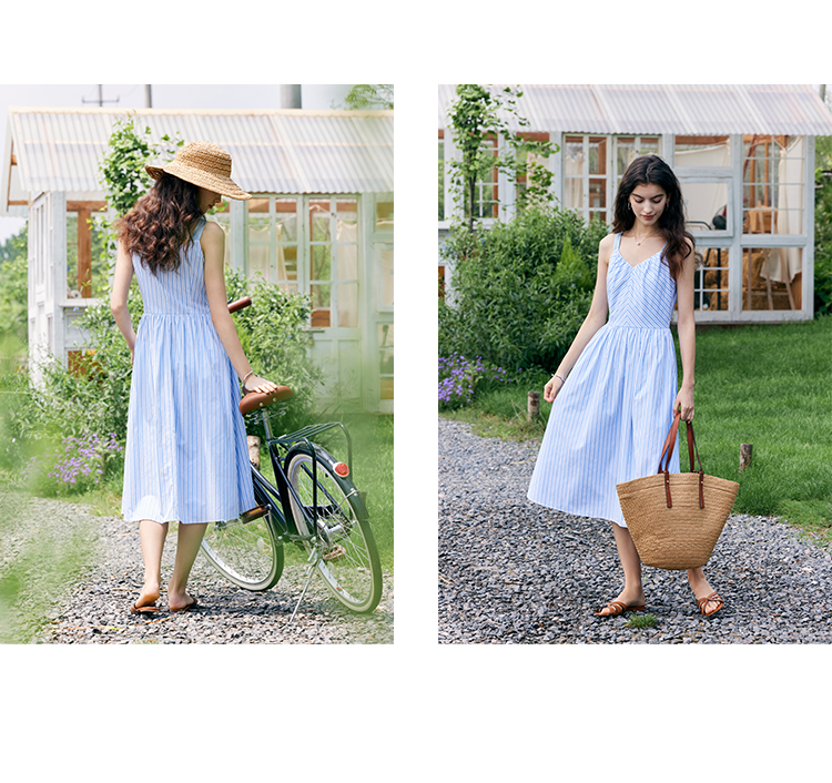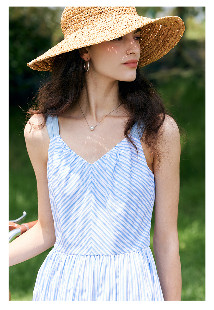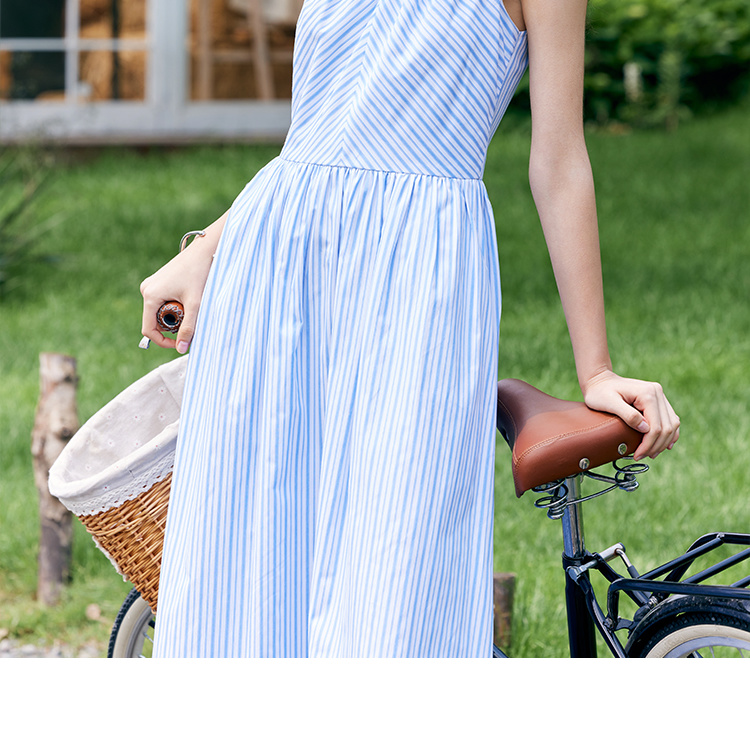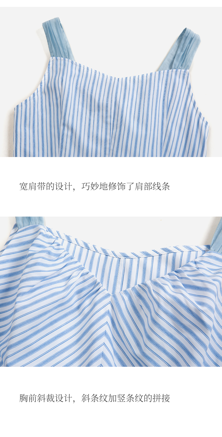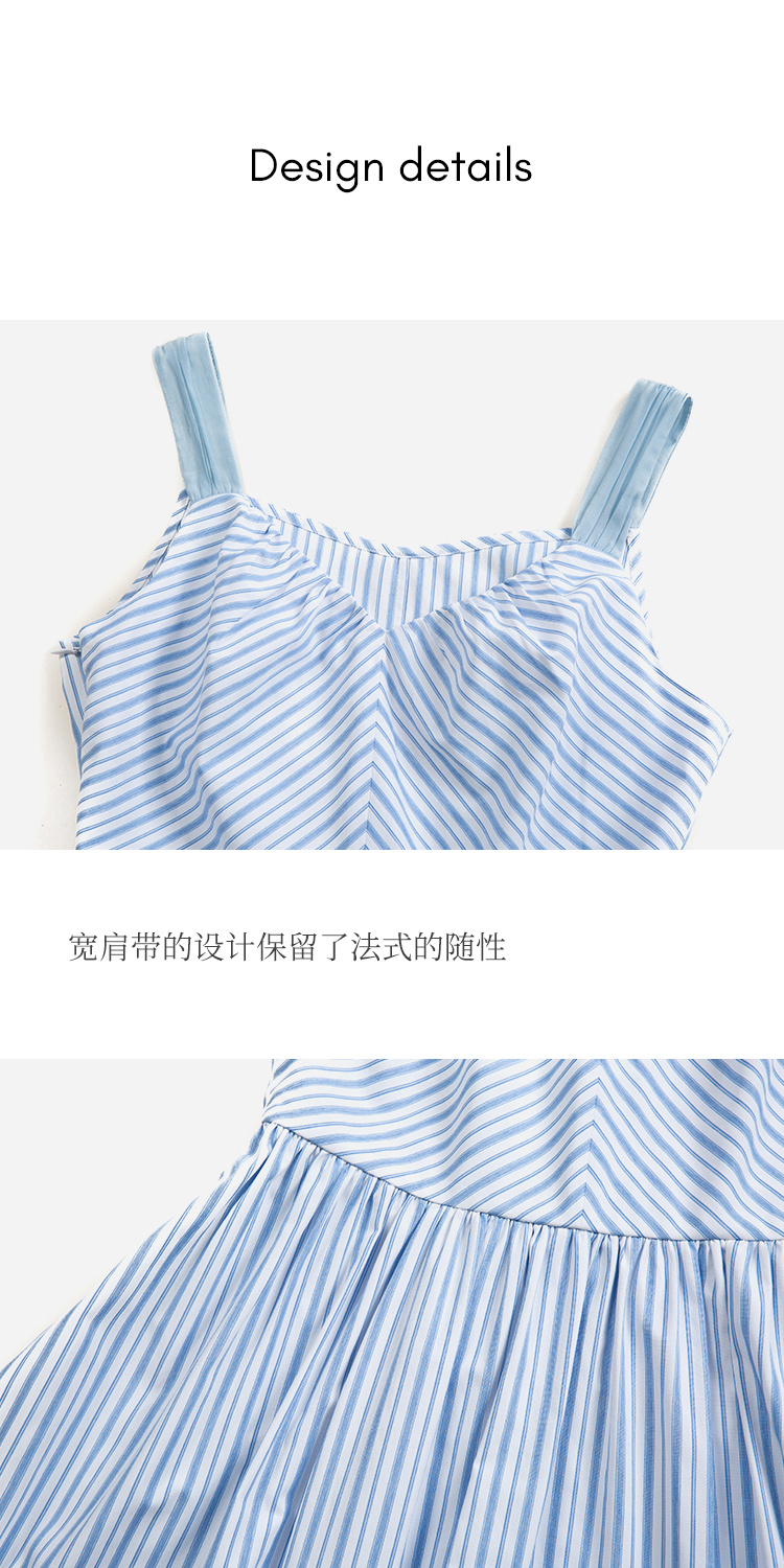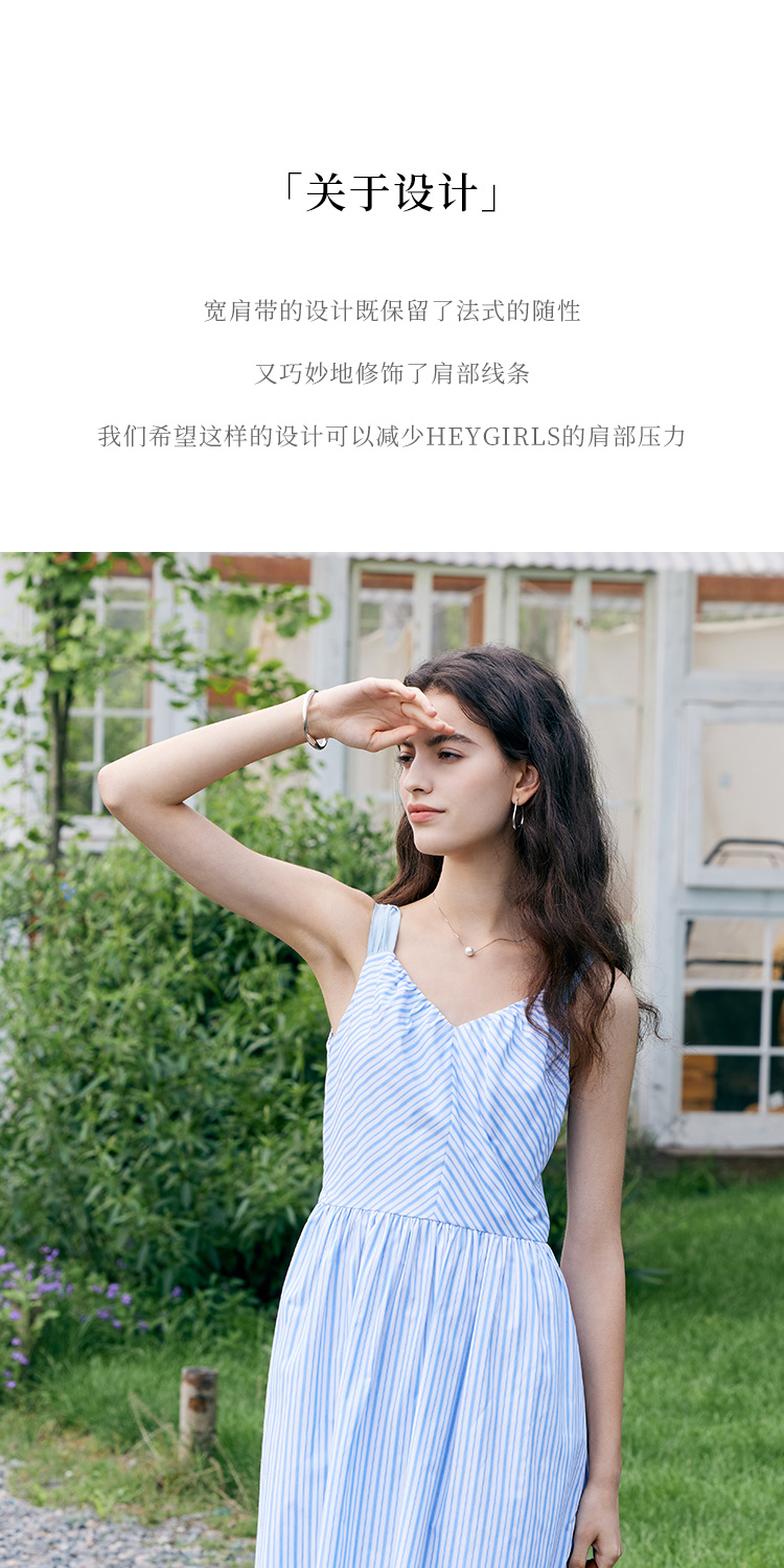 HeyDress宽肩带吊带连衣裙女夏季蓝白条纹吊带裙收腰设计显瘦裙子