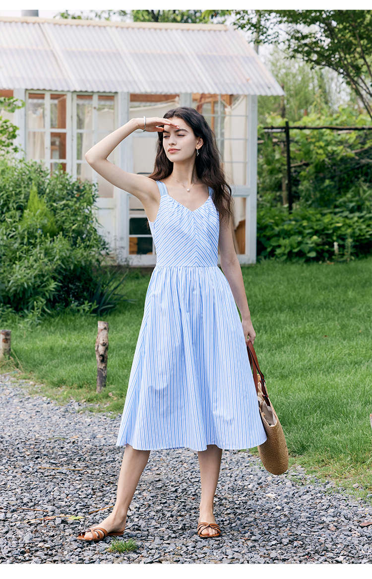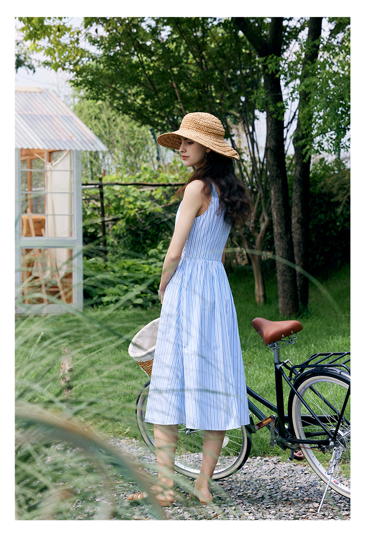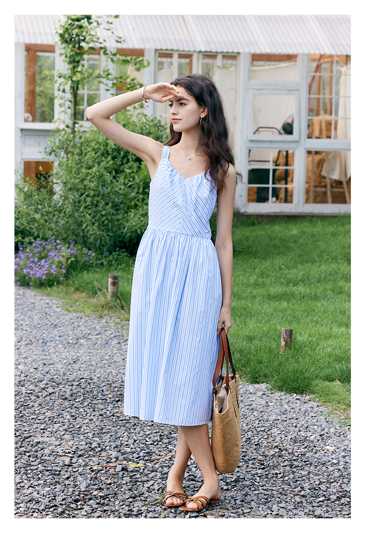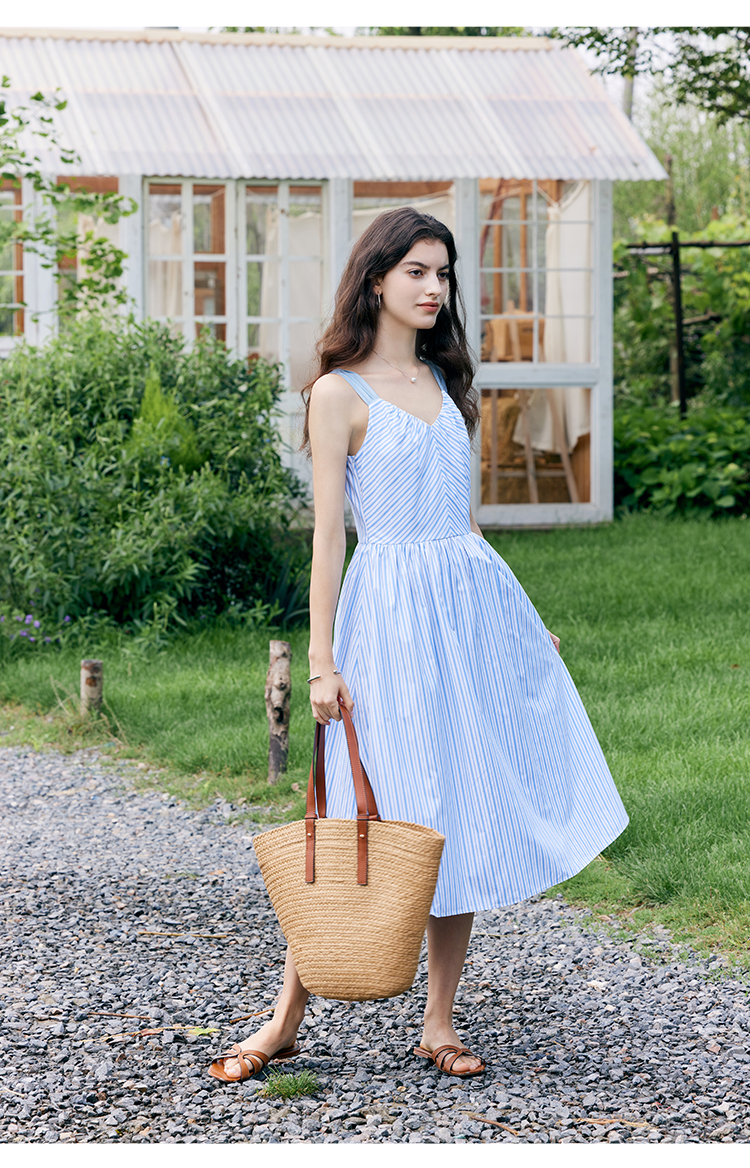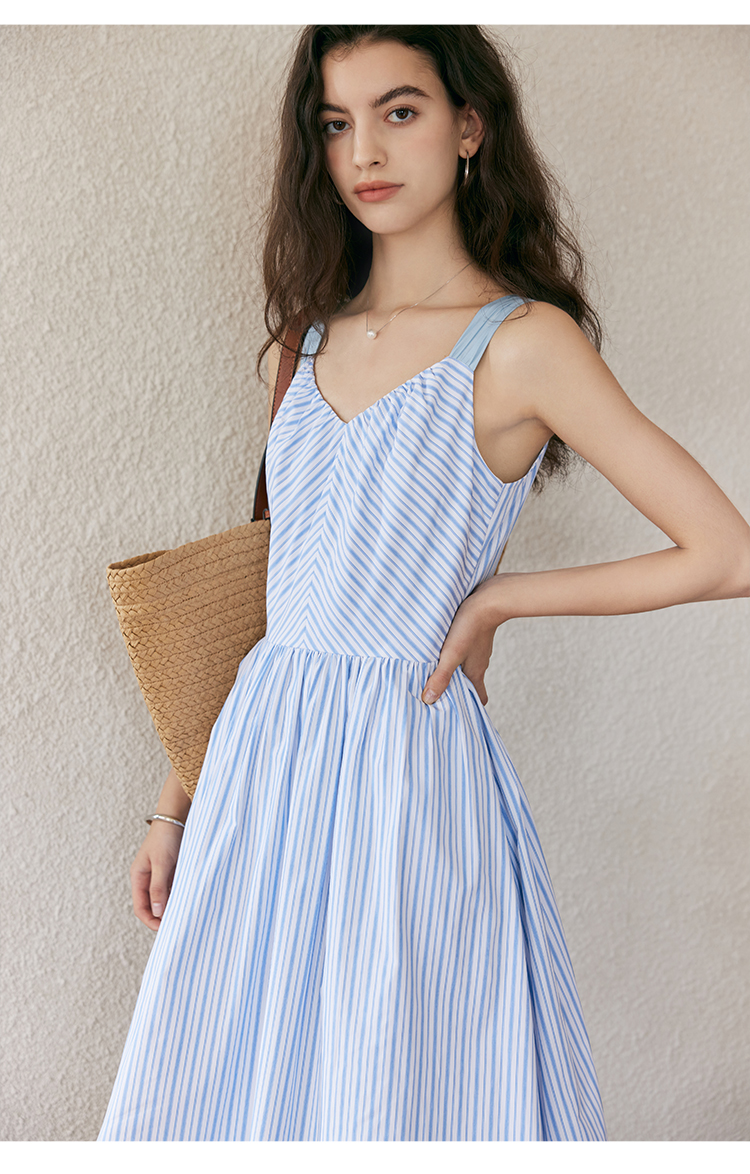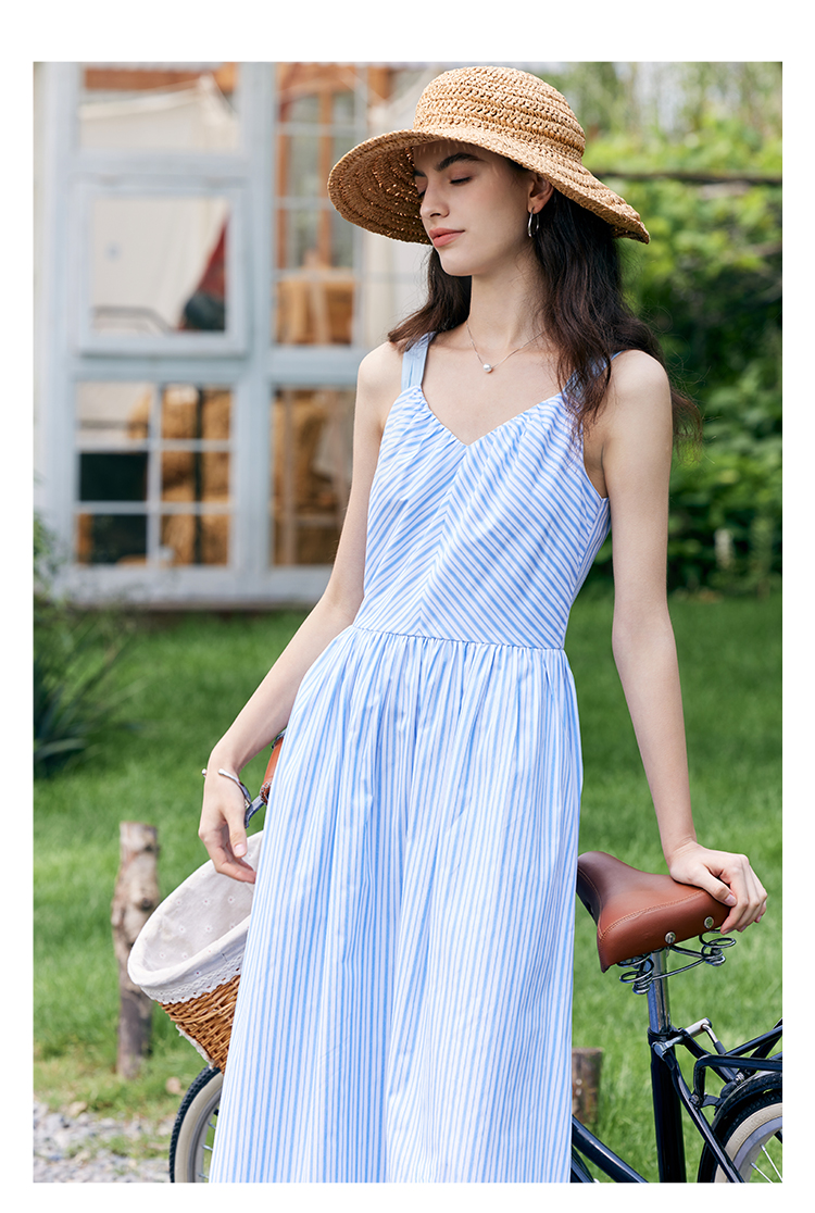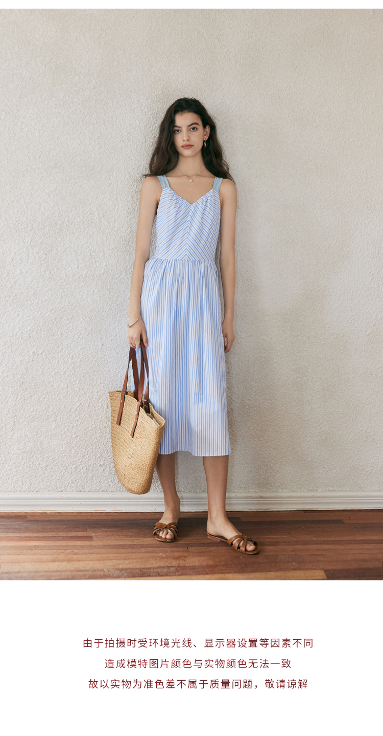 HeyDress宽肩带吊带连衣裙女夏季蓝白条纹吊带裙收腰设计显瘦裙子