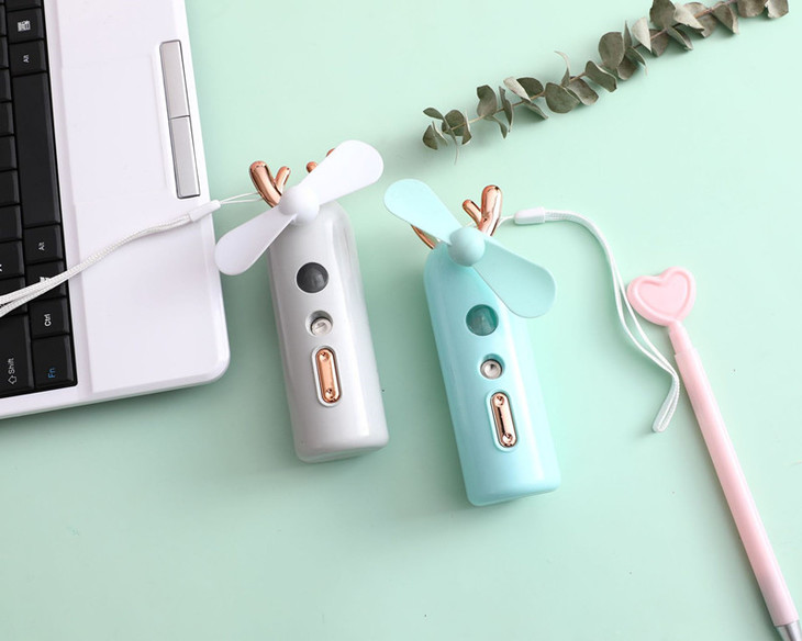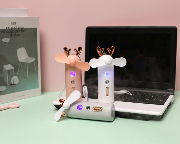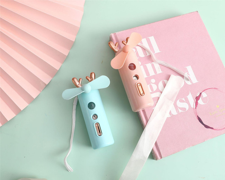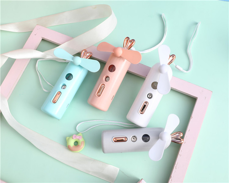 二档喷雾功能,带七彩夜灯。 内置充电池采用500mAh采用USB充电,充电3-4小时左右。可工作120分钟左右,手持携带方便,大风力夏日清凉必备。
