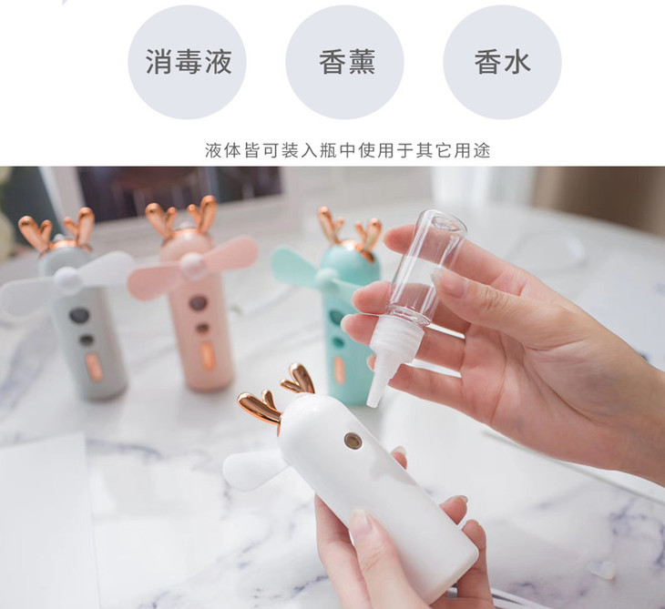 【产品备注】:自动喷雾功能,可喷牛奶,爽肤水,香水,保湿水等液体。三档小风扇,