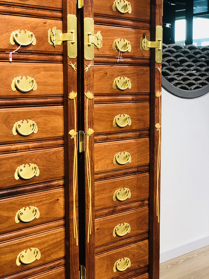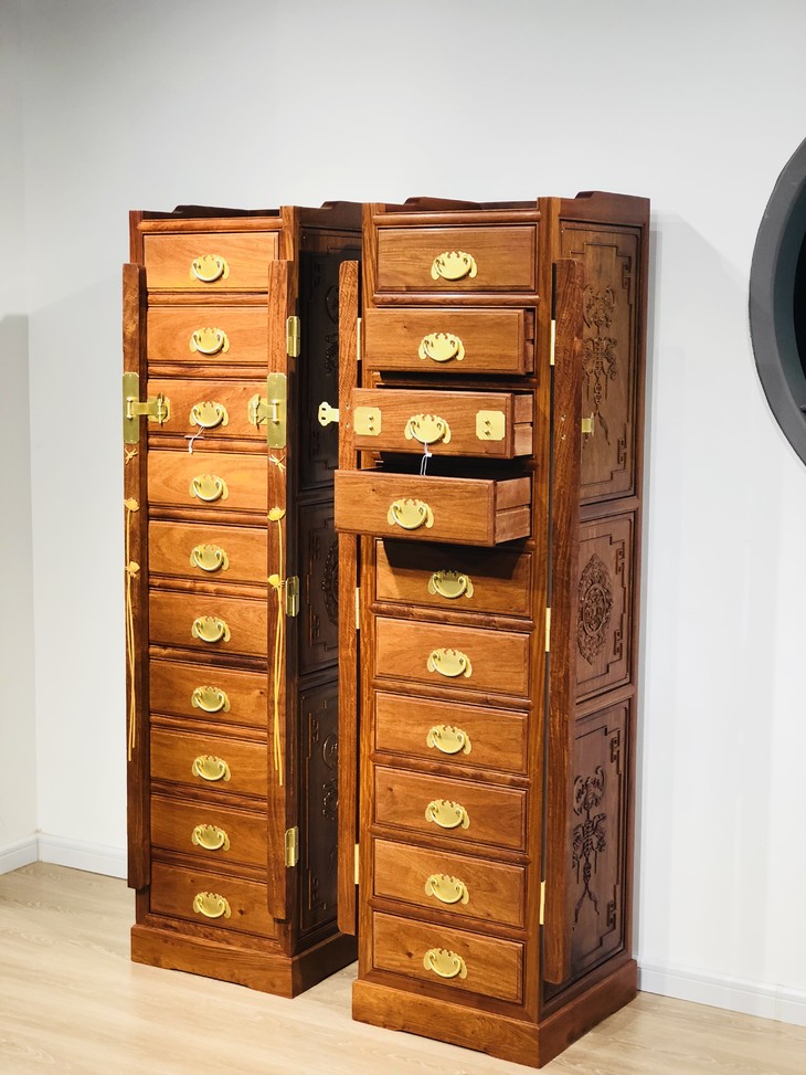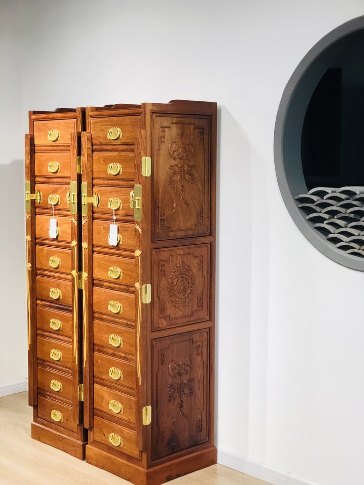 药柜,是一种抽屉柜,简单地说就是一个长方形的柜子,立起来从外表看均布满了抽屉,主要用于放置药品,储存东西等。