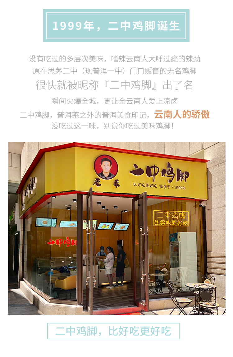- “二中鸡脚’’是云南普洱的苏建云&金建华夫妇于1999年在思茅二中(现普洱一中)门口售卖自家精心制作的私房鸡脚,因为美味独特让人食指大动而名声大噪,从而得名“二中鸡脚”(意为二中门口售卖的鸡脚)