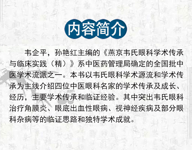 [旗舰店 现货]燕京韦氏眼科学术传承与临床实践 韦企平 孙艳红 主编 9787117260817 中医药 2018年3月参考书 人民卫生出版社