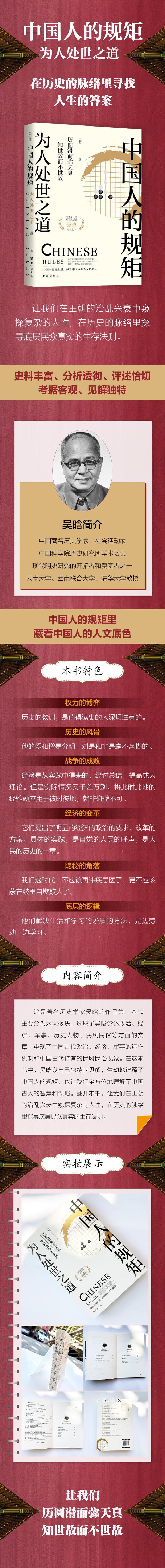 这是**历史学家吴晗的作品集。本书主要分为六大板块,选取了吴晗论述政治、经济、军事、历史人物、民风民俗等方面的文章,重现了中国古代政治、经济、军事的运作机制和中国古代特有的民风民俗现象。在这本书中,吴晗以自己独特的见解,生动地诠释了中国人的规矩,也让我们全方位地理解了中国古人的智慧和谋略。翻开本书,让我们在王朝的治乱兴衰中窥探复杂的人性,在历史的脉络里探寻底层民众真实的生存法则。