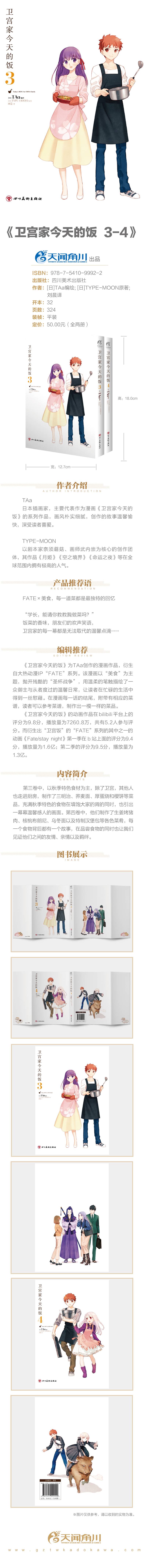 第三卷中,以秋季特色食材为主,除了卫宫,其他人也走进厨房,制作了三明治、荞麦面、厚蛋烧和樱饼等菜品,充满秋季特色的食物在填饱大家的胃的同时,也引出一幕幕温馨感人的画面。第四卷中,他们制作了生姜烤猪肉、核桃布朗尼、乌冬面以及特制汉堡包等各色菜肴,每一个食物背后都有一个故事,在品尝食物的同时也让我们见证他们之间的友情、亲情以及羁绊。