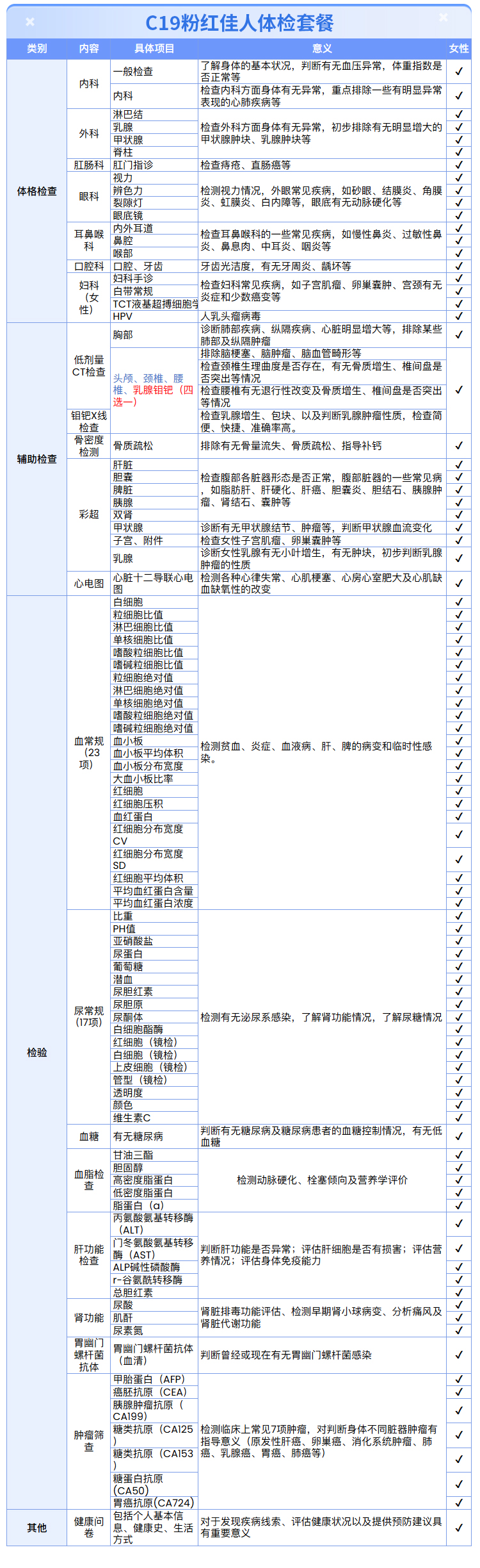 【女性 | 粉红佳人】含HPV/TCT+部位CT/乳腺钼靶(4选1)+子宫/乳腺彩超+七项肿瘤标志物 C19