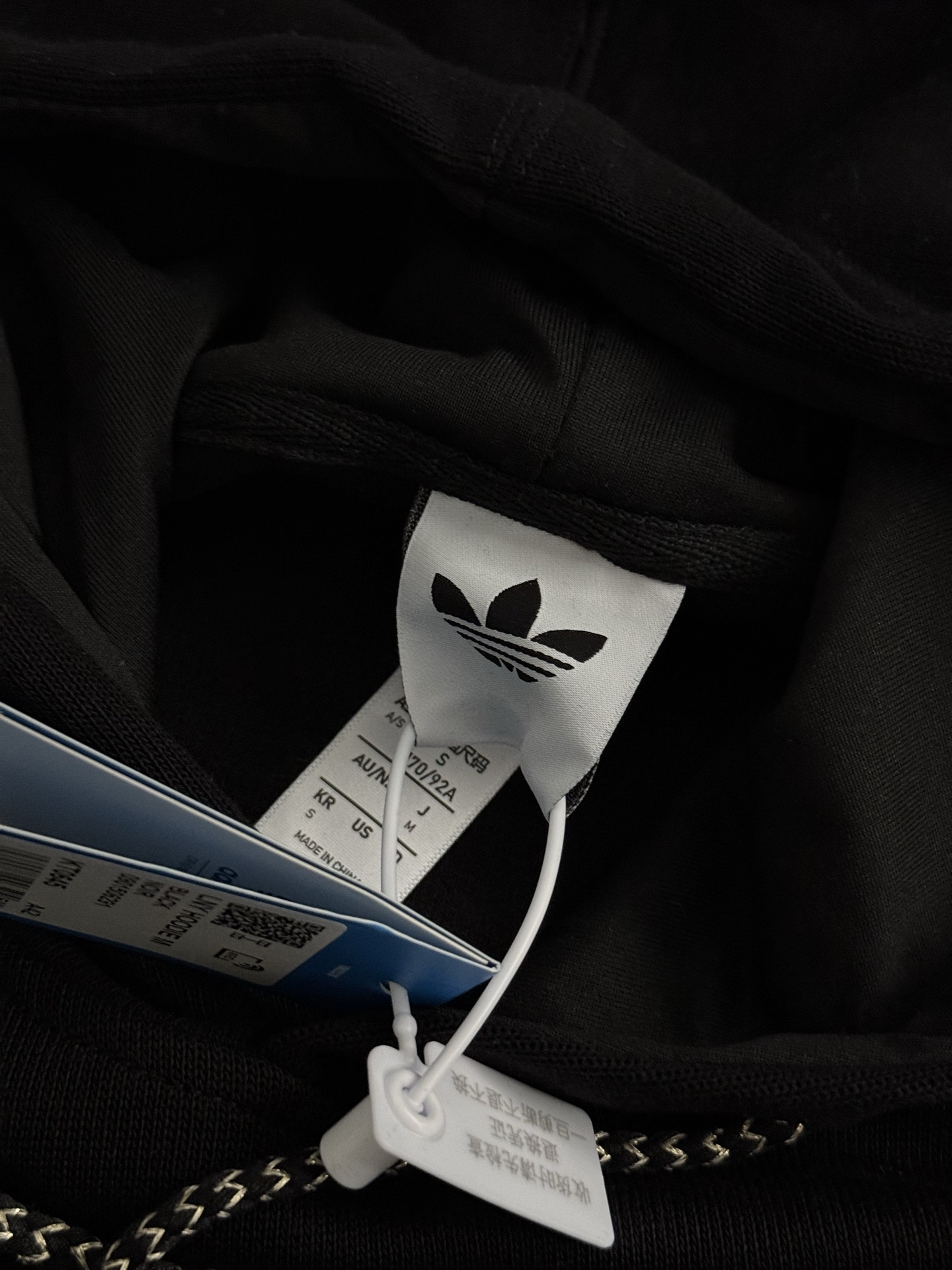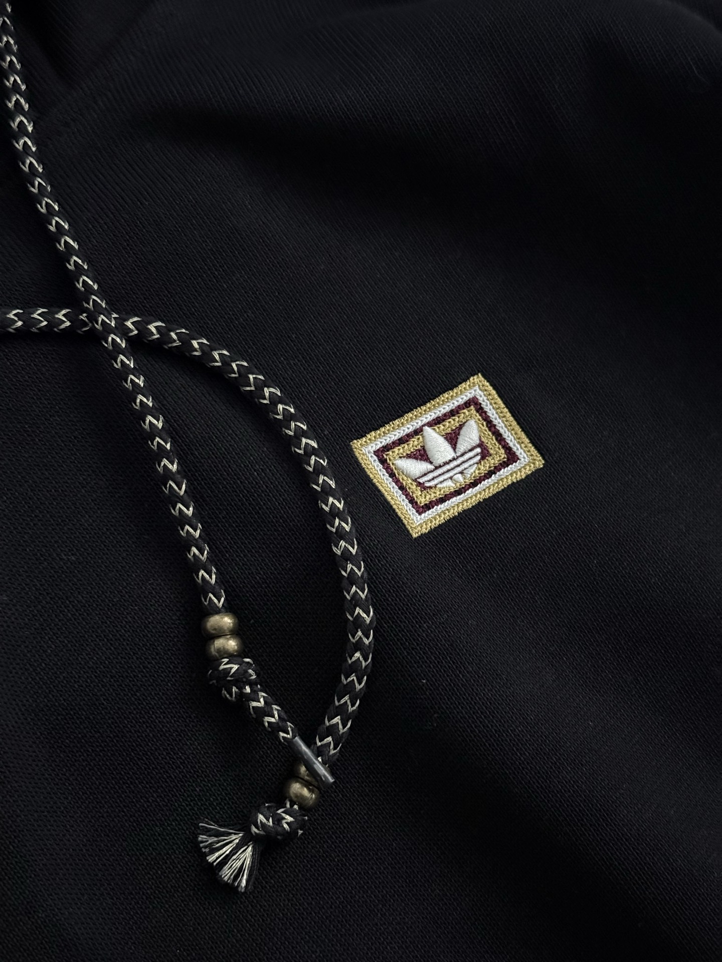 抽绳也融入了中国元素,金色线点缀编织的帽子抽绳,加入了金属元素装饰。