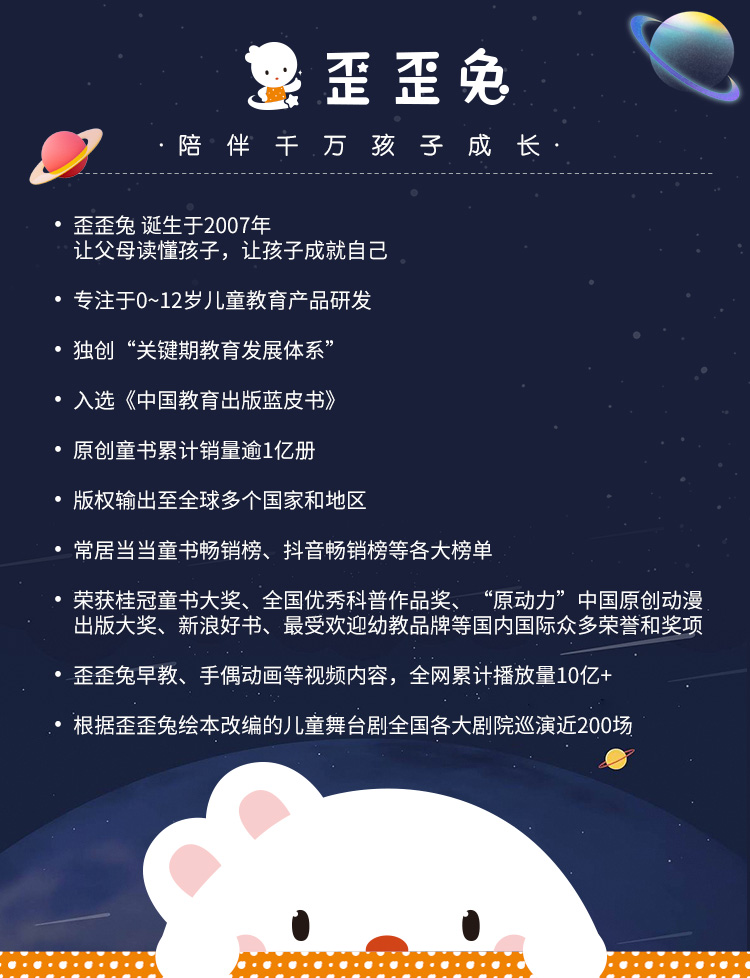 - 歪歪兔,诞生于2007年,专注0-12岁儿童教育产品研发。原创童书销量逾1亿册,音视频播放总量10亿+。