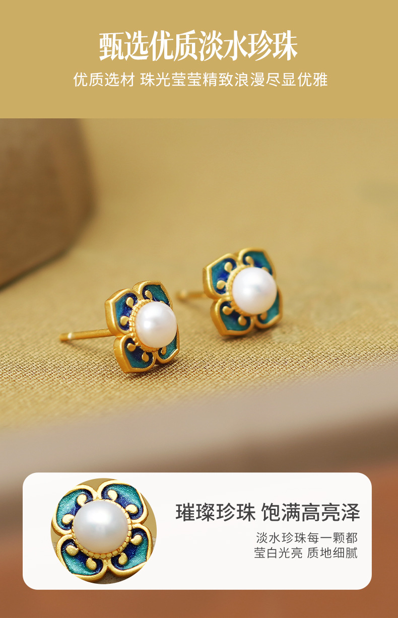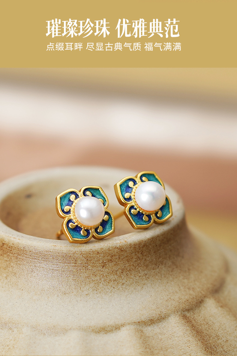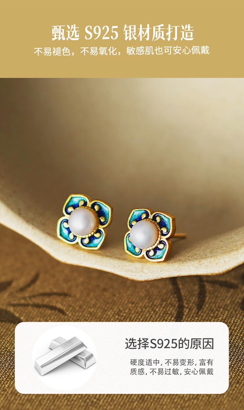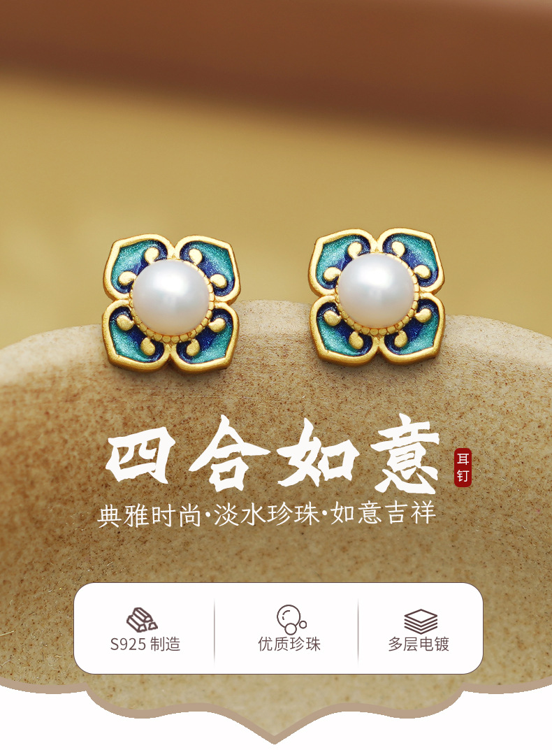 四合如意淡水珍珠耳钉S925纯银新中式国风珐琅耳饰品DQ11648E