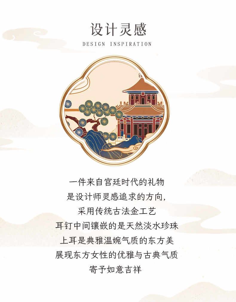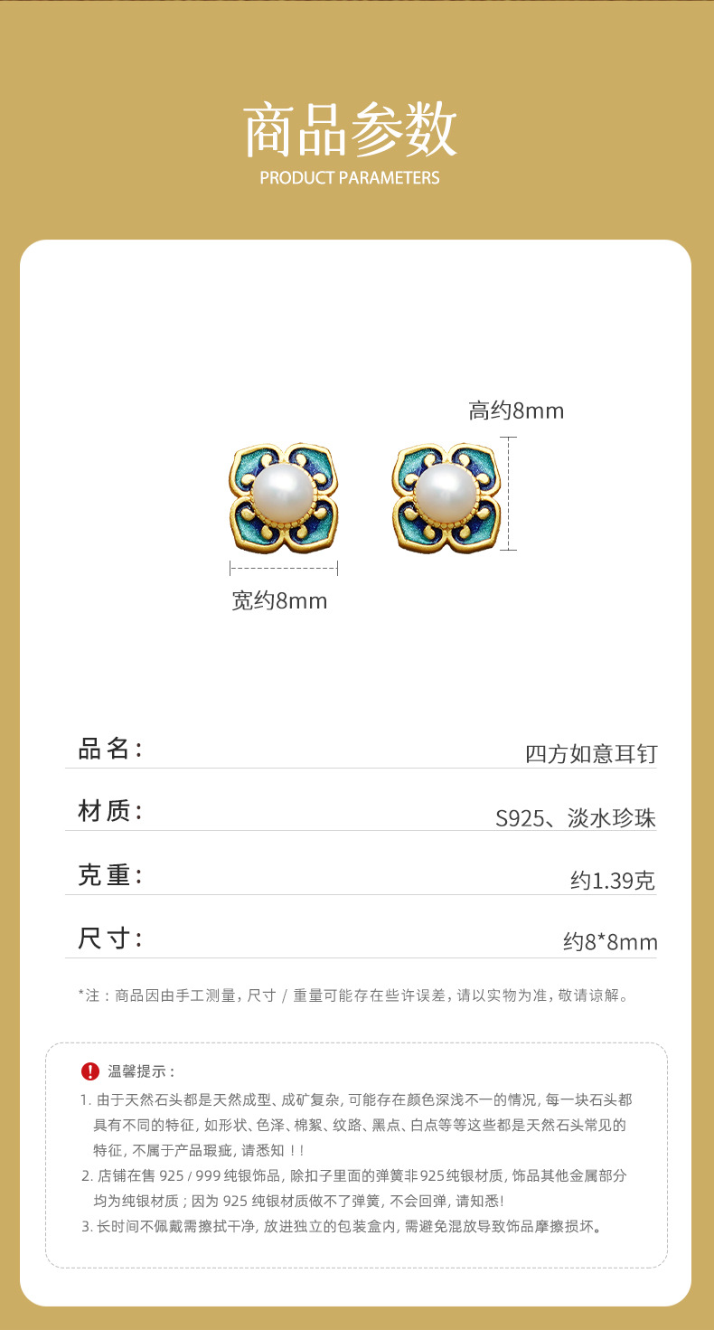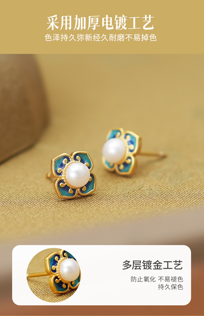 四合如意淡水珍珠耳钉S925纯银新中式国风珐琅耳饰品DQ11648E