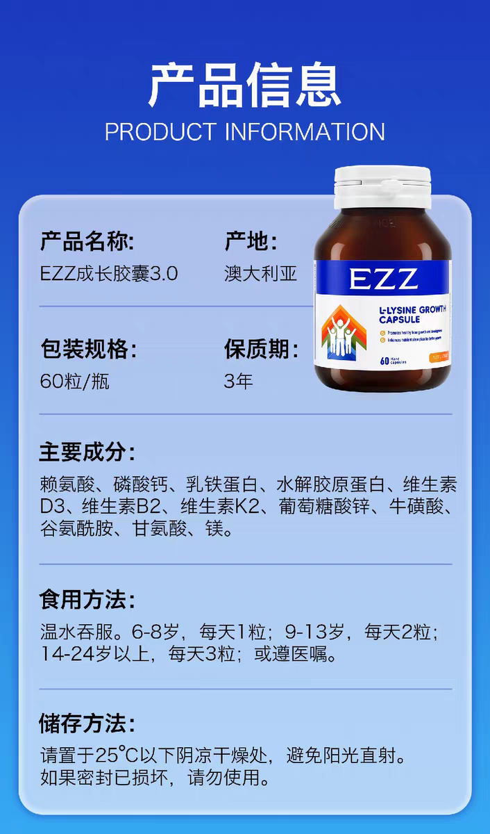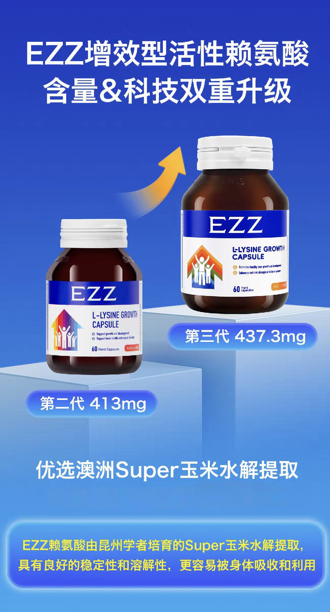 【跨境】澳洲EZZ3.0赖氨酸钙镁锌胶囊 增效 60粒/瓶 6岁以上儿童及成年人