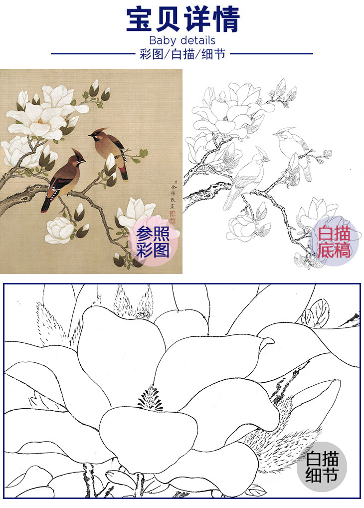 竖幅工笔花鸟白描底稿-俞致贞《锦葵》-多种白描尺寸可选-GV08