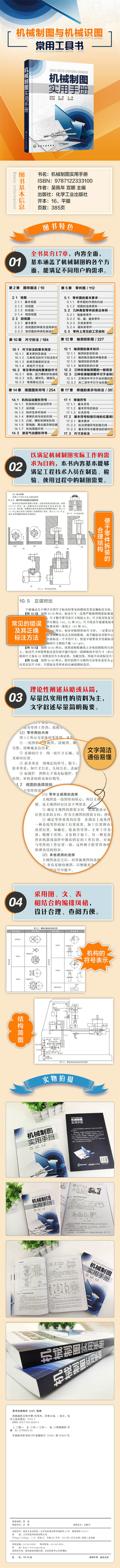 本手册以满足机械制图实际工作的需求为目的,全面介绍了机械工程图的画法和识读方法。主要内容包括:技术制图与机械制图国家标准基本规定、图样画法、标准件、常用件、零件图、装配图、零件的表面结构、极限与配合、几何公差、尺寸标注、交线及过渡线、轴测投影图、工程曲面及展开图、简图图形符号、管路系统和电气系统图形符号、几何作图、焊缝的表示与标注。