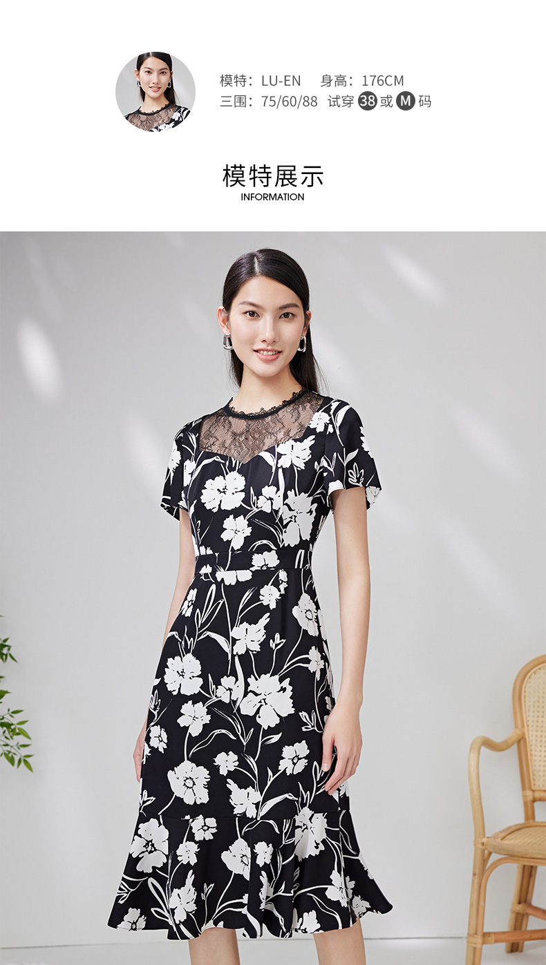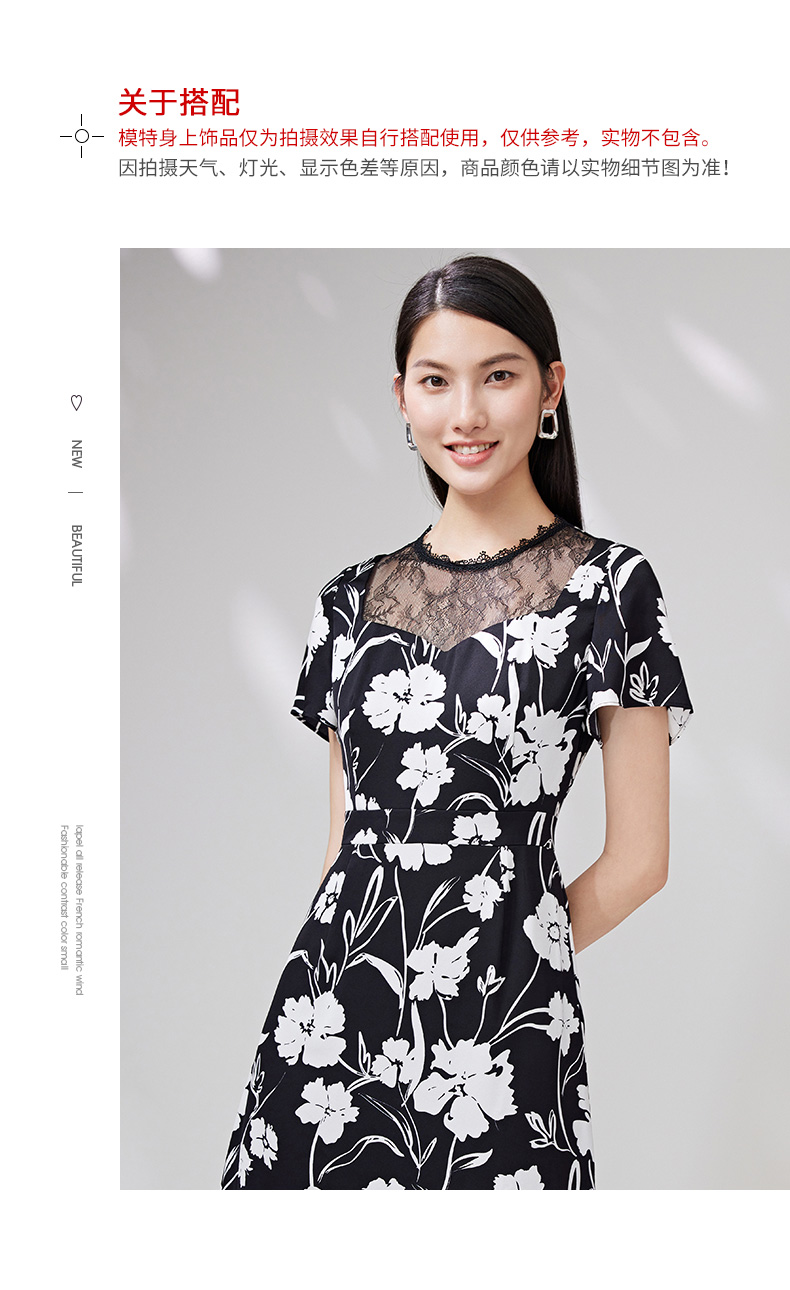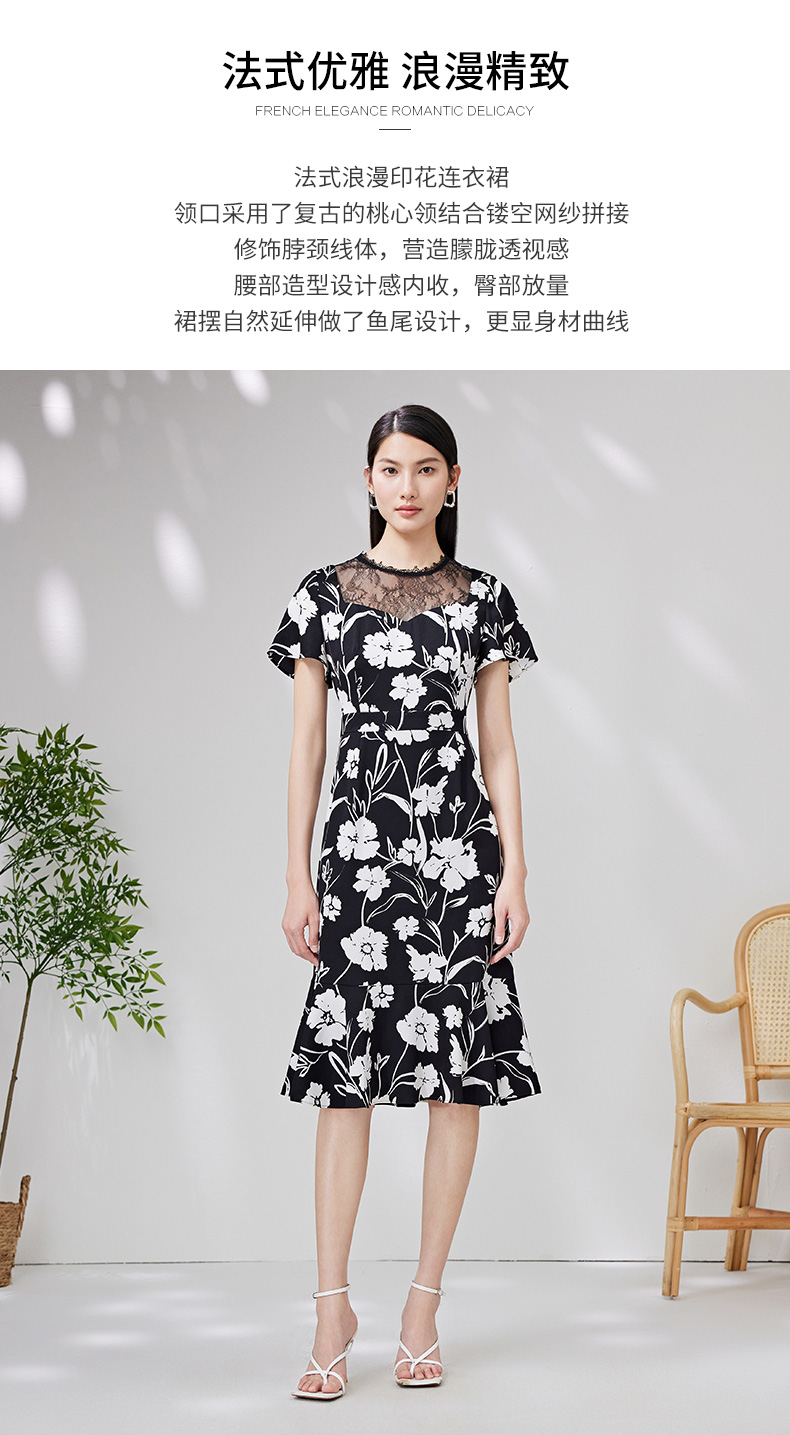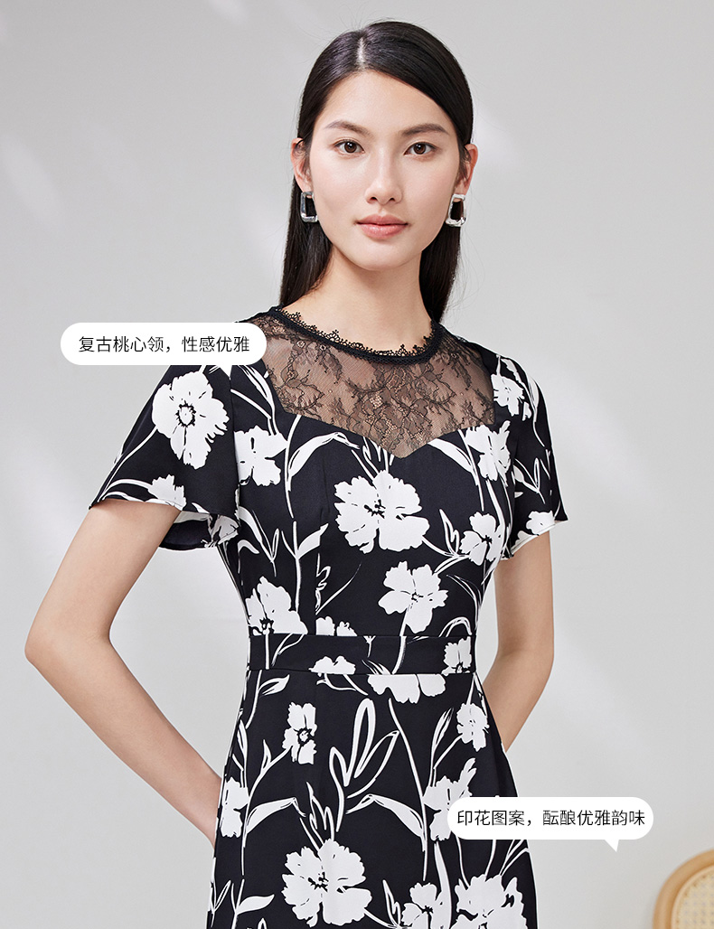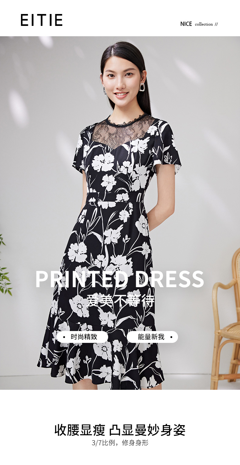 EITIE爱特爱夏季新款修身显瘦优雅蕾丝拼接领印花连衣裙7007713