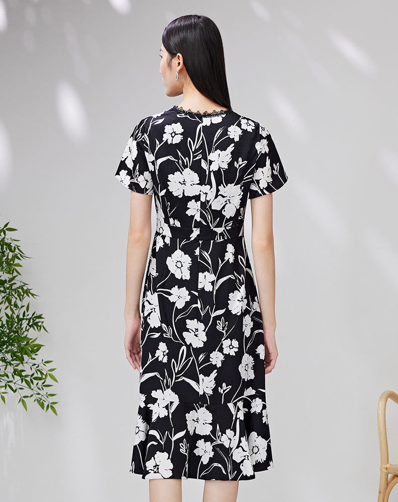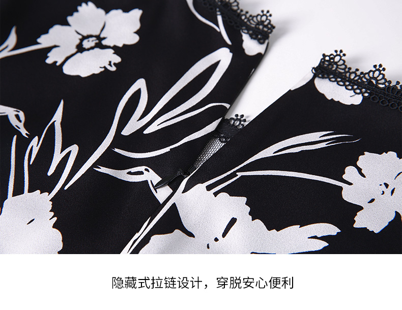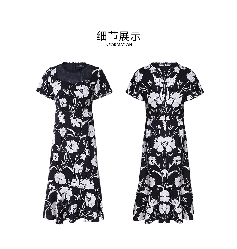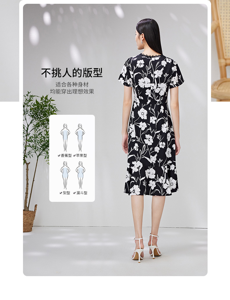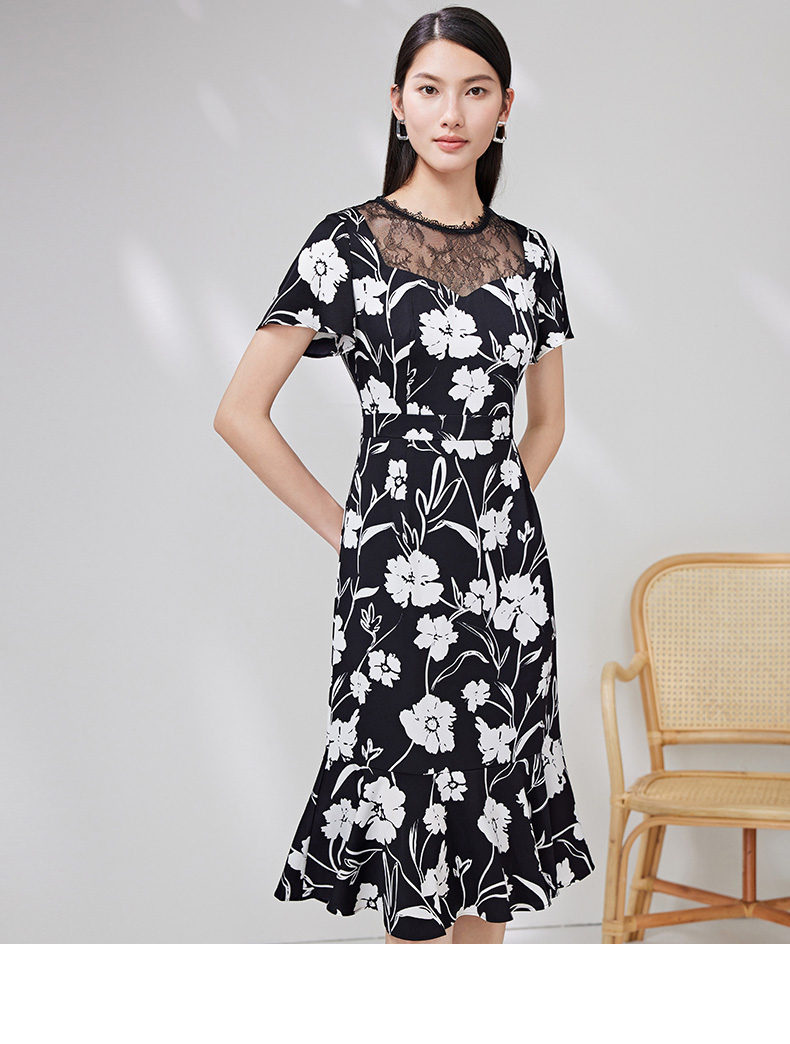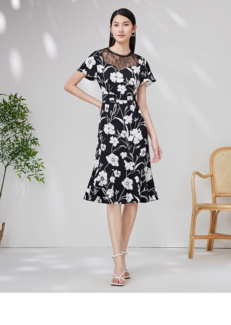 EITIE爱特爱夏季新款修身显瘦优雅蕾丝拼接领印花连衣裙7007713