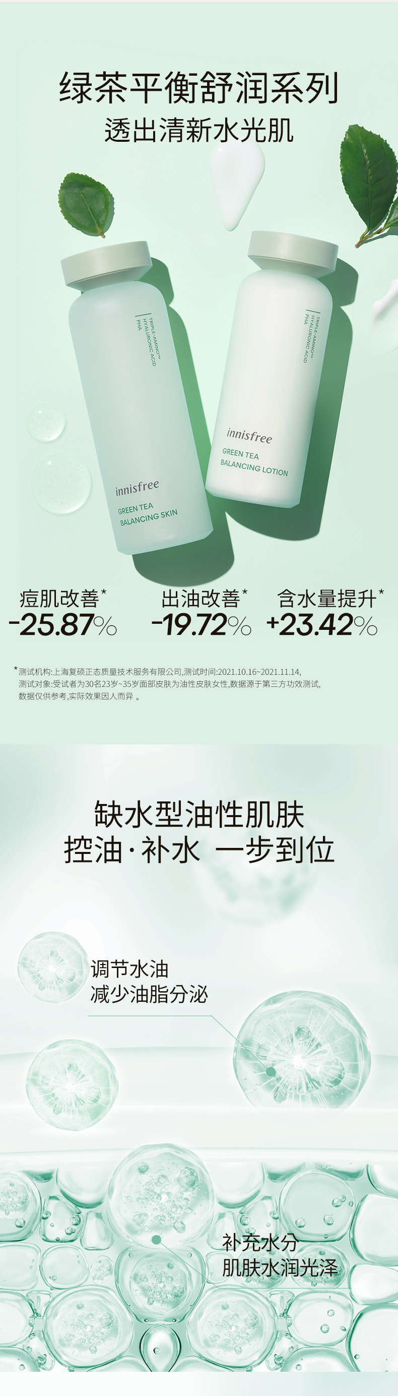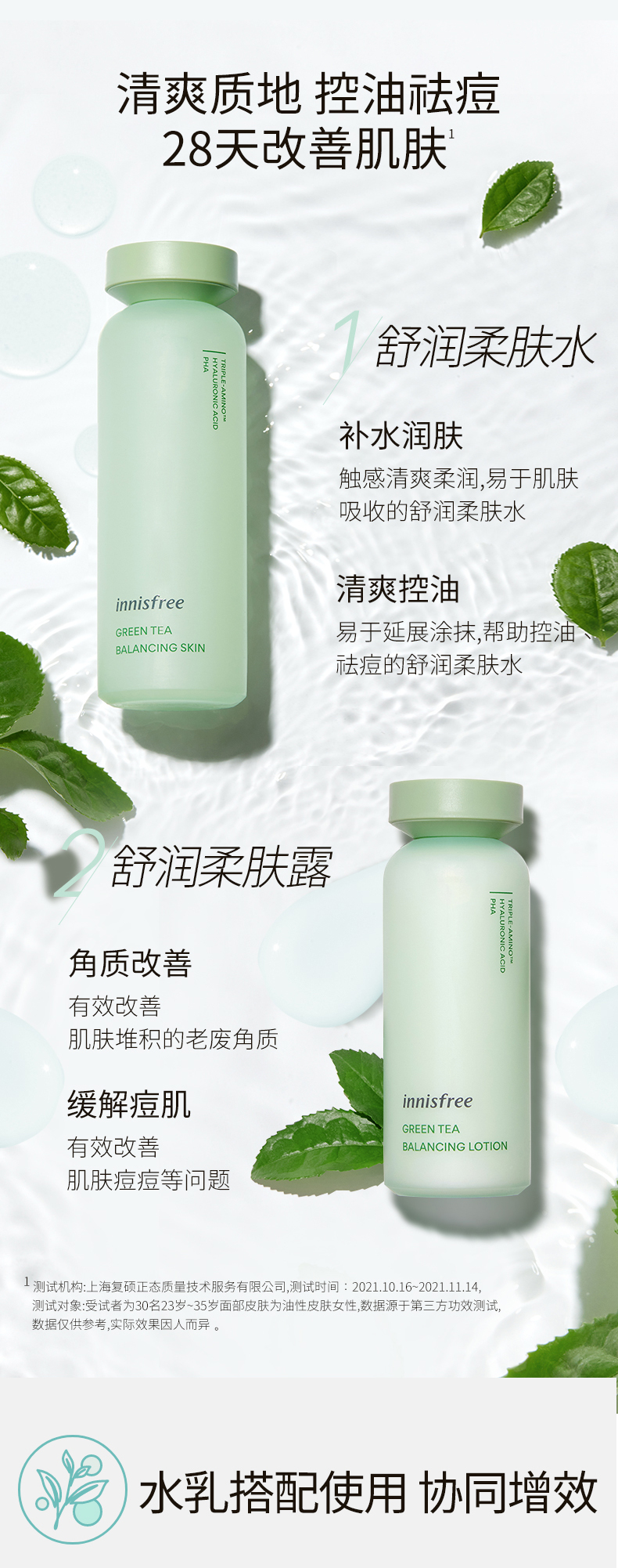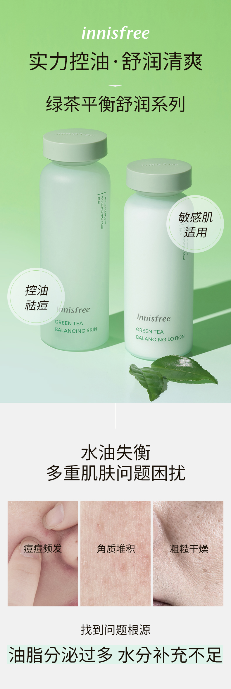 韩国悦诗风吟(Innisfree)绿茶平衡水乳套装(200ml+160ml+柔肤水15ml+柔肤露15ml+面霜10ml)