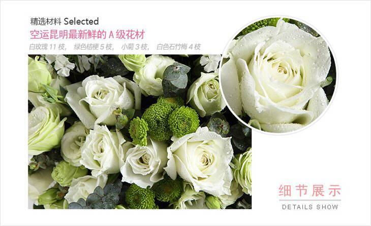 花材/白色玫瑰 绿色桔梗 小菊 白色石竹梅。搭配适量尤加利