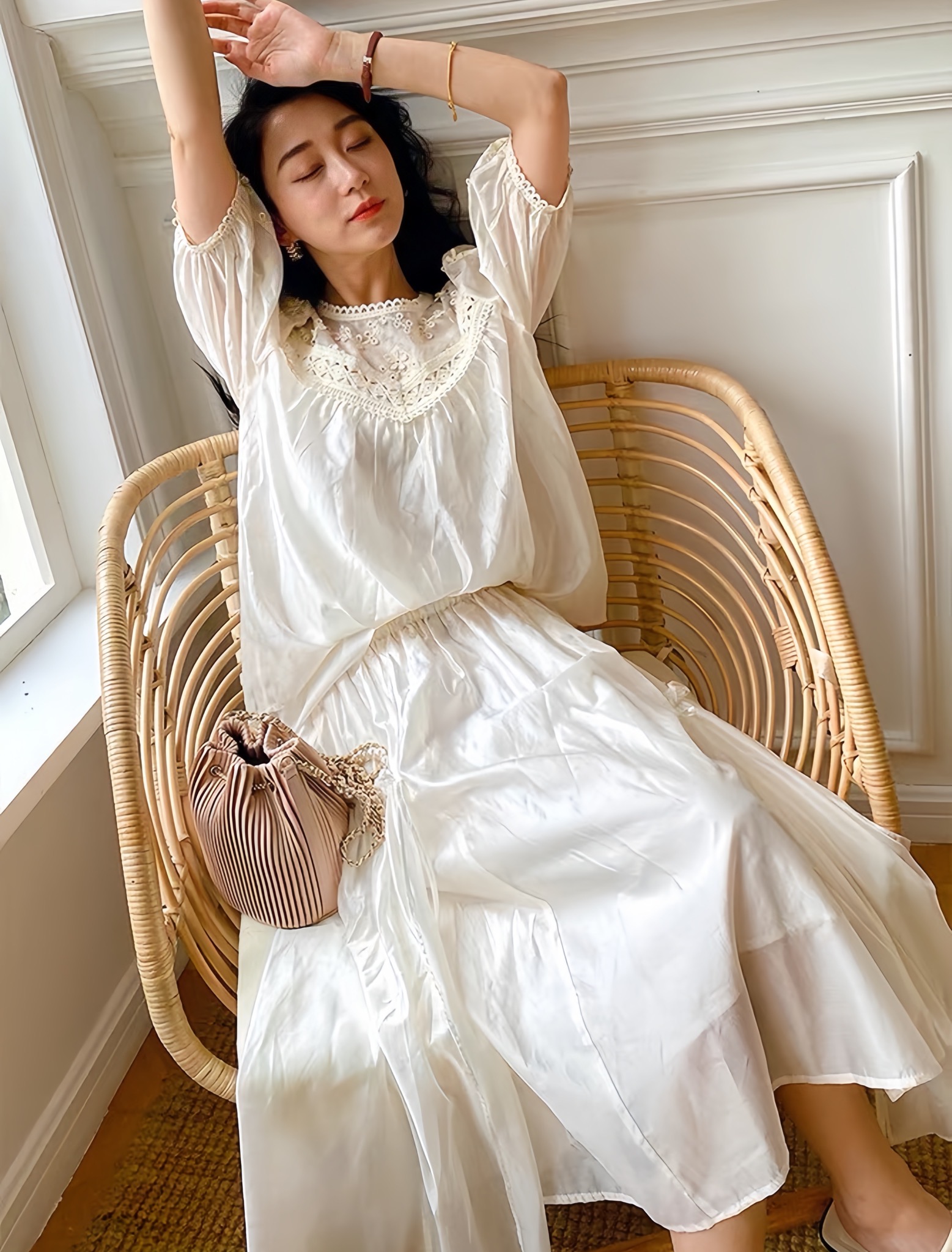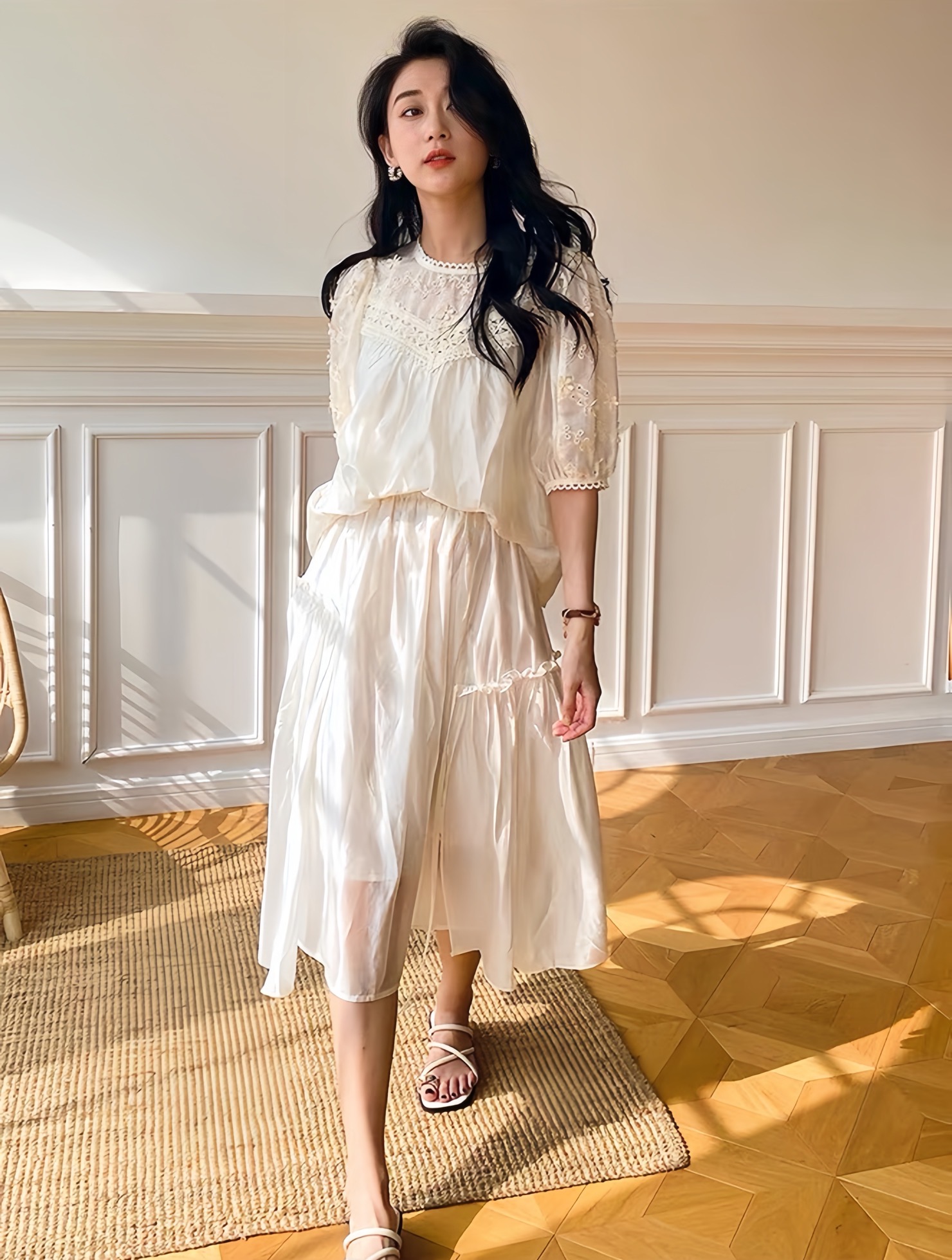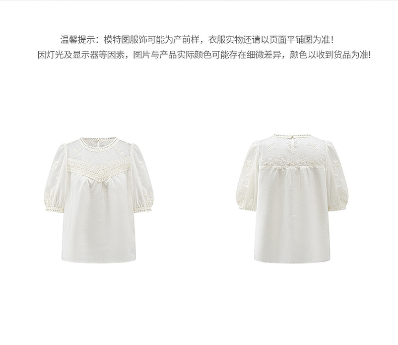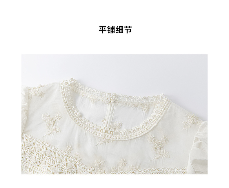 天猫同步【莱赛尔+重工刺绣】拉夏贝尔/La Chapelle花边圆领绣花短袖小衫上衣衬衫2025年新款