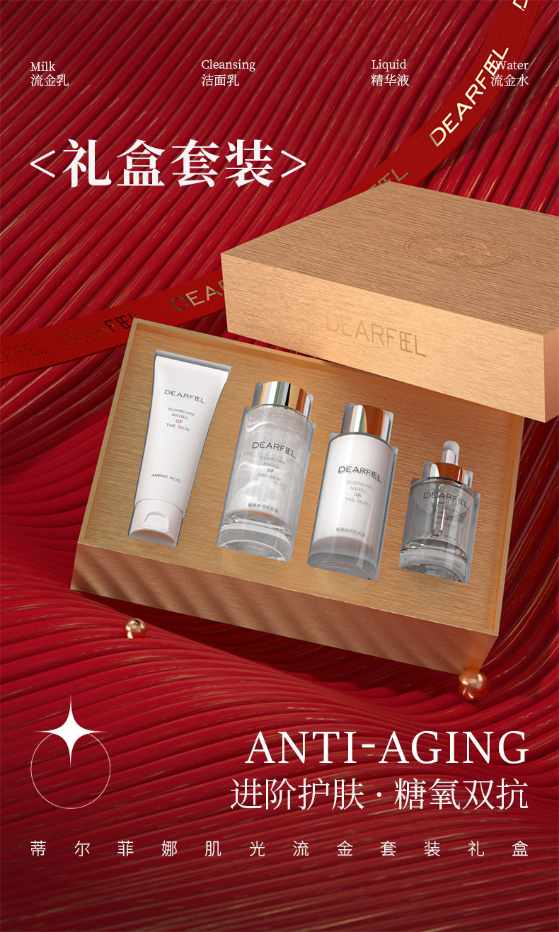 【淡斑美白热卖】英国蒂尔菲娜肌光流金4件套(氨基酸洁面120g+120ml流金水+100ml流金乳液+50ml流金精华)