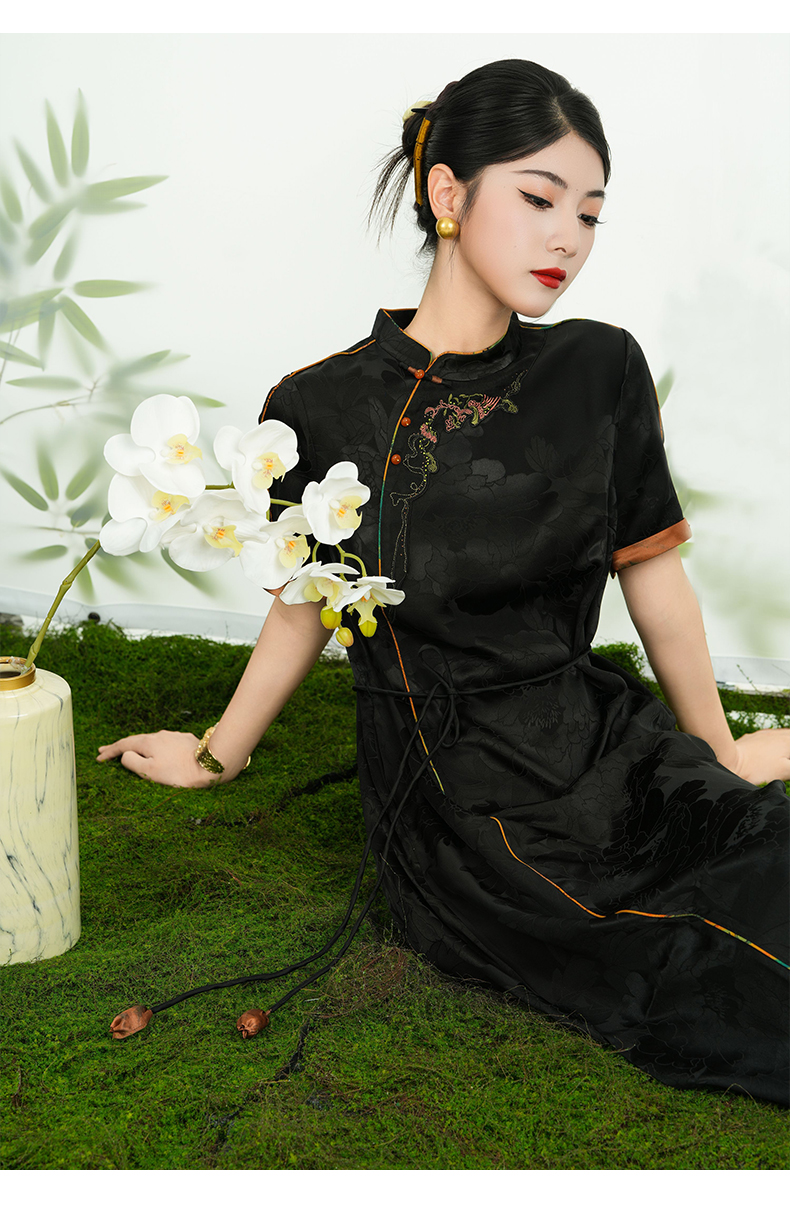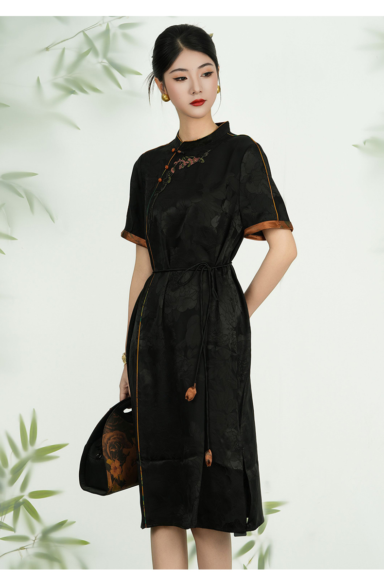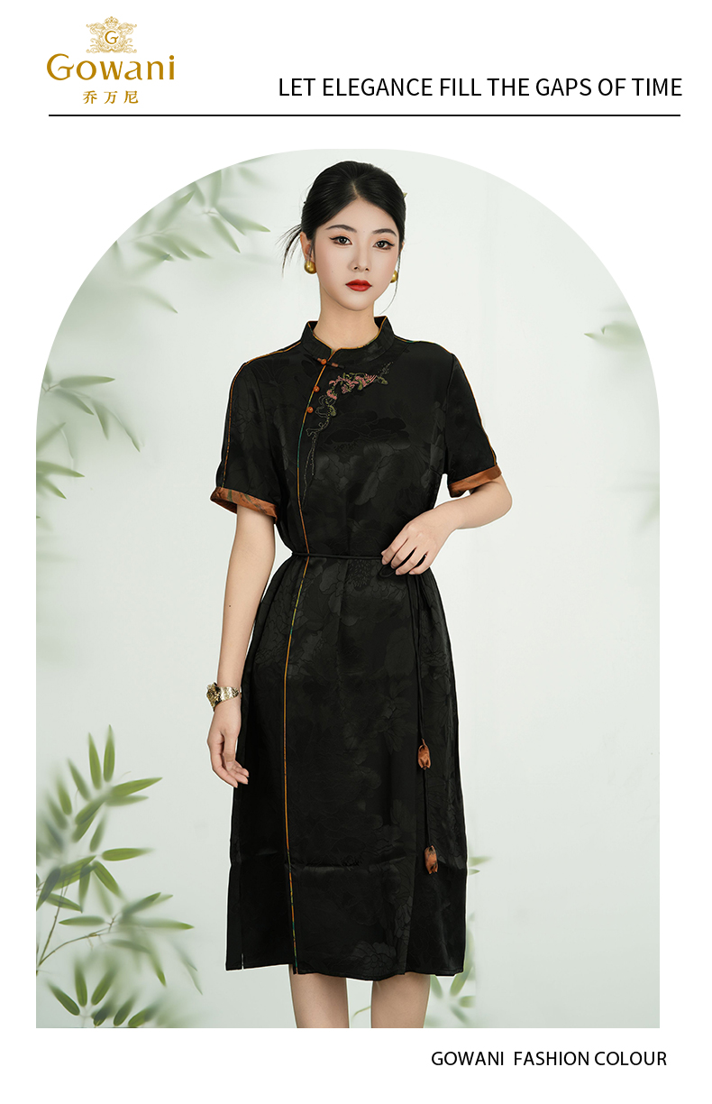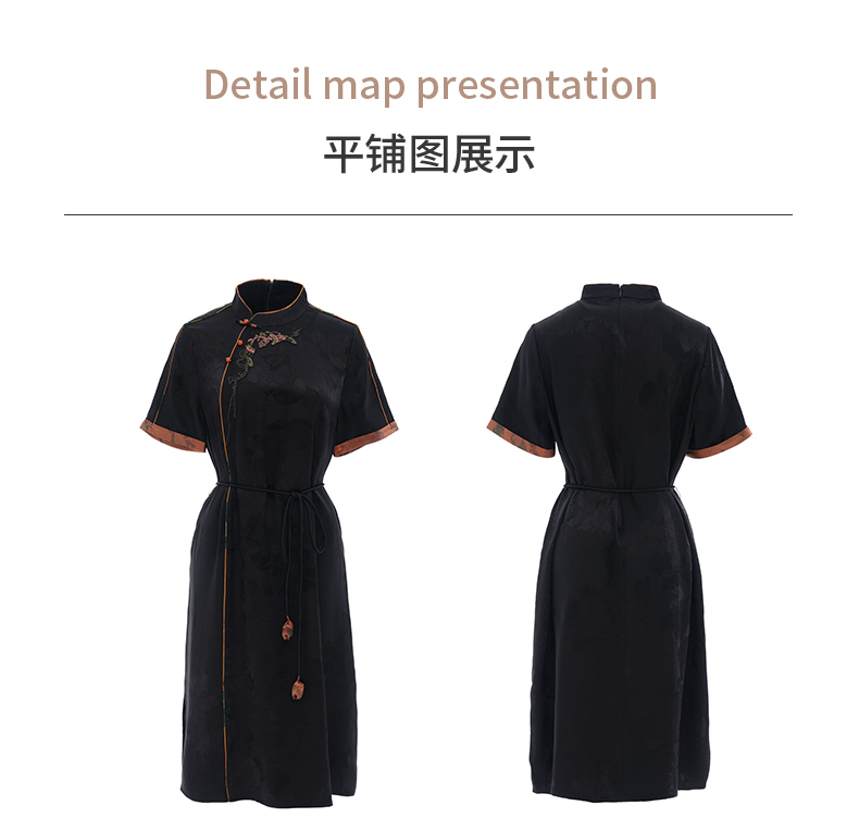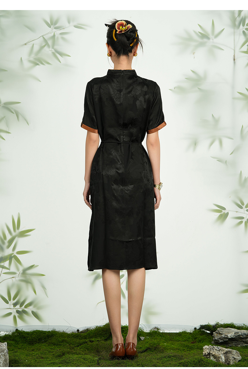 【香云纱】乔万尼新品撞色设计29mm新中式香云纱真丝收腰连衣裙ED2E497
