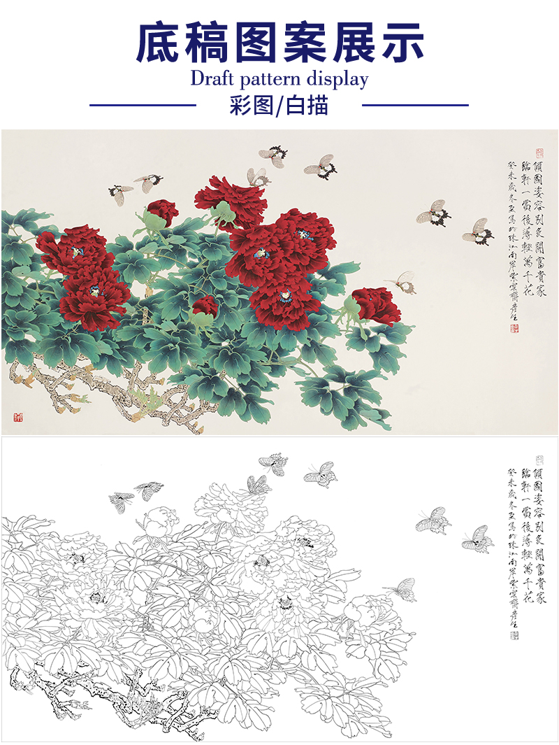 周彦生花鸟工笔画白描底稿《牡丹》临摹勾线高清打印稿A655