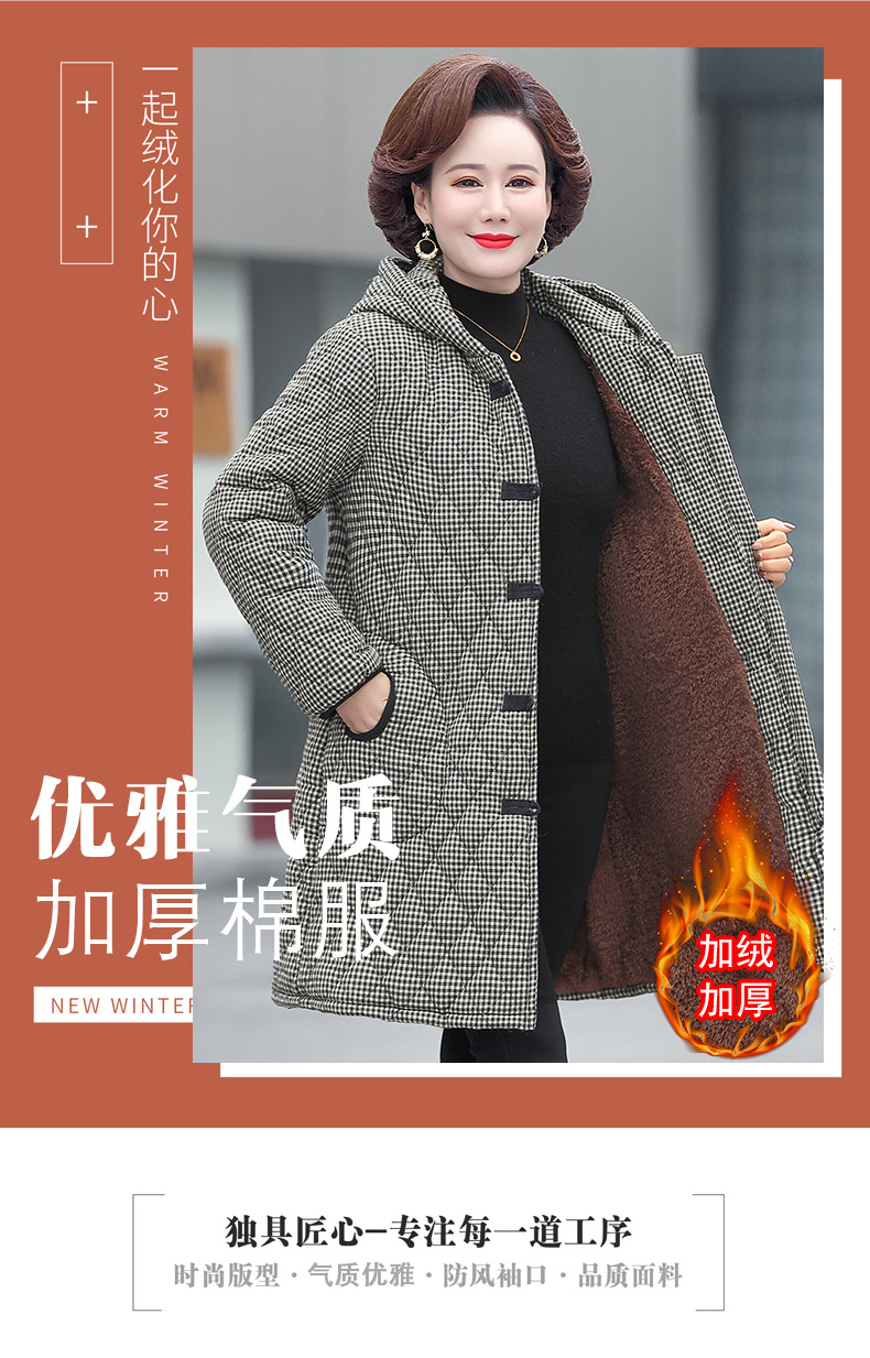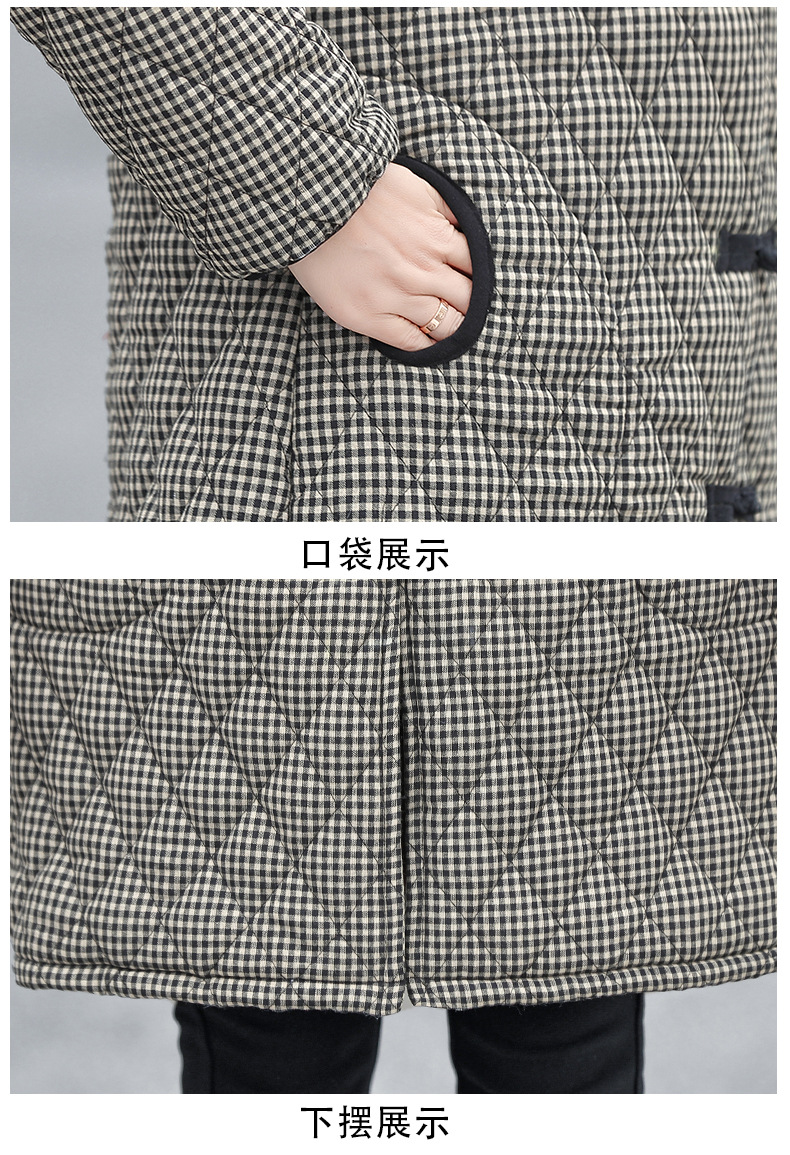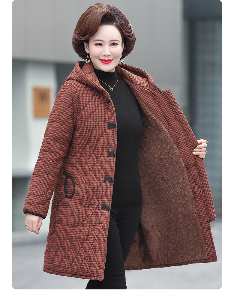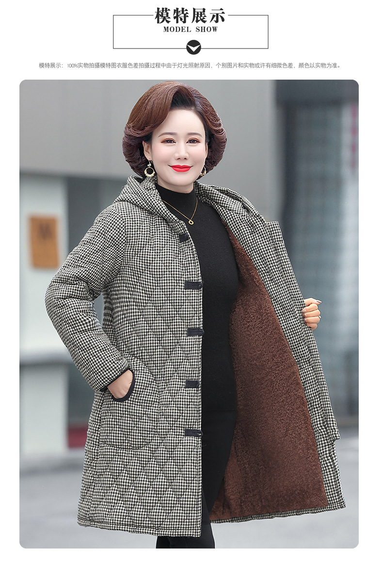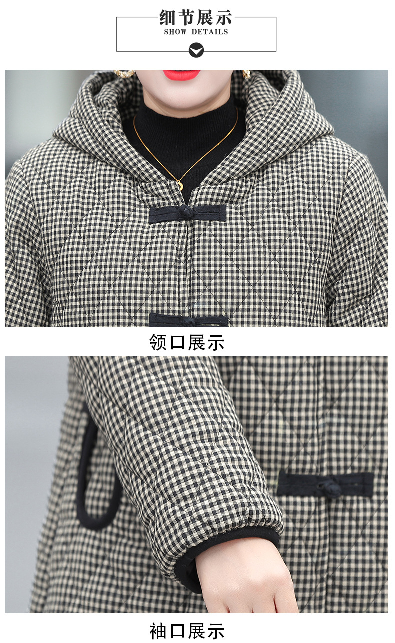 YCE A322-105 加绒加厚棉衣中年女冬装中长款格子棉袄中老年盘扣连帽棉服