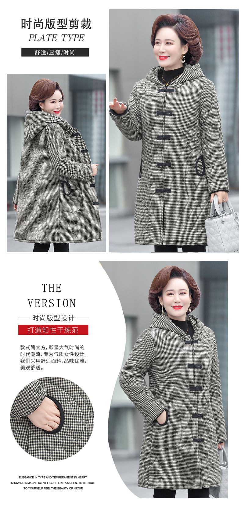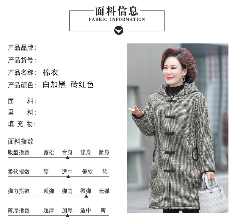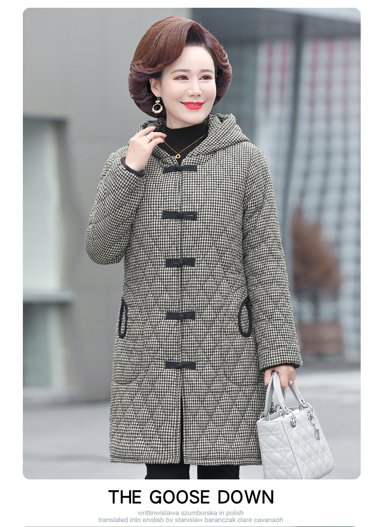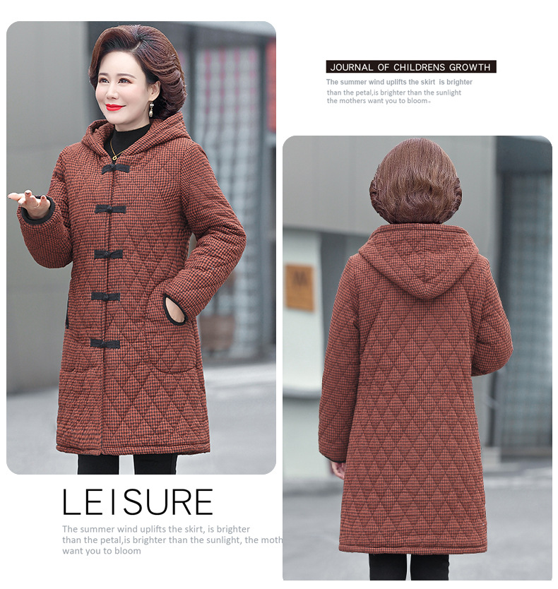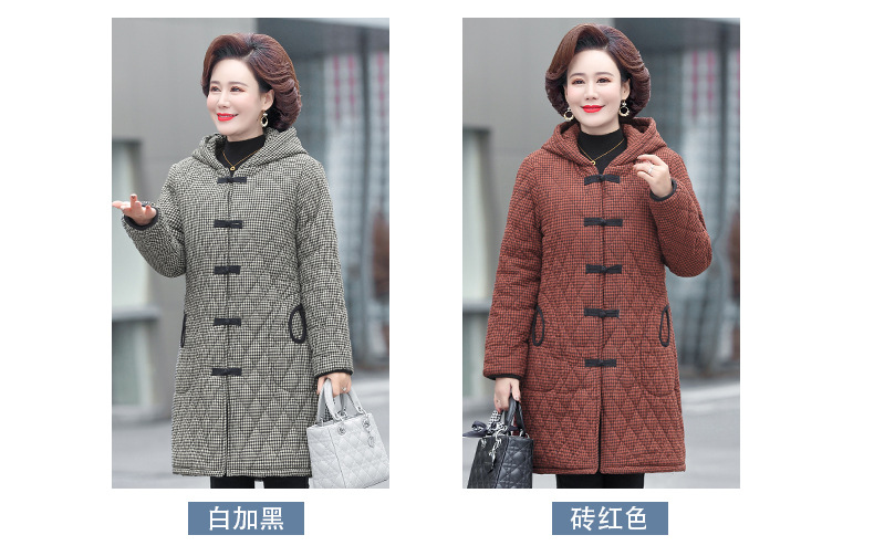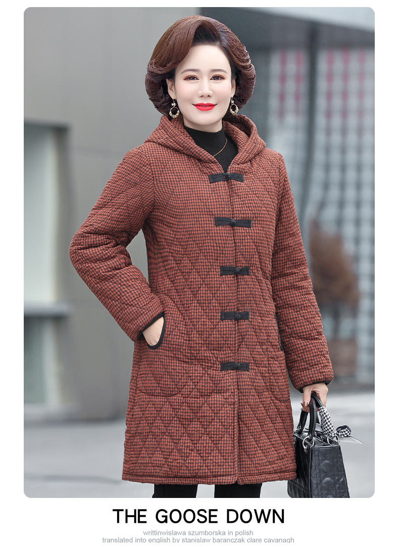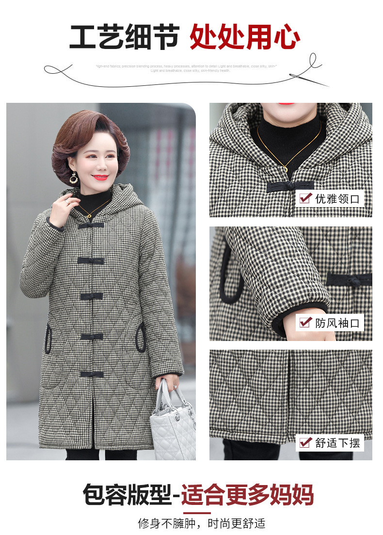 YCE A322-105 加绒加厚棉衣中年女冬装中长款格子棉袄中老年盘扣连帽棉服