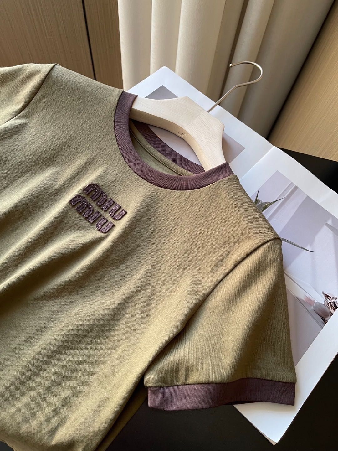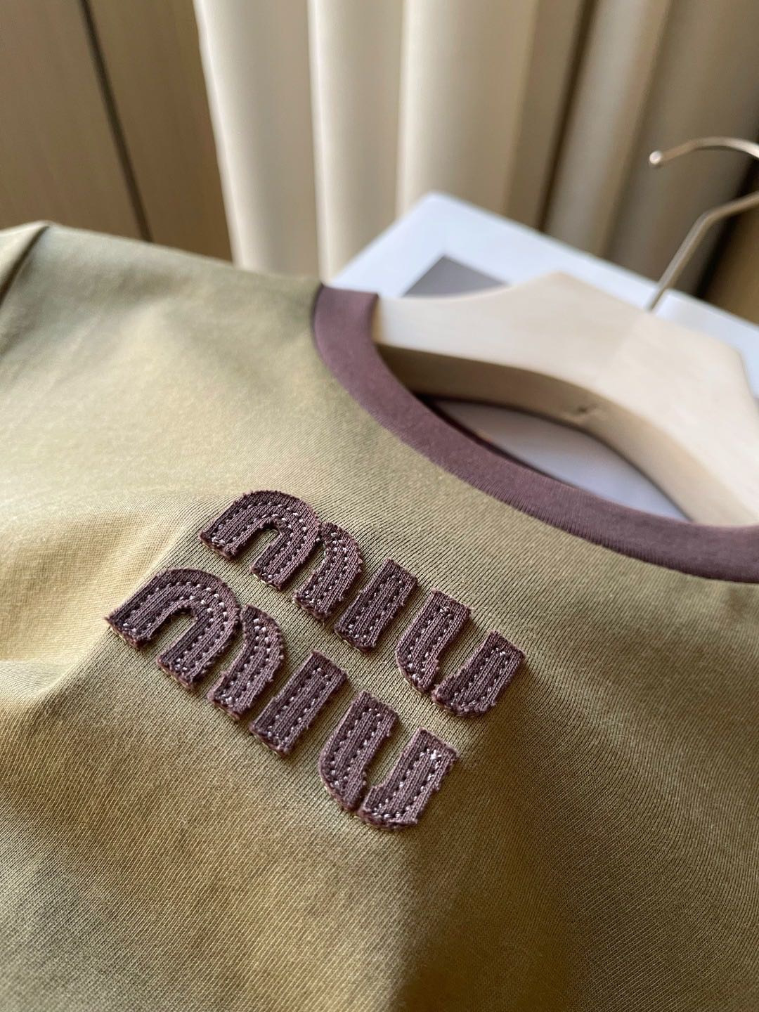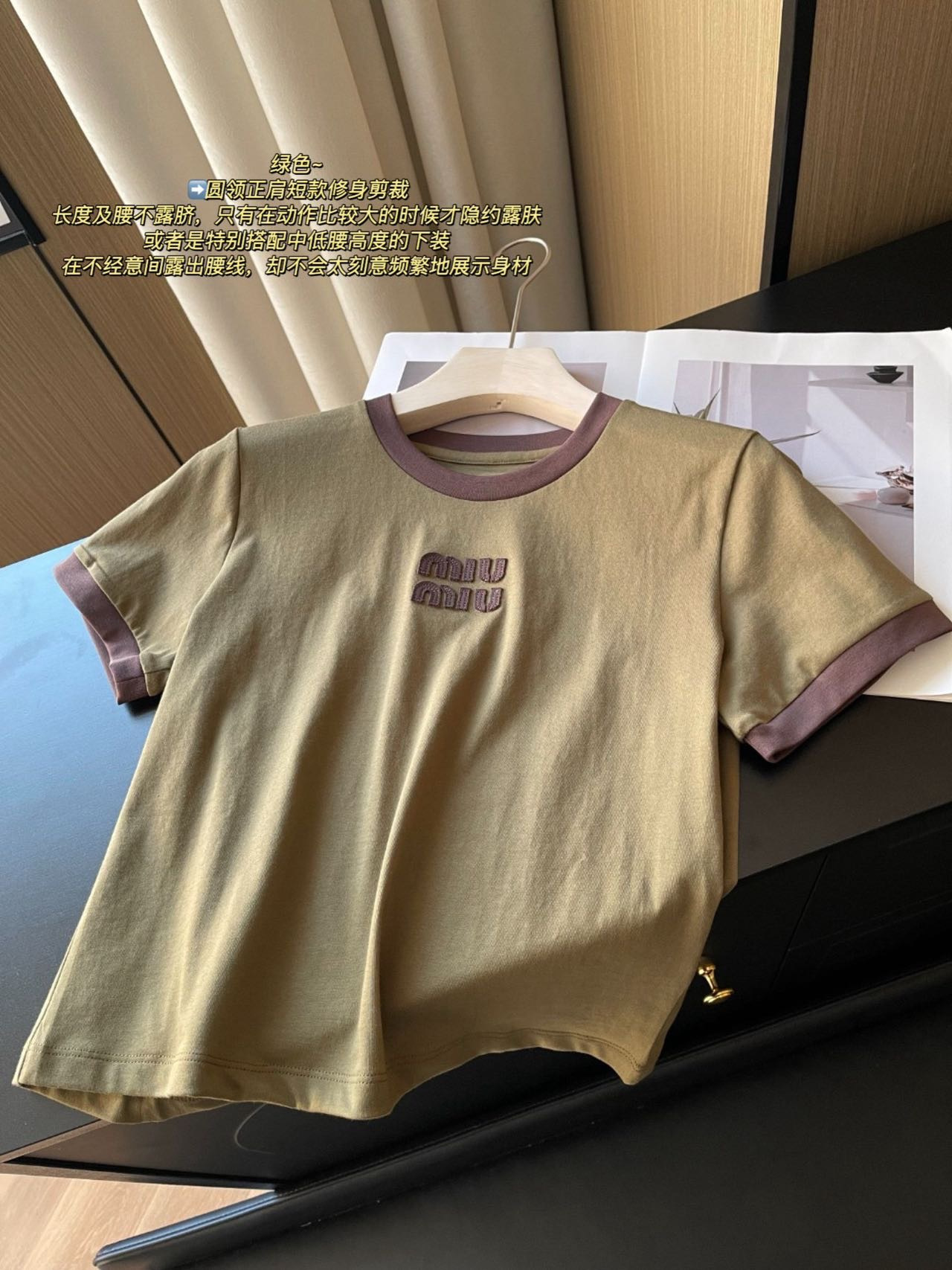 79 货号065233079 ye 撞色领橄榄绿短袖 这个款很修身,很辣妹,好特别的绿色!!甜酷辣妹❤️🔥浅miu一下咯😋松弛而自信miu式辣妹早已是next level