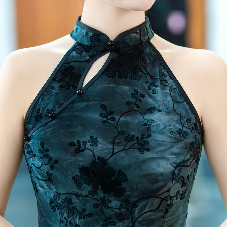 挂脖植绒扎染单层无袖长款旗袍ZA1904